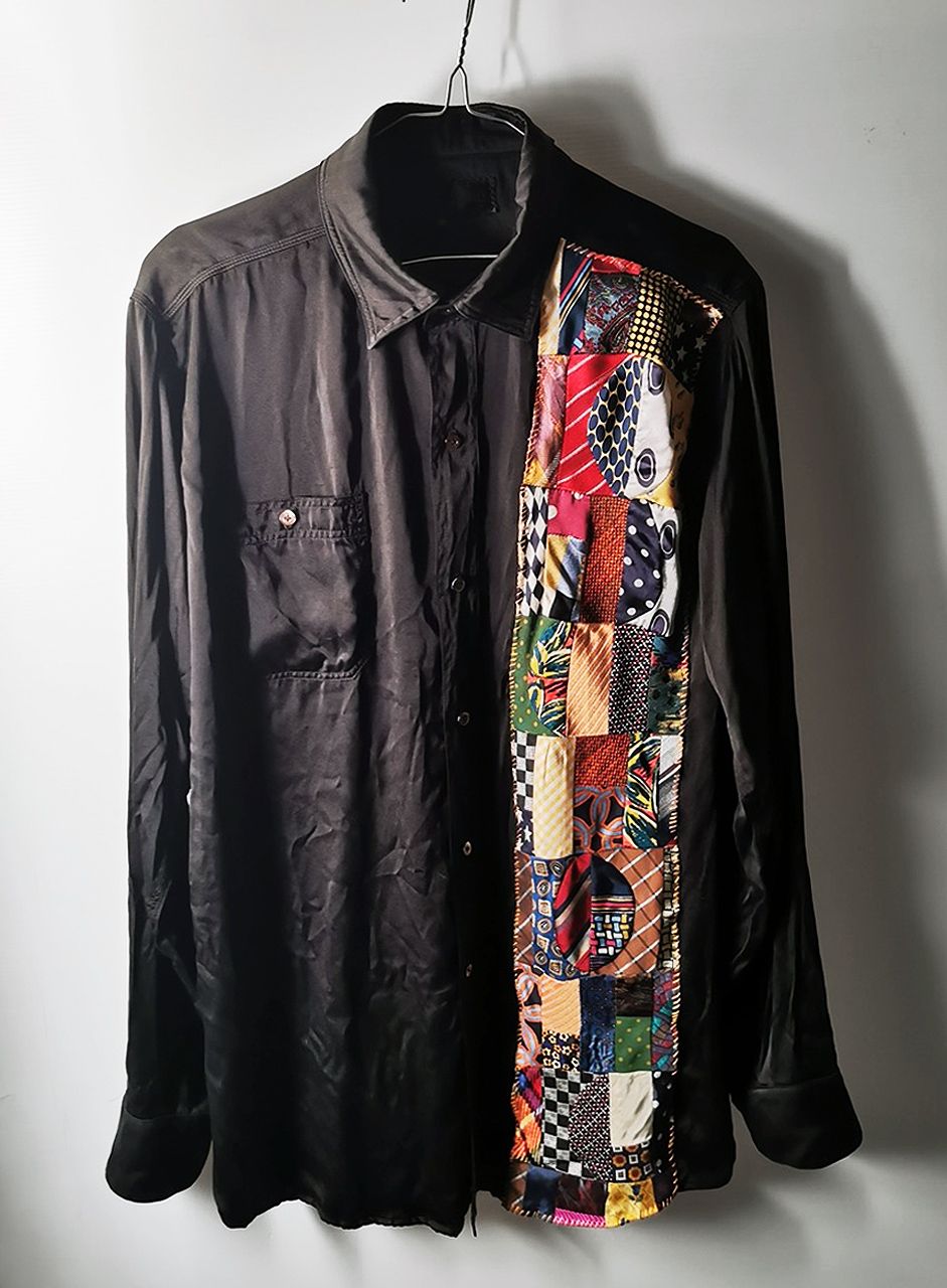 Handmade super limited edition special archive 1940's American western triple-stitch shirt design hand dyed pure Como Silk 16 momme raso satin with real handcut vintage silk patchworks, extensive hand stitch detail work in pure cotton embroidery threads, silk handmade buttonholes and Lanzanova real mother-of-pearl shirt button designs. Number produced in the world: 1