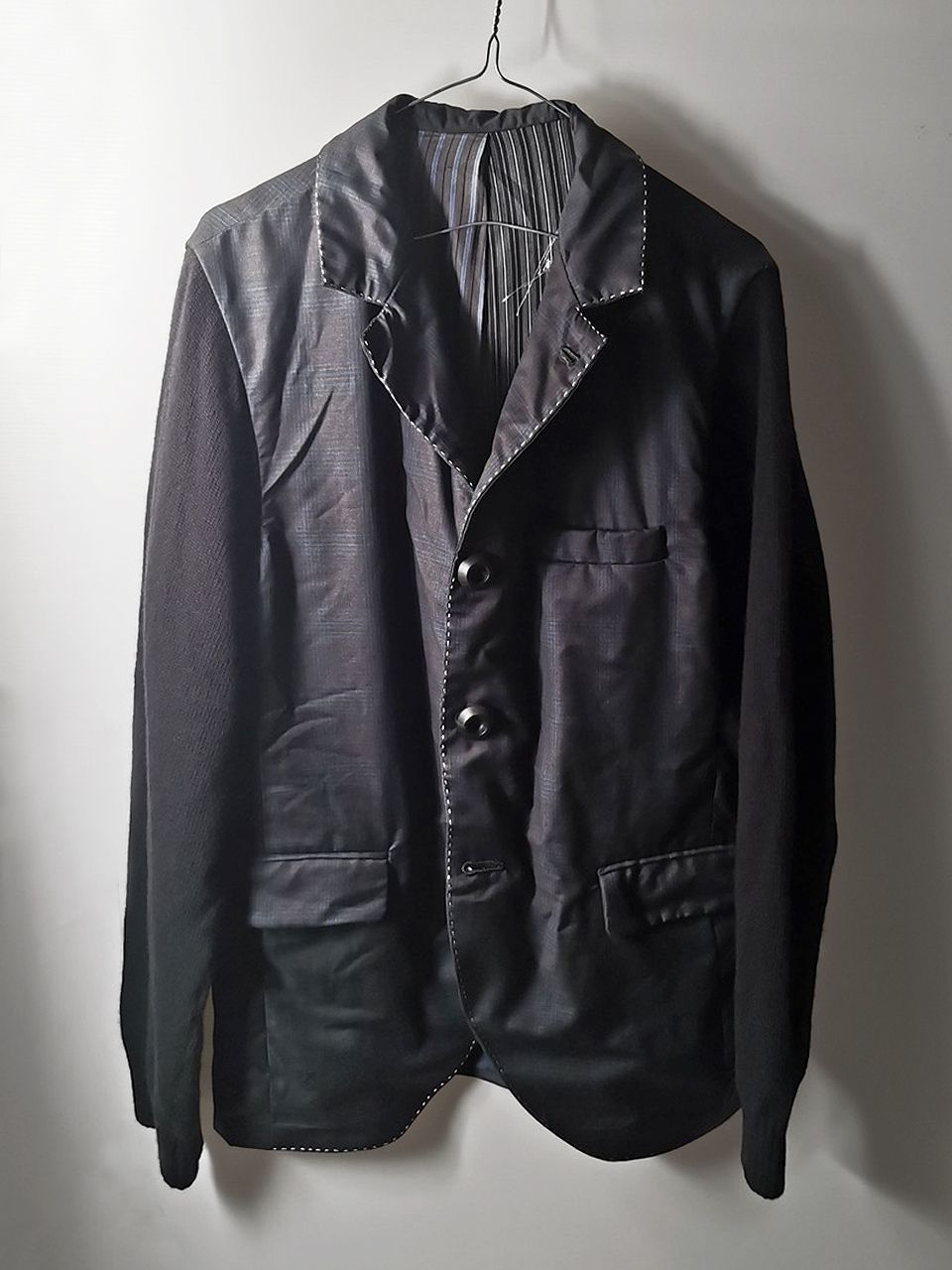Handmade super limited edition special jacket Biella Super 160's pure luxury wool plaid suiting cloth with special patchwork lining story of Tessitura Mauri jacquard striped viscose and cotton, hand made pure wool extrafine Pratese Merino sweater sleeves, handpadstitched canvas fronts, silk handstitched buttonholes and remarkable real horn Fontana button designs. Number produced in the world: 4