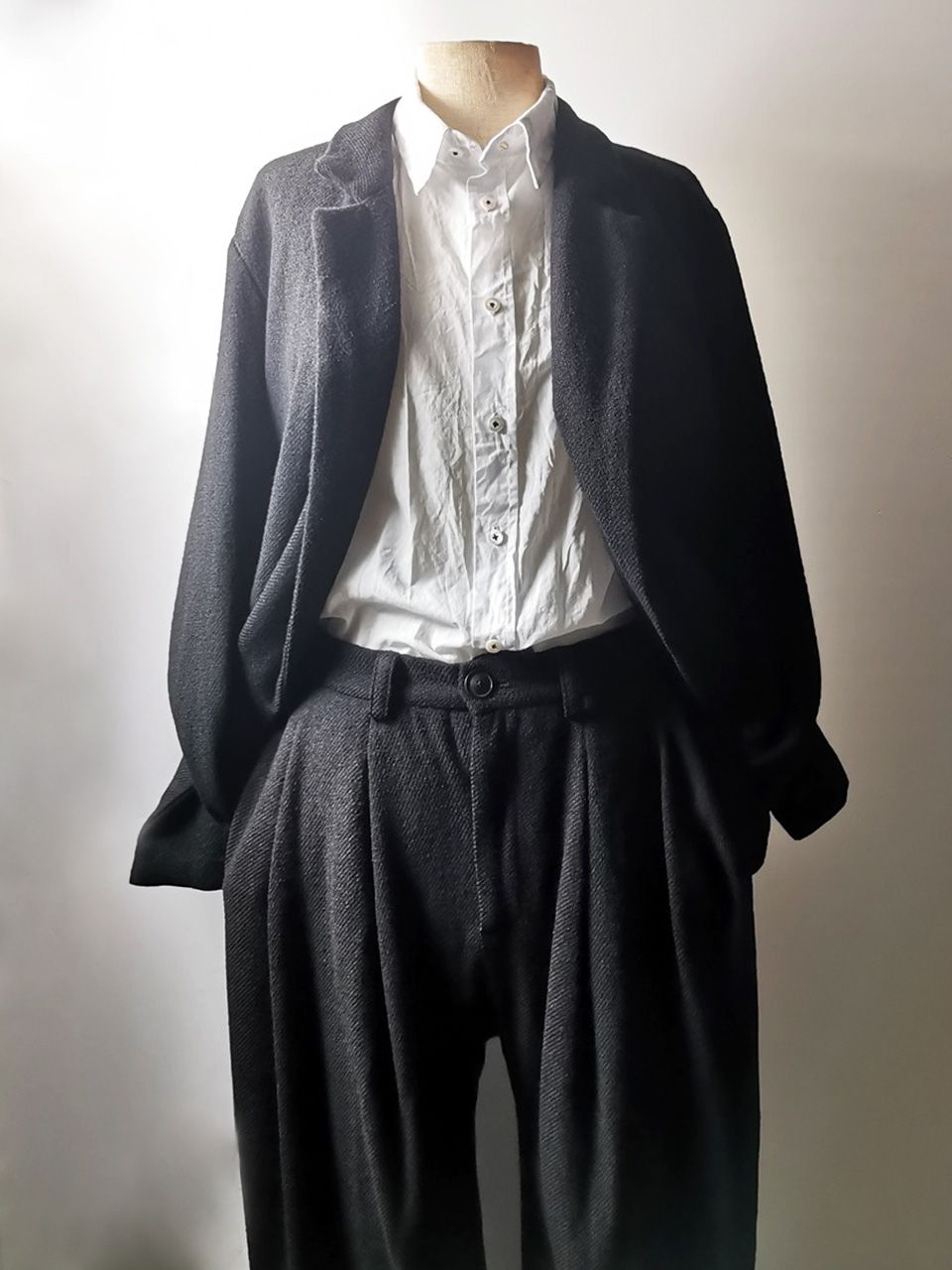 CUT from the same hand dyed Biella diagonal textured wool twill fabric, this tailored Evolution VII.2 original relaxed-drape fit notch-lapel double vent double-breasted jacket pattern is the perfect matching jacket to pair with this trouser.