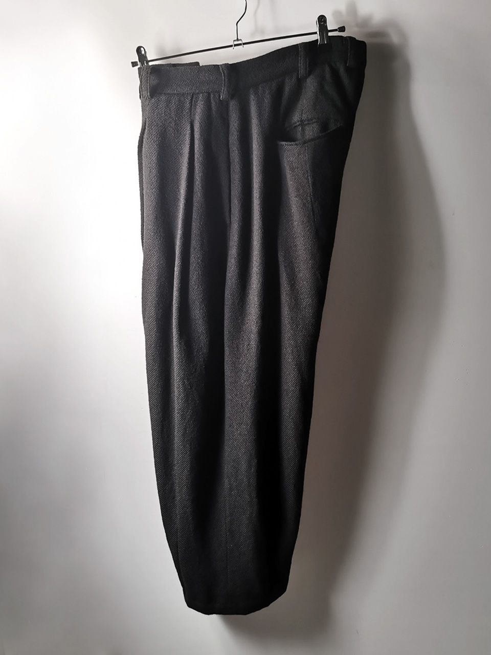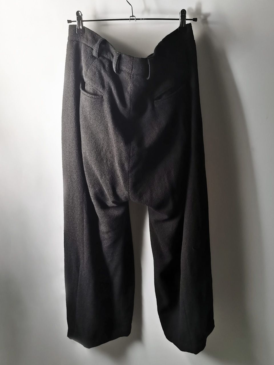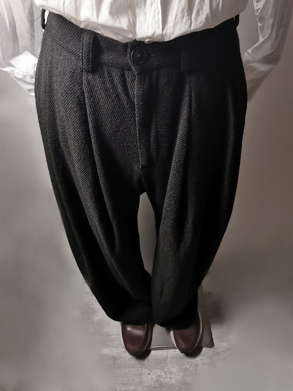 THIS special version of the super limited edition Evolution III For Japan Only CVP18 trouser design is one of only 8 pieces of its kind made by hand in the world, each created exclusively using our exaggerated large volume silhouette, double pleated front trouser pattern developed from our extensive tailoring research using a special textured weave diagonal twill wool woven only for us in Biella, Italy--the world's leading region for fine virgin wool fabric production--combined with pure cupro Bemberg-type linings woven for us by Tessitura Mauri in Como for maximum lightness and comfort--and then specially dyed, washed, shaped and treated by hand in our world-famous GBS Superworkrooms at Cavarzere Venezia using a series of processes which required over 15 hours of expert work to achieve its special colors, patina effects, shaping, drape and softness. The design features all hand tailored fly front, pleating and reinforced besom pocket build, impeccable clean-finished taped seam fully-lined interior construction, uniquely balanced cut, fit and design, special Japanese YKK nickel aluminum zipper made for us in Japan, chosen for maximum strength and style, generous 2.5 centimeter seam allowances for plenty of alteration capability for long-term wear and service, exquisite Italian satin taped hems all completely sewn by hand (not machined), exquisite real horn design buttons created exclusively for us by the world's greatest living buttonmakers--Claudio and Cinzia Fontana in Parma Italy--and our signature real hand sewn buttonholes in luxurious pure silk Bozzolo Milano Seta Reale threads (which required at least 12-14 minutes to create each one). The piece also features our world leading pure silk label created exclusively for us by Mion SpA in Torreglia which is the first label in the luxury industry to completely eliminate plastic polyester yarns in it--beautifully attached entirely by hand using pure silk threads.
