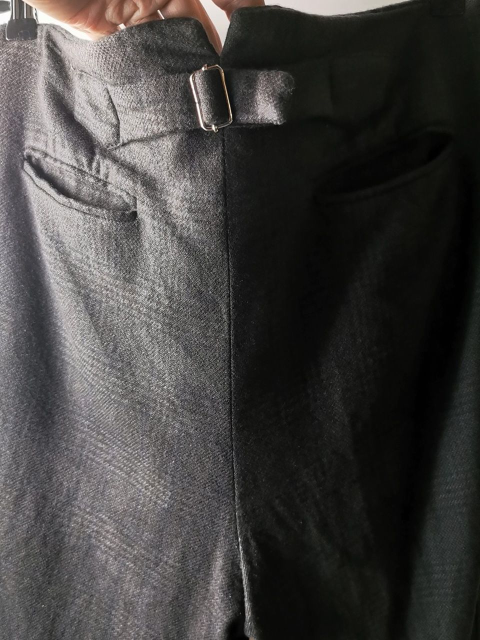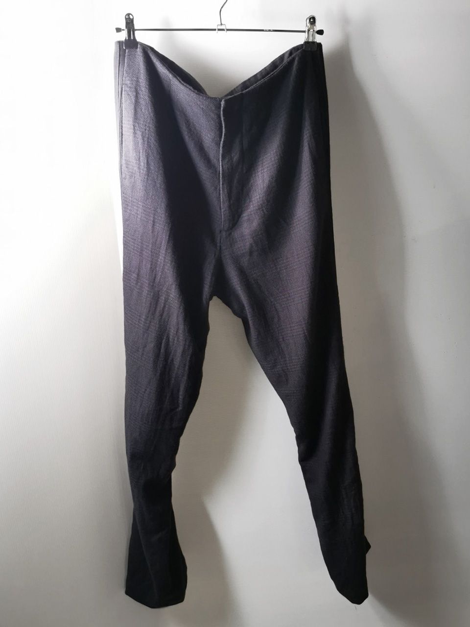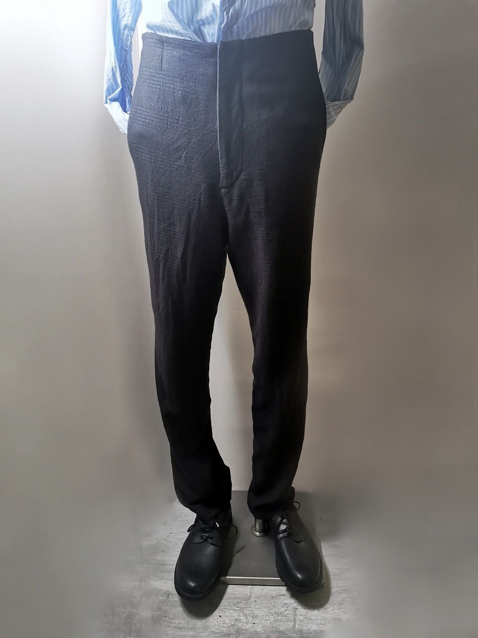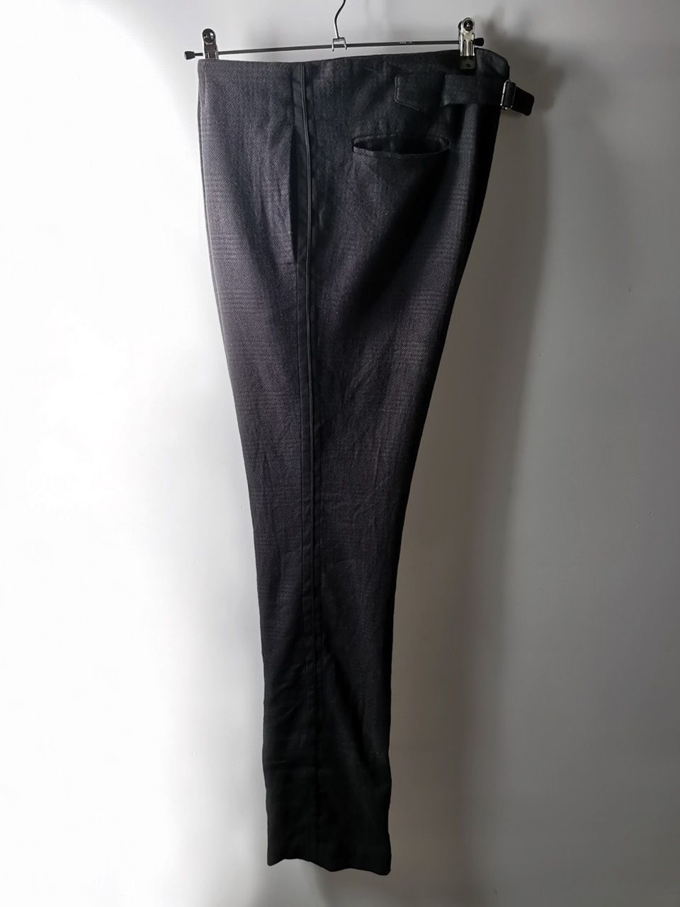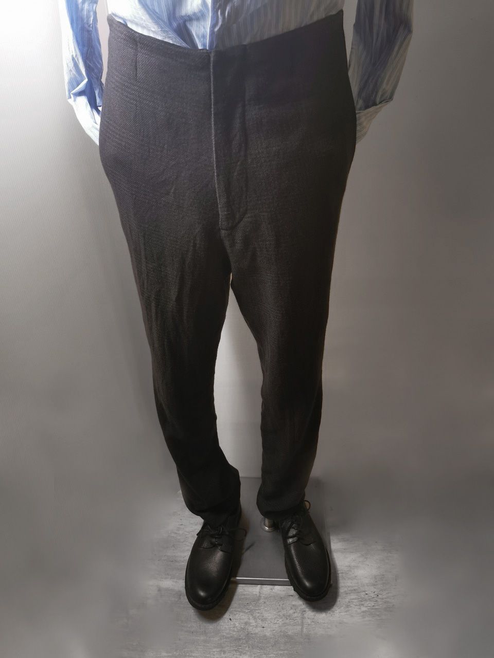 THIS special version of the super limited edition ETP06 archive formal trouser design one of only 3 pieces of its kind made by hand in the entire world, each created exclusively from a modified 1910’s conical tapered leg trousers pattern from our “Earth.Land.Terra” Paris Autumn/Winter 2013 collection’s extensive tailoring research, and cut using a superlux pure Alashan wollenspun cashmere suiting cloth woven only for us by the oldest still operating woolen mill in the world and the world’s most respected cashmere fabric makers--Fratelli Piacenza 1733 in Pollone, Biella, Italy--combined with pure cupro Bemberg-type linings woven for us by Tessitura Mauri in Como for maximum lightness and comfort--then all specially multiple hand-dyed, washed and treated in our world-famous GBS Superworkrooms at Cavarzere Venezia using a series of processes that required over 27 hours of master work to achieve its special uneven colors, patina effects, shaping, and incredible softness and drape. The design features a special period relaxed upper leg with tapering slim leg bottom silhouette with elegant side stripe detailing, carefully cut and sewn expert matching plaid tailoring work, split back waistband with cinch belt and metal buckle, hand-cut rear besom and front in-the-seam pockets each fully self-lined in the precious Alashan wollenspun cashmere fabric for maximum comfort and durability, beautifully finished fully-lined interior construction, generous 2,5 centimeter seam allowances on major fitting seams that allow the piece to be altered and let out for long term wear and service, real hand-sewn GBS pure Como Silk print taped hemlines (not machined) using our proprietary in-house techniques for maximum durability, impeccable top-of-the-line Excella metal zipper made to order for us by YKK’s top world factory in Japan, and exclusive hand-sewn Italian metal hook and eye and automatic fastening closures. The piece also features our world leading pure silk label created exclusively for us by Mion SpA in Torreglia which is the first label in the luxury industry to completely eliminate plastic polyester yarns in it--beautifully attached entirely by hand with pure silk threads. Variations in color and color density are not imperfections or irregularities, but specific characteristics of the special hand-dyeing and hand-making technique. Please treat buttons and buttonholes with extreme care.