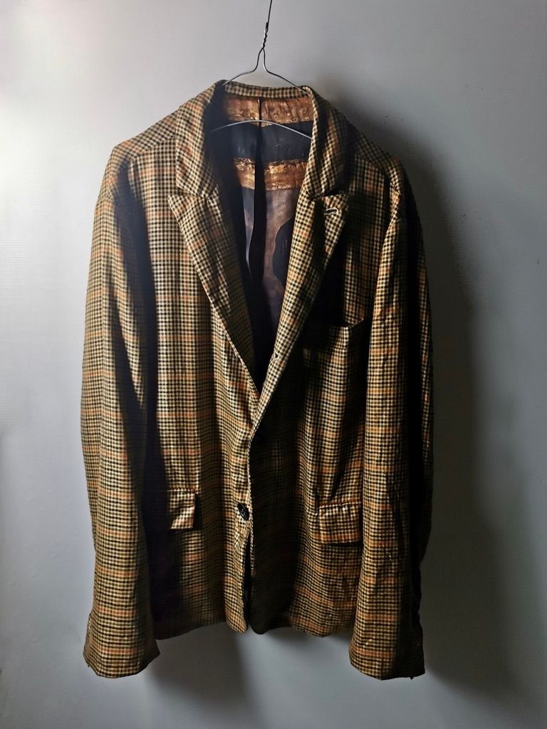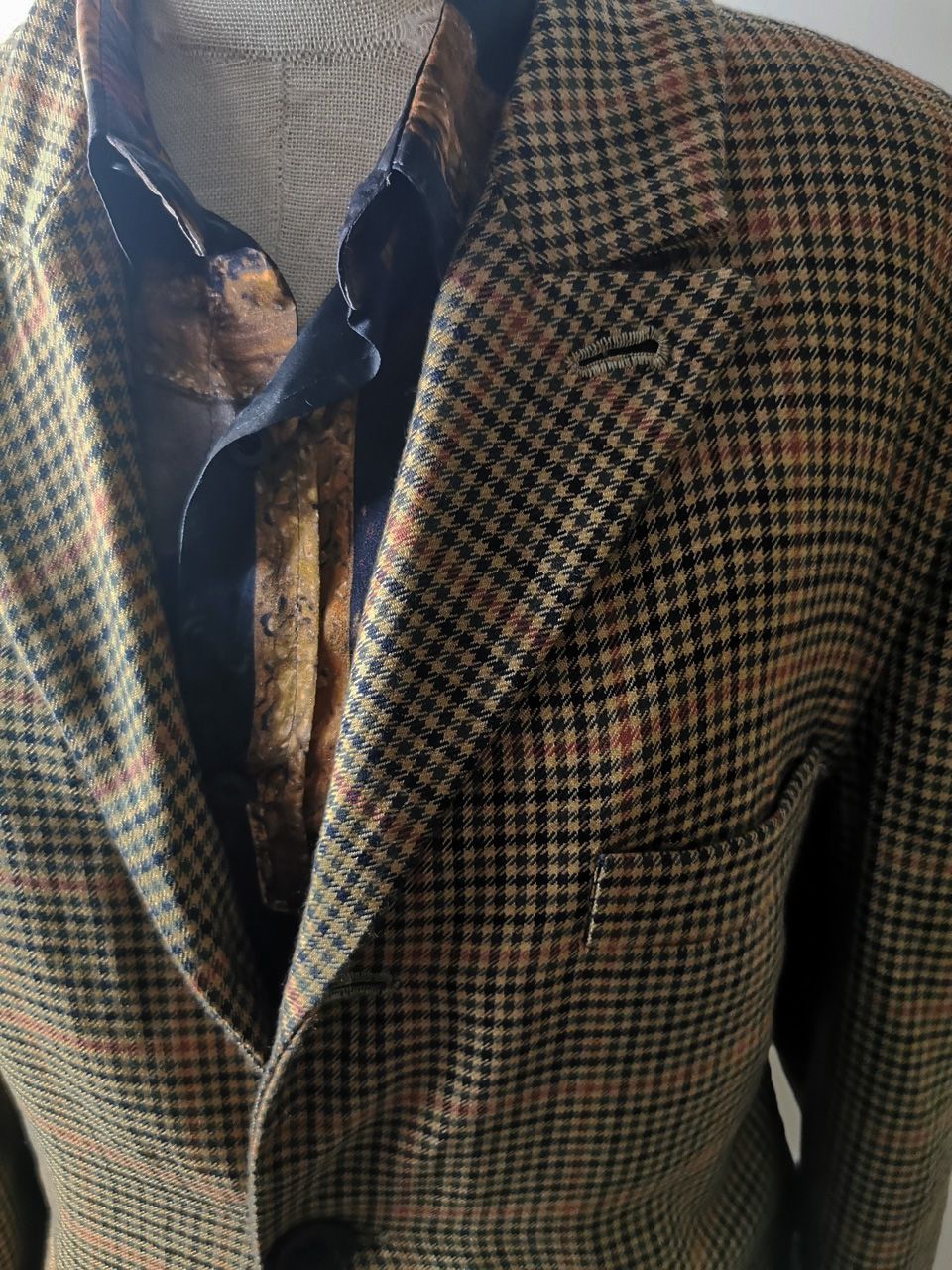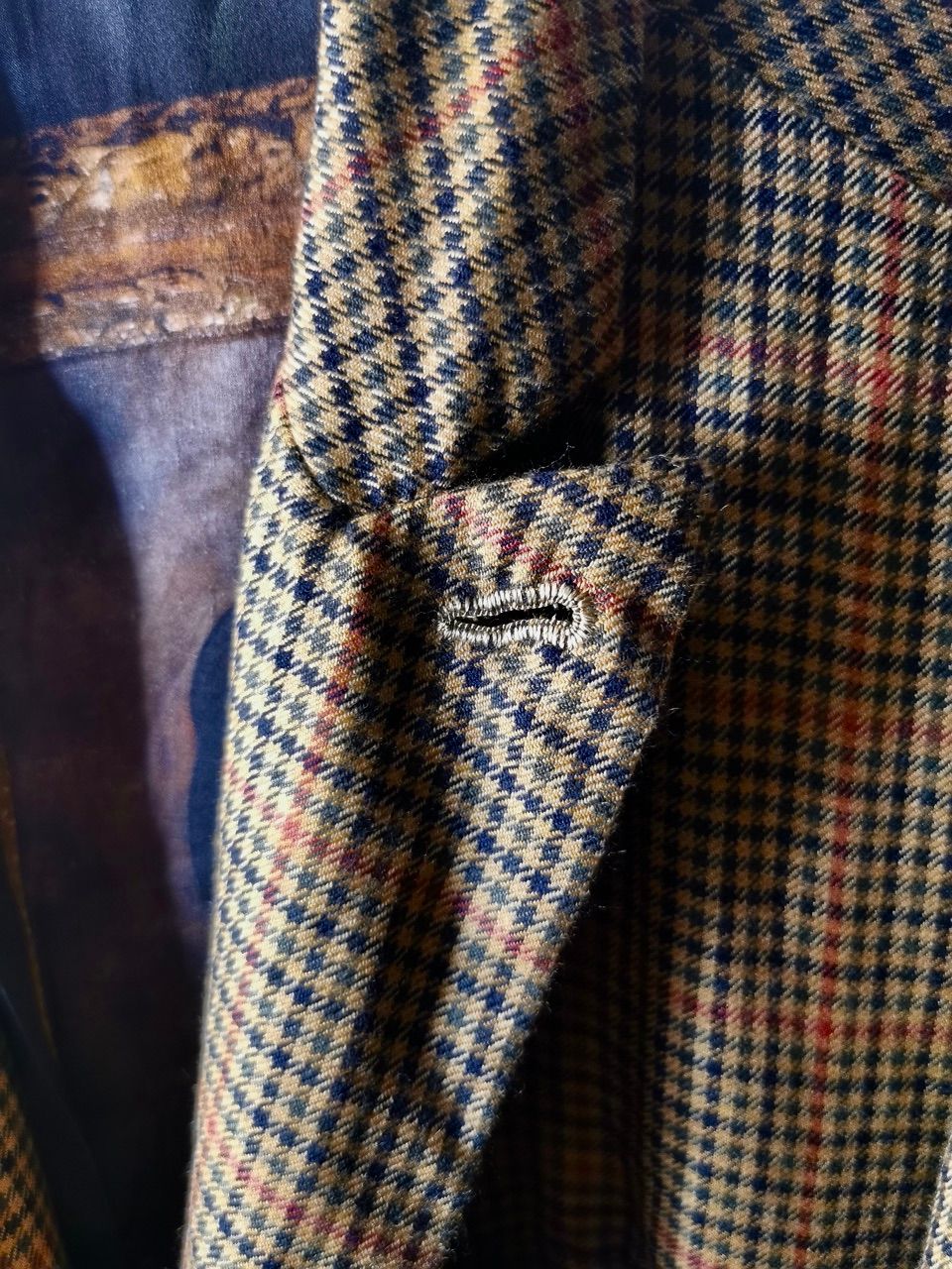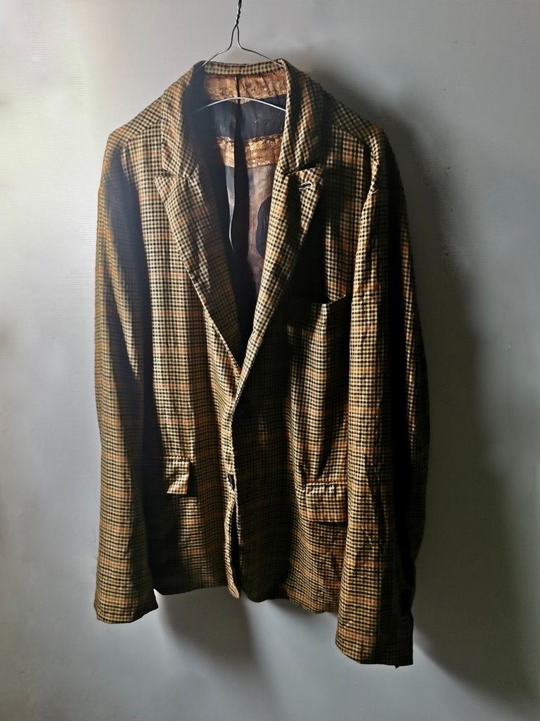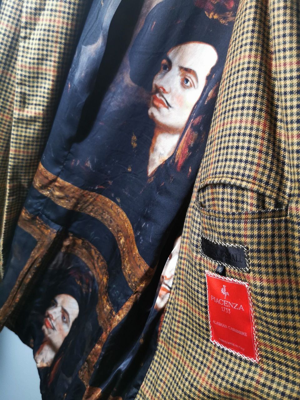 THIS special version of the super limited edition GBS Evolution X EV10J08 hyperlux handmade jacket design is one of only 4 pieces of its kind made by hand in the entire world, using a classic single-breasted 3-button peak-lapel jacket pattern from our extensive tailoring research, and cut using an exclusive hyper luxury pure Alashan worsted Tattersall plaid cashmere fabric woven only for us by the oldest woolen mill and most respected cashmere makers in the world--Fratelli Piacenza 1733 Spa in Pollone Biella, Italy-- then combined with an exquisite lining story of luxurious pure silk 16-momme raso satin exclusive Darklands “Lord Byron” print design composition by Estefania Campillo comprising images of a painting of Lord Byron by the Berlin artist David Nicholson, housed in an original Louis XVI frame from a private collection, and made only for us by the legendary Brenna family in Como, Italy--the world’s leading center for fine silk fabric creation--then individually multiple hand washed, shaped and treated in our world-famous GBS Superworkrooms at Cavarzere Venezia for extra aging, shaping, drape and softness. The design features real handmade working surgeon’s 4-button sleeve cuffs, extraordinary handcut besom flap, welt and interior besom pockets throughout the garment each fully self-lined with the very expensive pure Alashan cashmere cloth for incredible comfort, security and durability; impeccably cut and stitched matching plaids throughout and handcut center back vent, generous 2,5 centimeter seam allowances on major fitting seams that allow the jacket to be altered and let out for long-term wear and value, a remarkable composition of hand-sewn real horn button designs made exclusively for us by the world’s greatest living buttonmakers--Claudio and Cinzia Fontana in Parma, Italy--and no less than 12 of our signature real hand-stitched buttonholes in pure silk Bozzolo Reale Milano Seta threads which required at least 12-14 minutes to create each one (over 2 hours of painstaking expert work just to make the buttonholes alone for a single jacket). The piece also features our world leading pure silk label created exclusively for us by Mion SpA in Torreglia which is the first label in the luxury industry to completely eliminate plastic polyester yarns in it--beautifully attached entirely by hand with pure silk threads.