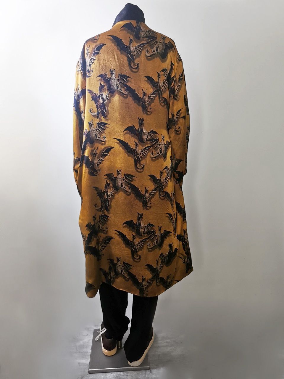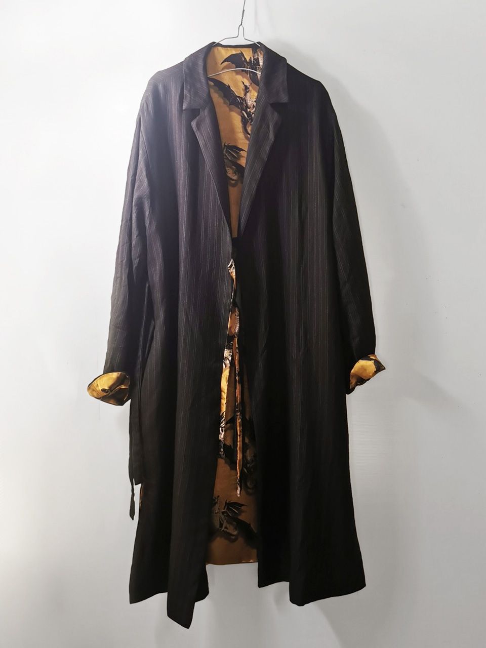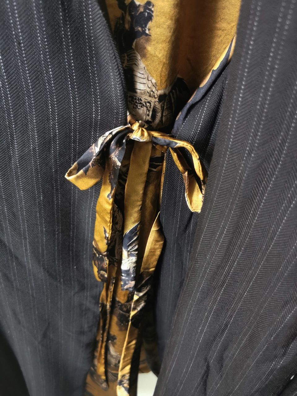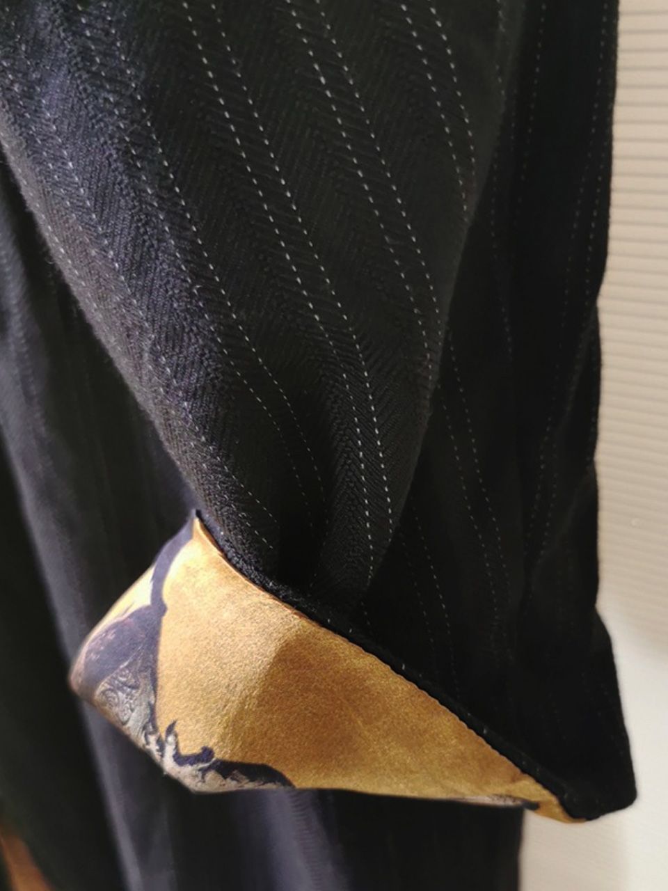 THIS special version of the super limited edition GBS Evolution X EV10WJ06 long relaxed living archive jacket design is the only piece of its kind made in the entire world. It was created exclusively from our original modified kimono pattern from our extensive tailoring research, and cut using a super soft luxurious silk and wool superlux striped herringbone weave suiting cloth woven only for us by the world's greatest research fabric maker--Luigi Parisotto in Sarcedo Vincenza, Italy--combined with an exquisite lining story of luxurious pure silk 16-momme raso satin exclusive Darklands “Gryphons” print design developed by Estefania Campillo, and made only for us by the legendary Brenna family in Como, Italy--the world’s leading center for fine silk fabric creation--then individually multiple hand washed, shaped and treated in our world-famous GBS Superworkrooms at Cavarzere Venezia for extra aging, shaping, drape and softness. The design features a reversible 2-in-1 design concept use for extra investment value, special double ties that can be tied and worn in a variety of different ways as well as fully-self-lined pure silk and silk & wool hyperlux pockets both inside and outside that can be worn inside and out, and our world leading pure silk label created exclusively for us by Mion SpA in Torreglia which is the first label in the luxury industry to completely eliminate plastic polyester yarns in it--beautifully attached inside the pocket entirely by hand using pure silk threads and is handsigned and numbered by the designer.