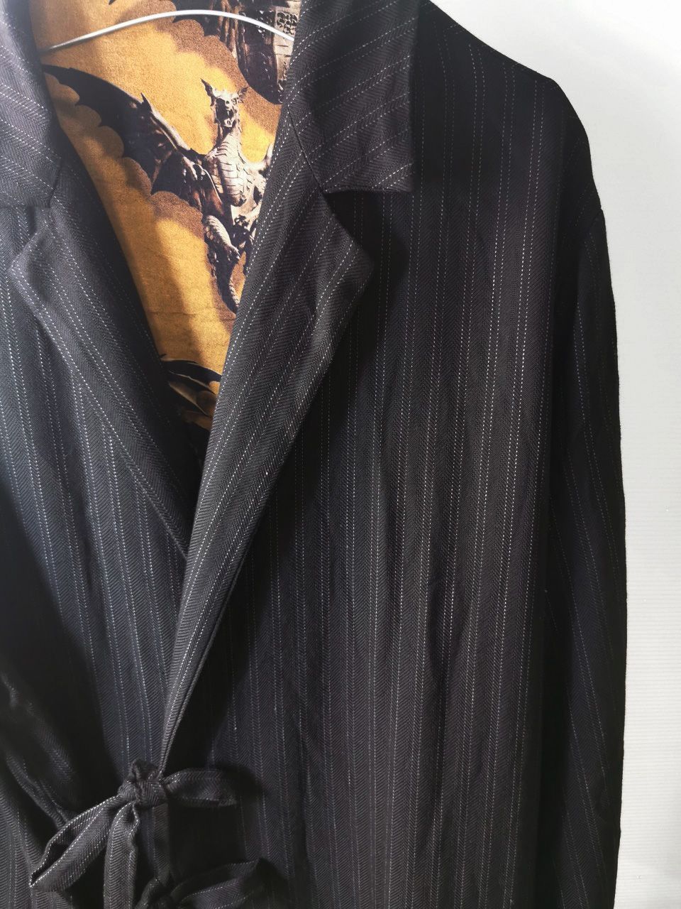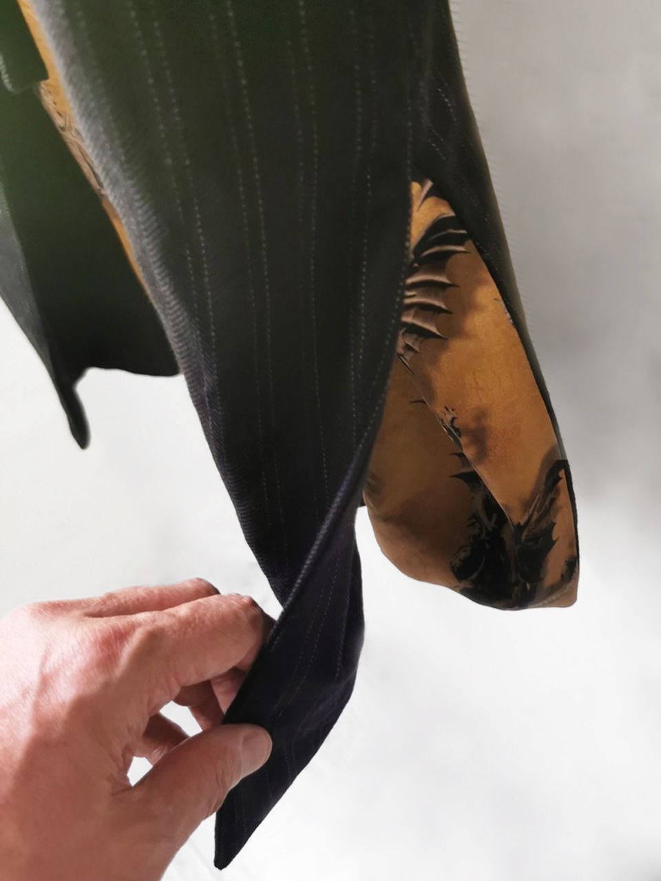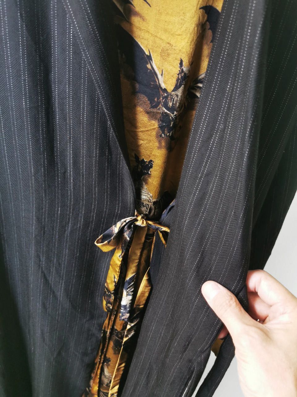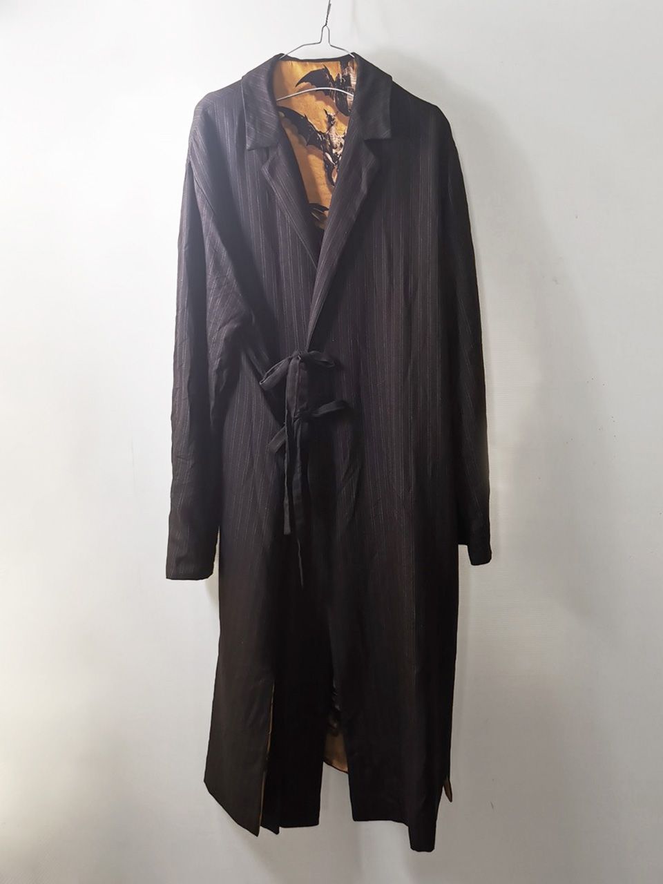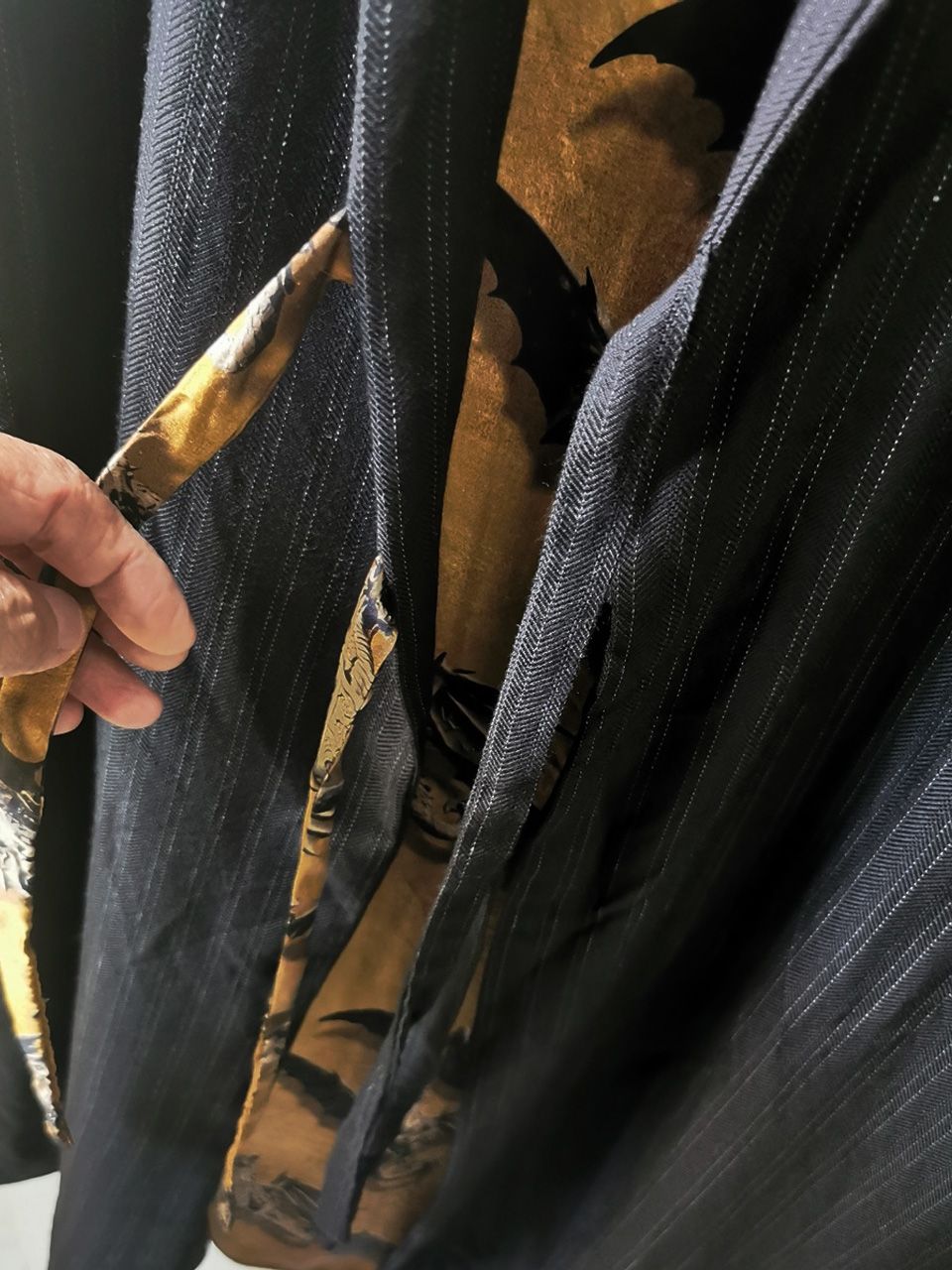 THIS special version of the super limited edition GBS Evolution X EV10WJ06 long relaxed living archive jacket design is the only piece of its kind made in the entire world. It was created exclusively from our original modified kimono pattern from our extensive tailoring research, and cut using a super soft luxurious silk and wool superlux striped herringbone weave suiting cloth woven only for us by the world's greatest research fabric maker--Luigi Parisotto in Sarcedo Vincenza, Italy--combined with an exquisite lining story of luxurious pure silk 16-momme raso satin exclusive Darklands “Gryphons” print design developed by Estefania Campillo, and made only for us by the legendary Brenna family in Como, Italy--the world’s leading center for fine silk fabric creation--then individually multiple hand washed, shaped and treated in our world-famous GBS Superworkrooms at Cavarzere Venezia for extra aging, shaping, drape and softness. The design features a reversible 2-in-1 design concept use for extra investment value, special double ties that can be tied and worn in a variety of different ways as well as fully-self-lined pure silk and silk & wool hyperlux pockets both inside and outside that can be worn inside and out, and our world leading pure silk label created exclusively for us by Mion SpA in Torreglia which is the first label in the luxury industry to completely eliminate plastic polyester yarns in it--beautifully attached inside the pocket entirely by hand using pure silk threads and is handsigned and numbered by the designer.
