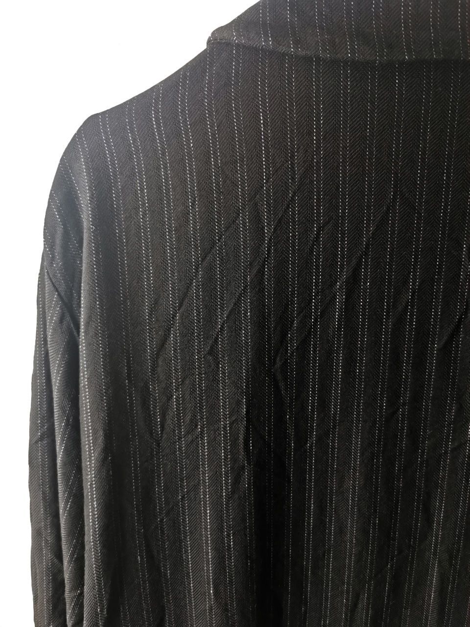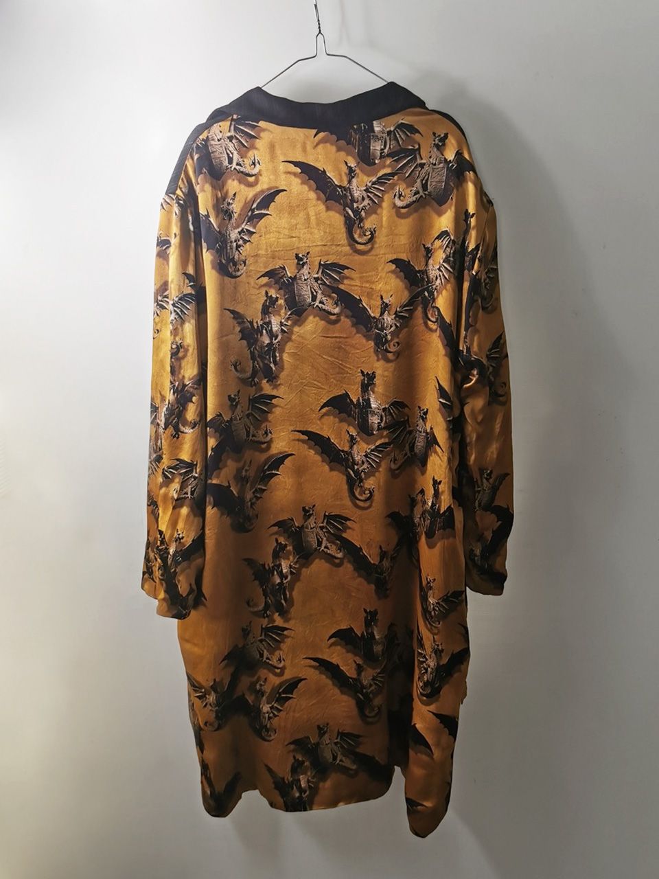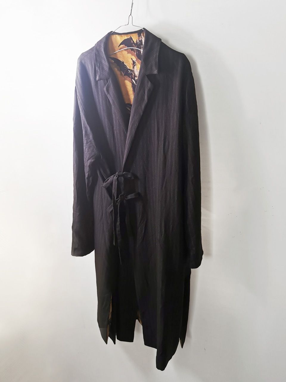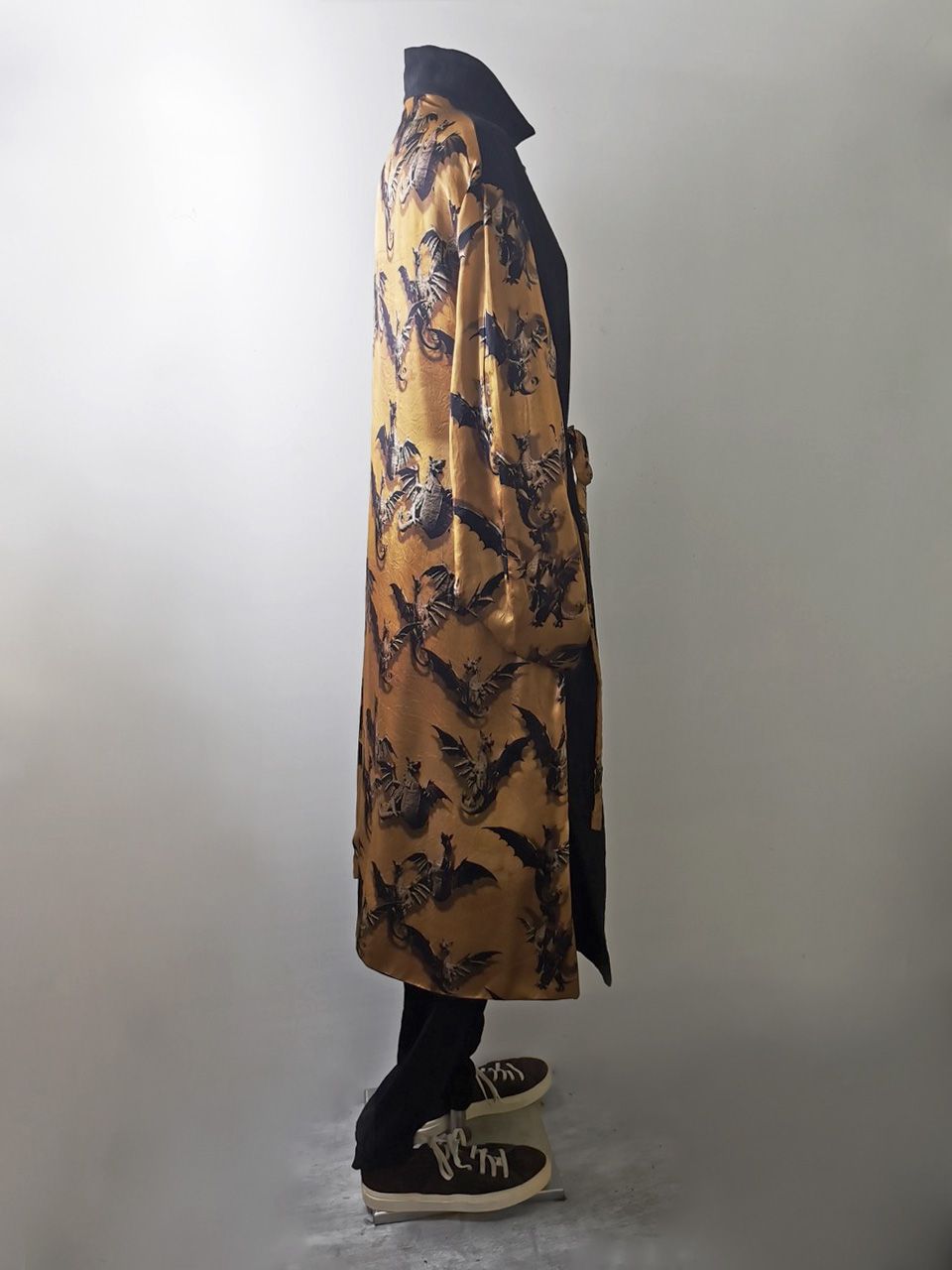 THIS special version of the super limited edition GBS Evolution X EV10WJ06 long relaxed living archive jacket design is the only piece of its kind made in the entire world. It was created exclusively from our original modified kimono pattern from our extensive tailoring research, and cut using a super soft luxurious silk and wool superlux striped herringbone weave suiting cloth woven only for us by the world's greatest research fabric maker--Luigi Parisotto in Sarcedo Vincenza, Italy--combined with an exquisite lining story of luxurious pure silk 16-momme raso satin exclusive Darklands “Gryphons” print design developed by Estefania Campillo, and made only for us by the legendary Brenna family in Como, Italy--the world’s leading center for fine silk fabric creation--then individually multiple hand washed, shaped and treated in our world-famous GBS Superworkrooms at Cavarzere Venezia for extra aging, shaping, drape and softness. The design features a reversible 2-in-1 design concept use for extra investment value, special double ties that can be tied and worn in a variety of different ways as well as fully-self-lined pure silk and silk & wool hyperlux pockets both inside and outside that can be worn inside and out, and our world leading pure silk label created exclusively for us by Mion SpA in Torreglia which is the first label in the luxury industry to completely eliminate plastic polyester yarns in it--beautifully attached inside the pocket entirely by hand using pure silk threads and is handsigned and numbered by the designer.