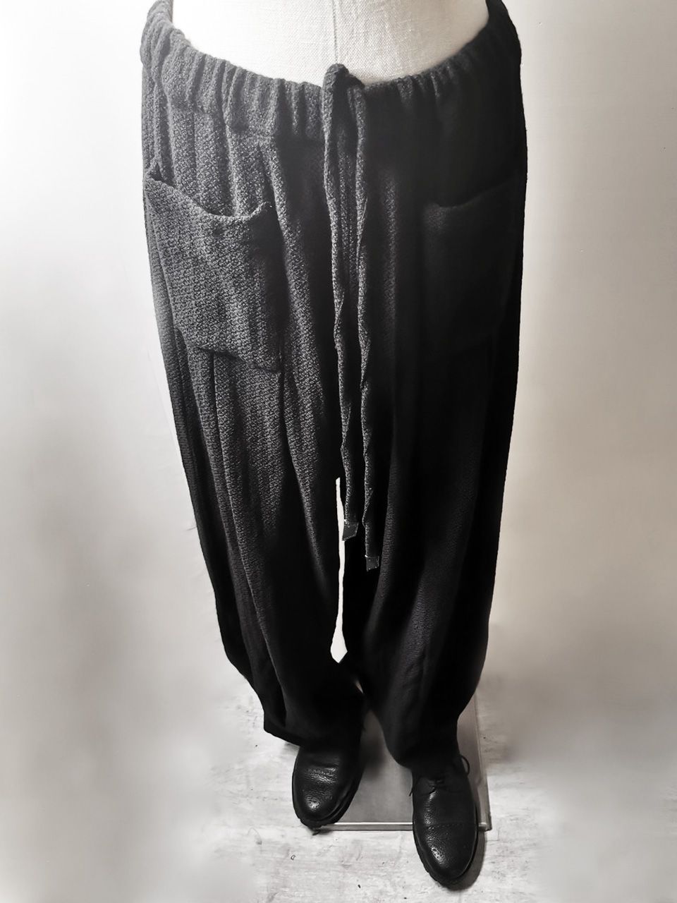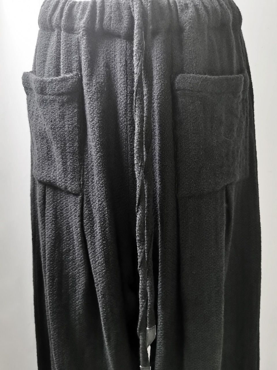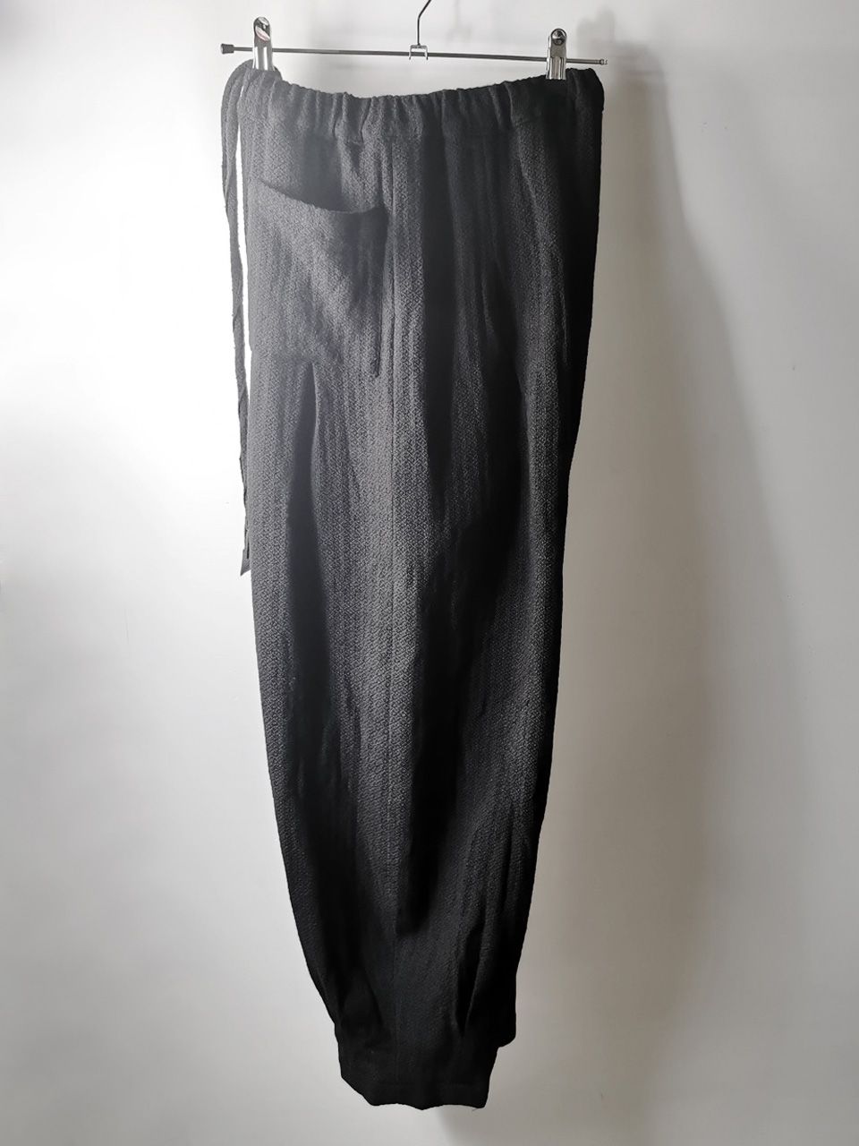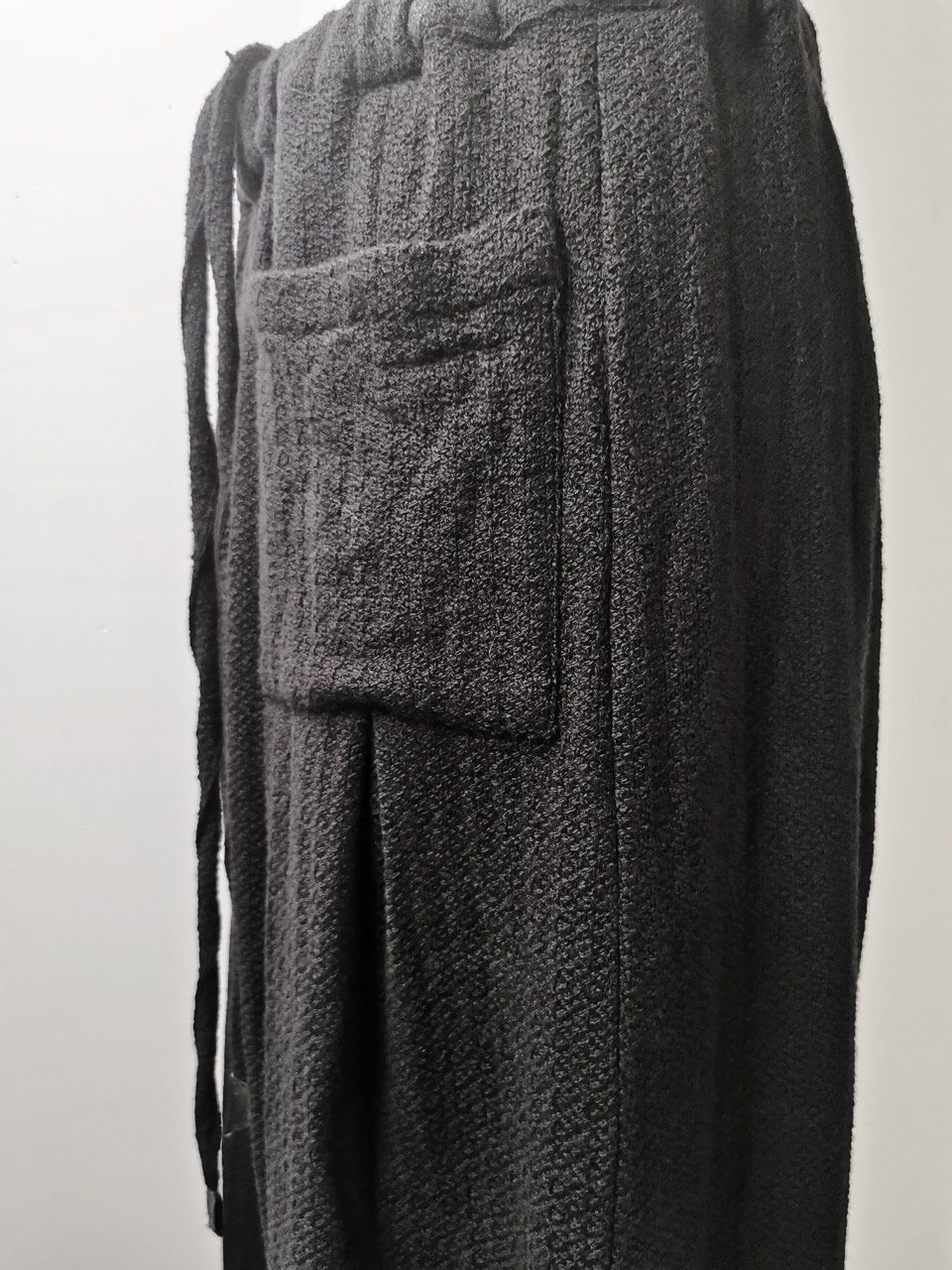 THIS super limited edition GBS Evolution X EV10WP13 handmade trouser design is one of only 4 pieces of its kind currently being made by hand for the entire world, each exclusively from an advanced all-new front and back double-pleated exaggerated volume elastic waist drawstring trouser pattern from our extensive tailoring research, and cut in a new all handwoven "Tosco Lana" pure wool fabric created exclusively for us by the master weaver Carlo Colombo on the 18th century wooden hand looms of Tessitura La Colombina in Badoere di Morgano, Italy---then specially dyed by hand in our our world-famous GBS Superworkrooms at Cavarzere Venezia using a special process which required over 8 hours of painstaking expert work to achieve its special colors, patina effects, shaping, fluid drape and softness. The design features architectural pleating specially placed at 12 different points in tandem with 2 squared-form front patch pockets to achieve a totally innovative new shape and silhouette with extraordinary comfort and ease of wear, expert single-needle stitched tailoring throughout, beautifully finished interior taped seam finishing, drawstrings with handcut vintage Italian leather detail tabs, special pure linen herringbone weave taped hemlines, generous 2,5 centimeter seam allowances on major fitting seams that allow the trouser to be altered and let out, and our world leading pure silk hand dyed label created exclusively for us by Mion SpA in Torreglia which is the first label in the luxury industry to completely eliminate plastic polyester yarns in it–-beautifully attached entirely by hand using pure silk threads.