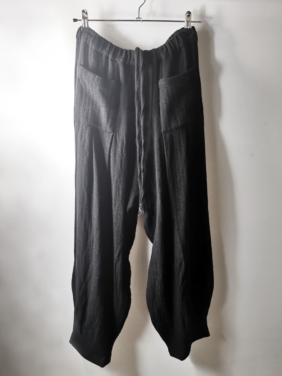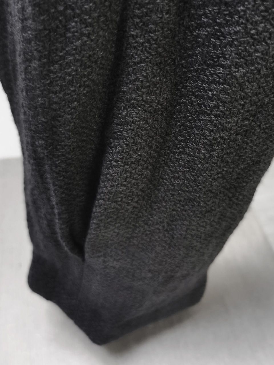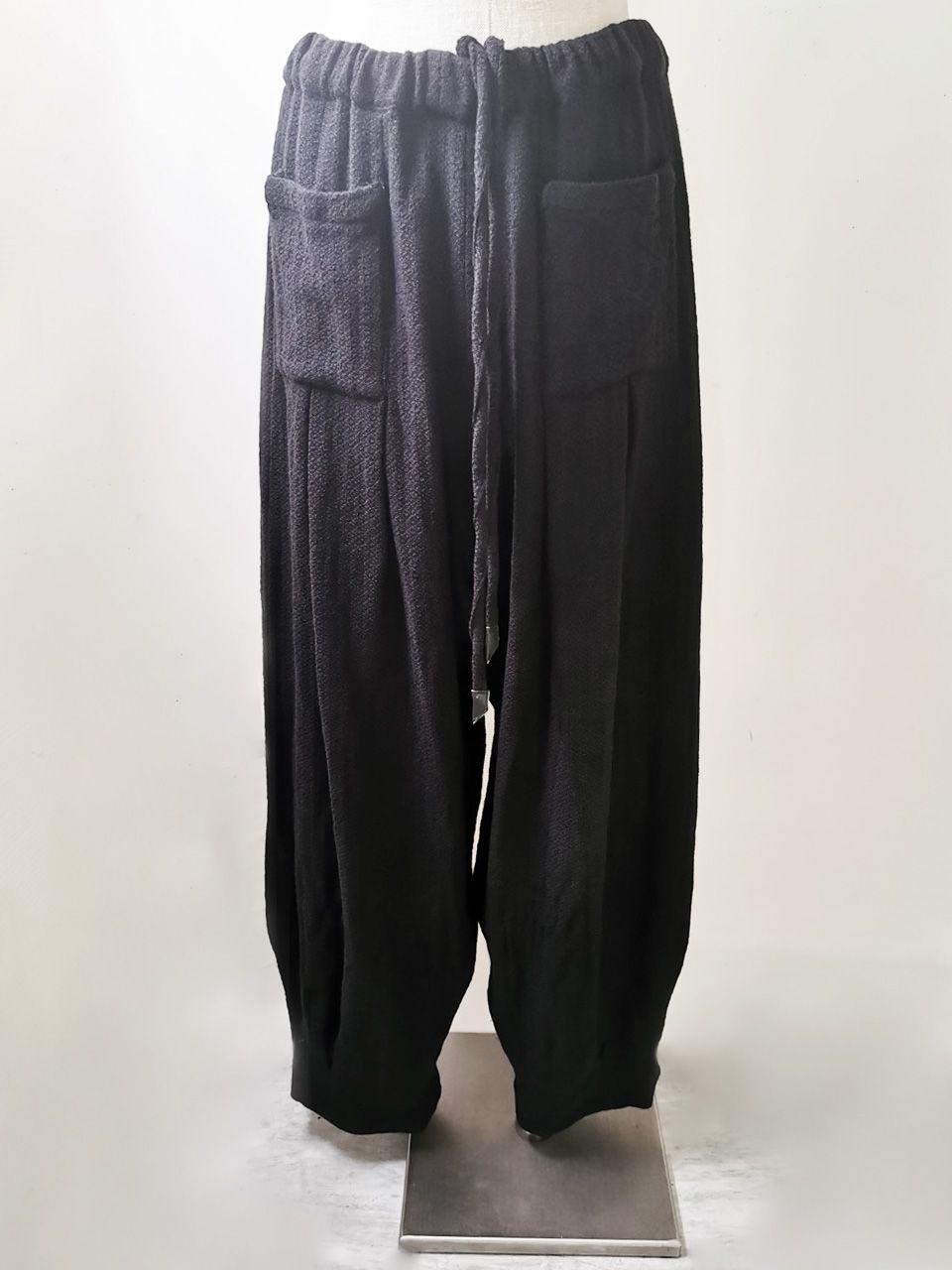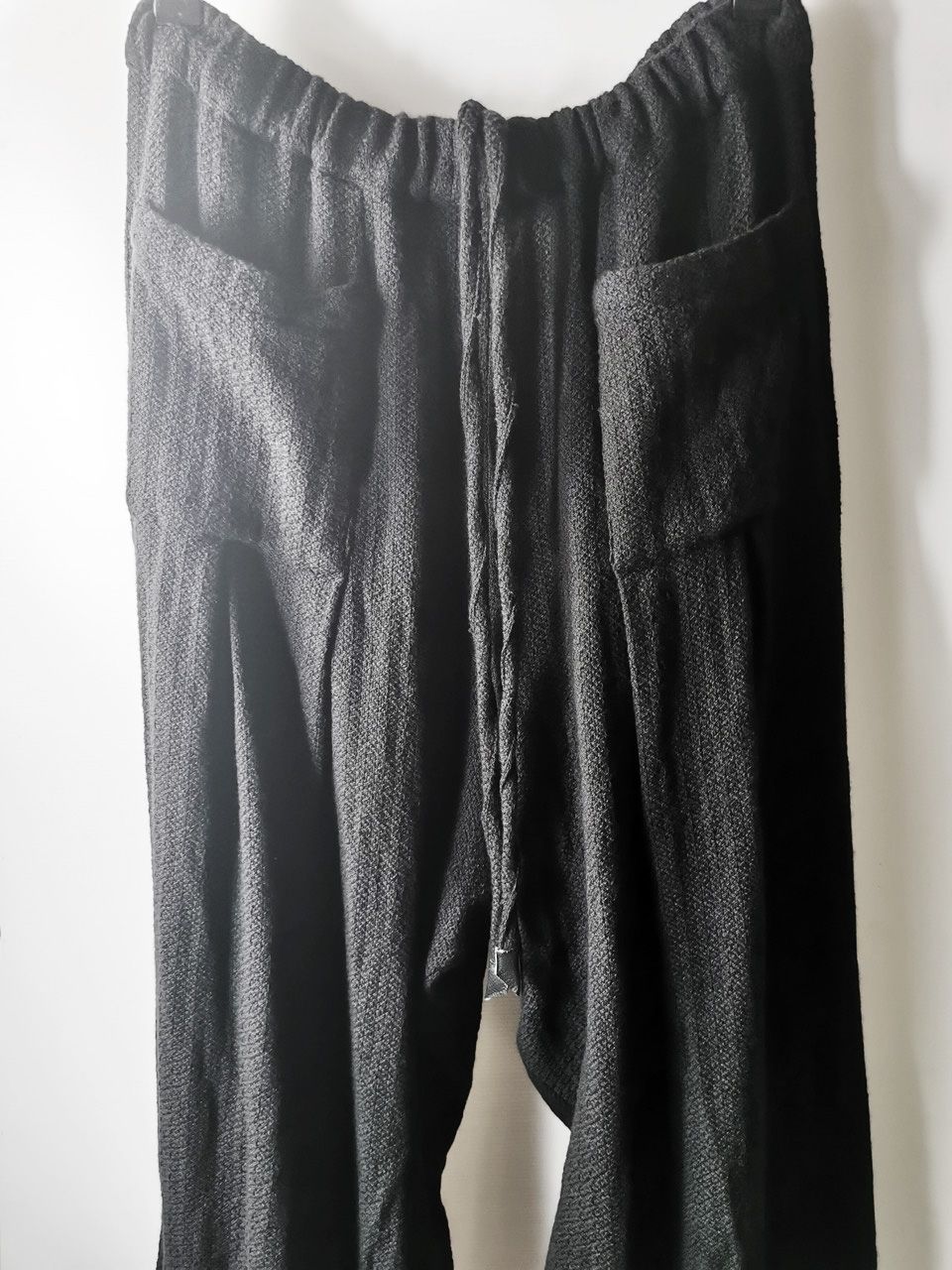 THIS super limited edition GBS Evolution X EV10WP13 handmade trouser design is one of only 4 pieces of its kind currently being made by hand for the entire world, each exclusively from an advanced all-new front and back double-pleated exaggerated volume elastic waist drawstring trouser pattern from our extensive tailoring research, and cut in a new all handwoven "Tosco Lana" pure wool fabric created exclusively for us by the master weaver Carlo Colombo on the 18th century wooden hand looms of Tessitura La Colombina in Badoere di Morgano, Italy---then specially dyed by hand in our our world-famous GBS Superworkrooms at Cavarzere Venezia using a special process which required over 8 hours of painstaking expert work to achieve its special colors, patina effects, shaping, fluid drape and softness. The design features architectural pleating specially placed at 12 different points in tandem with 2 squared-form front patch pockets to achieve a totally innovative new shape and silhouette with extraordinary comfort and ease of wear, expert single-needle stitched tailoring throughout, beautifully finished interior taped seam finishing, drawstrings with handcut vintage Italian leather detail tabs, special pure linen herringbone weave taped hemlines, generous 2,5 centimeter seam allowances on major fitting seams that allow the trouser to be altered and let out, and our world leading pure silk hand dyed label created exclusively for us by Mion SpA in Torreglia which is the first label in the luxury industry to completely eliminate plastic polyester yarns in it–-beautifully attached entirely by hand using pure silk threads.