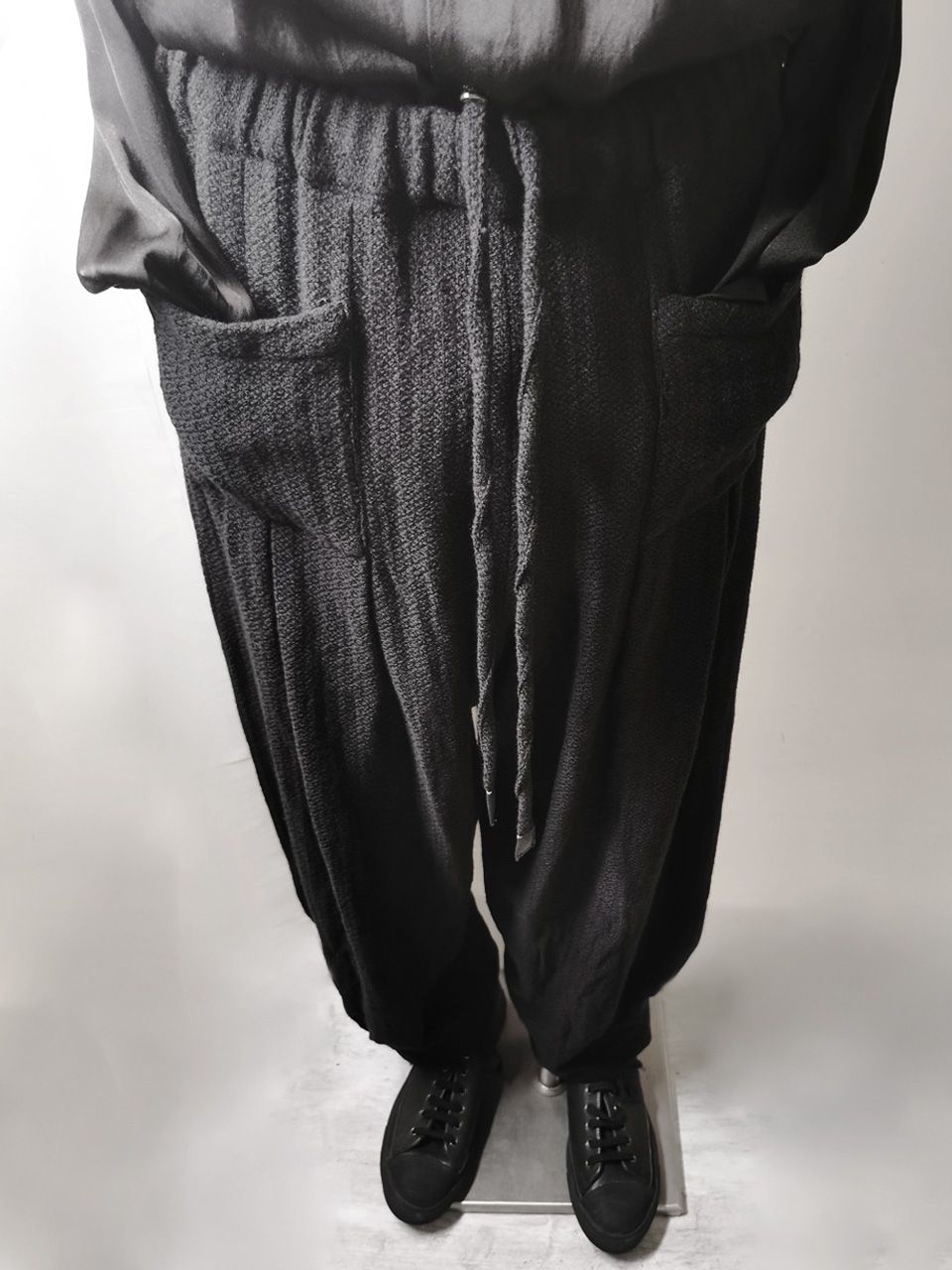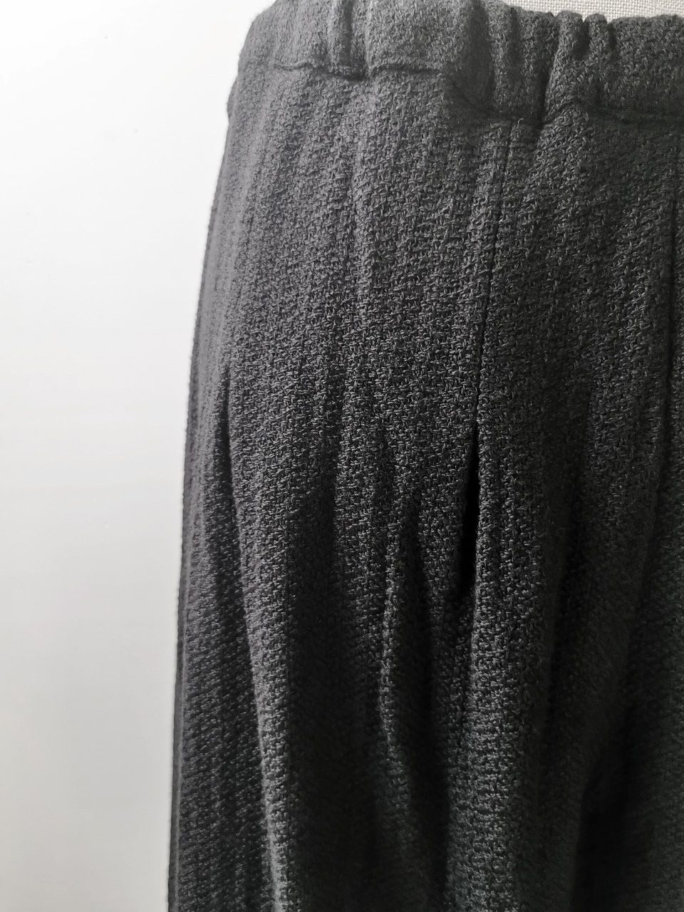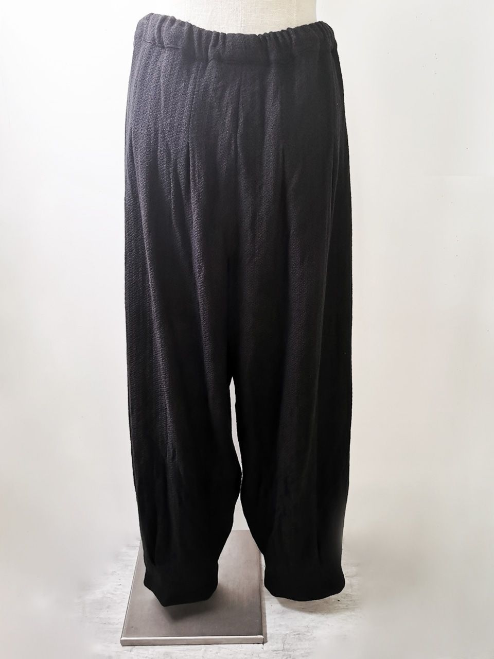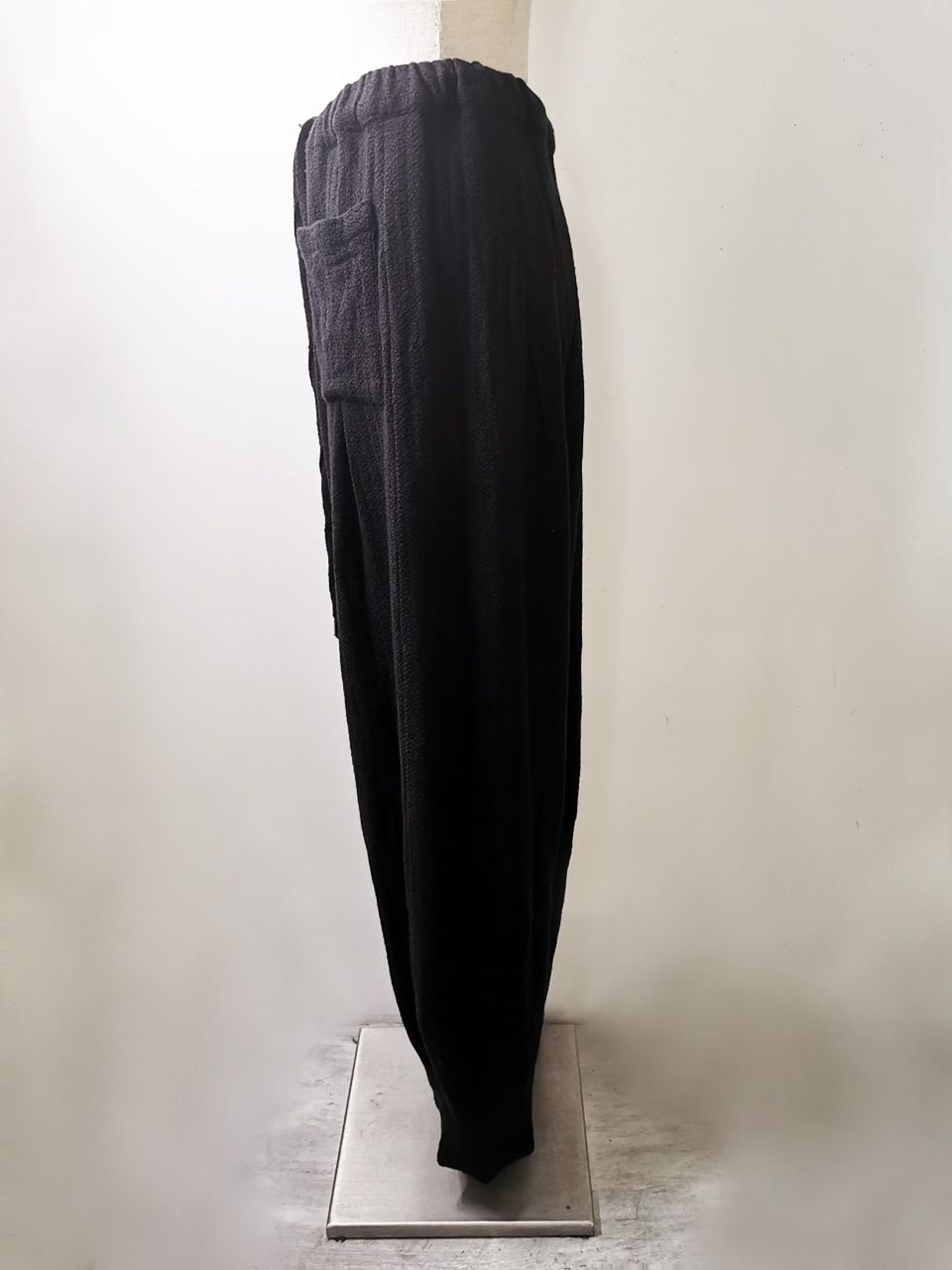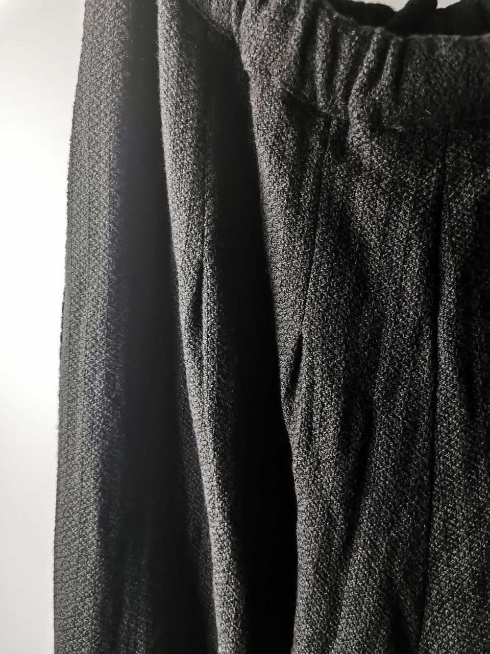 THIS super limited edition GBS Evolution X EV10WP13 handmade trouser design is one of only 4 pieces of its kind currently being made by hand for the entire world, each exclusively from an advanced all-new front and back double-pleated exaggerated volume elastic waist drawstring trouser pattern from our extensive tailoring research, and cut in a new all handwoven "Tosco Lana" pure wool fabric created exclusively for us by the master weaver Carlo Colombo on the 18th century wooden hand looms of Tessitura La Colombina in Badoere di Morgano, Italy---then specially dyed by hand in our our world-famous GBS Superworkrooms at Cavarzere Venezia using a special process which required over 8 hours of painstaking expert work to achieve its special colors, patina effects, shaping, fluid drape and softness. The design features architectural pleating specially placed at 12 different points in tandem with 2 squared-form front patch pockets to achieve a totally innovative new shape and silhouette with extraordinary comfort and ease of wear, expert single-needle stitched tailoring throughout, beautifully finished interior taped seam finishing, drawstrings with handcut vintage Italian leather detail tabs, special pure linen herringbone weave taped hemlines, generous 2,5 centimeter seam allowances on major fitting seams that allow the trouser to be altered and let out, and our world leading pure silk hand dyed label created exclusively for us by Mion SpA in Torreglia which is the first label in the luxury industry to completely eliminate plastic polyester yarns in it–-beautifully attached entirely by hand using pure silk threads.