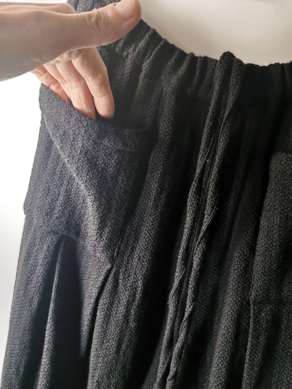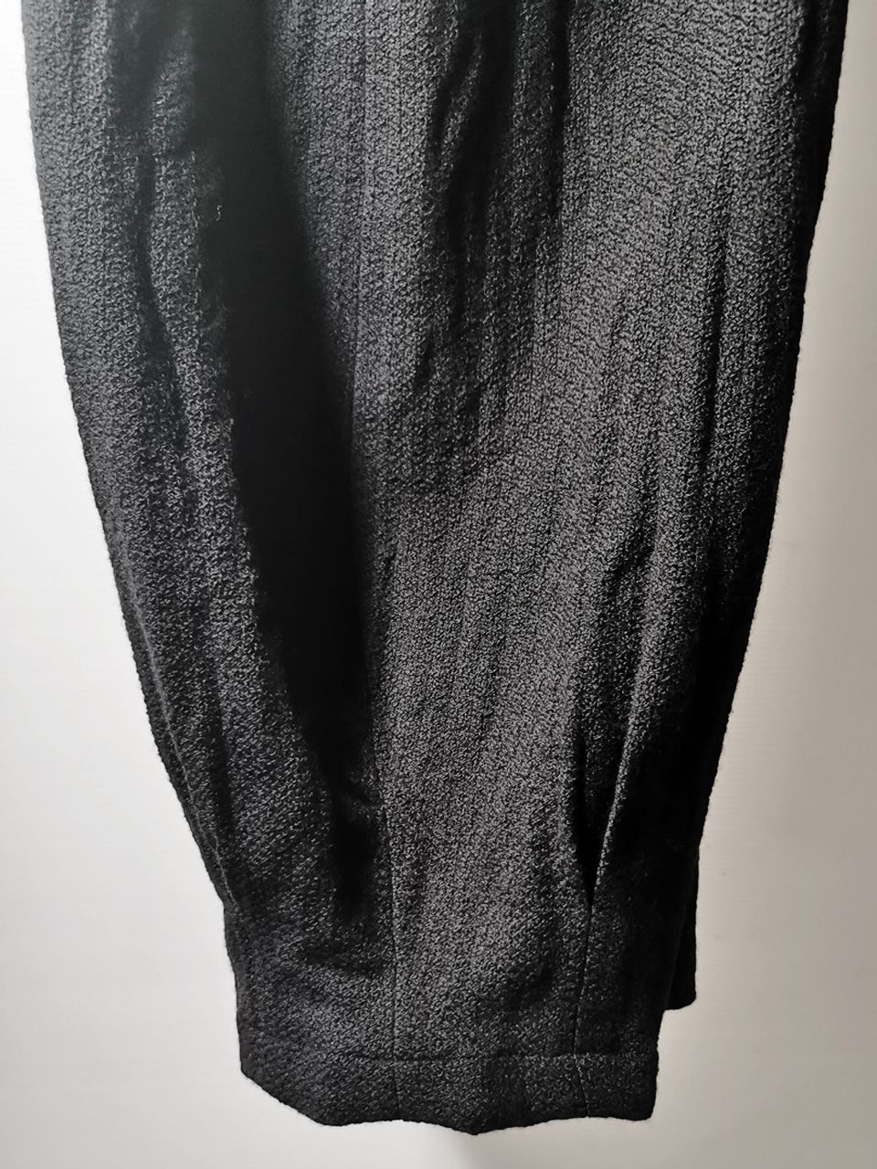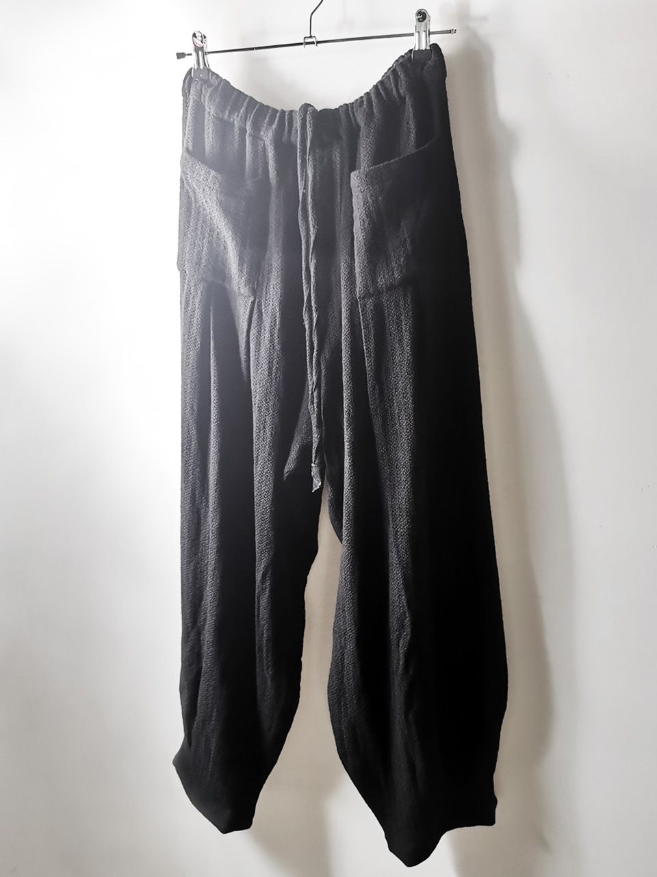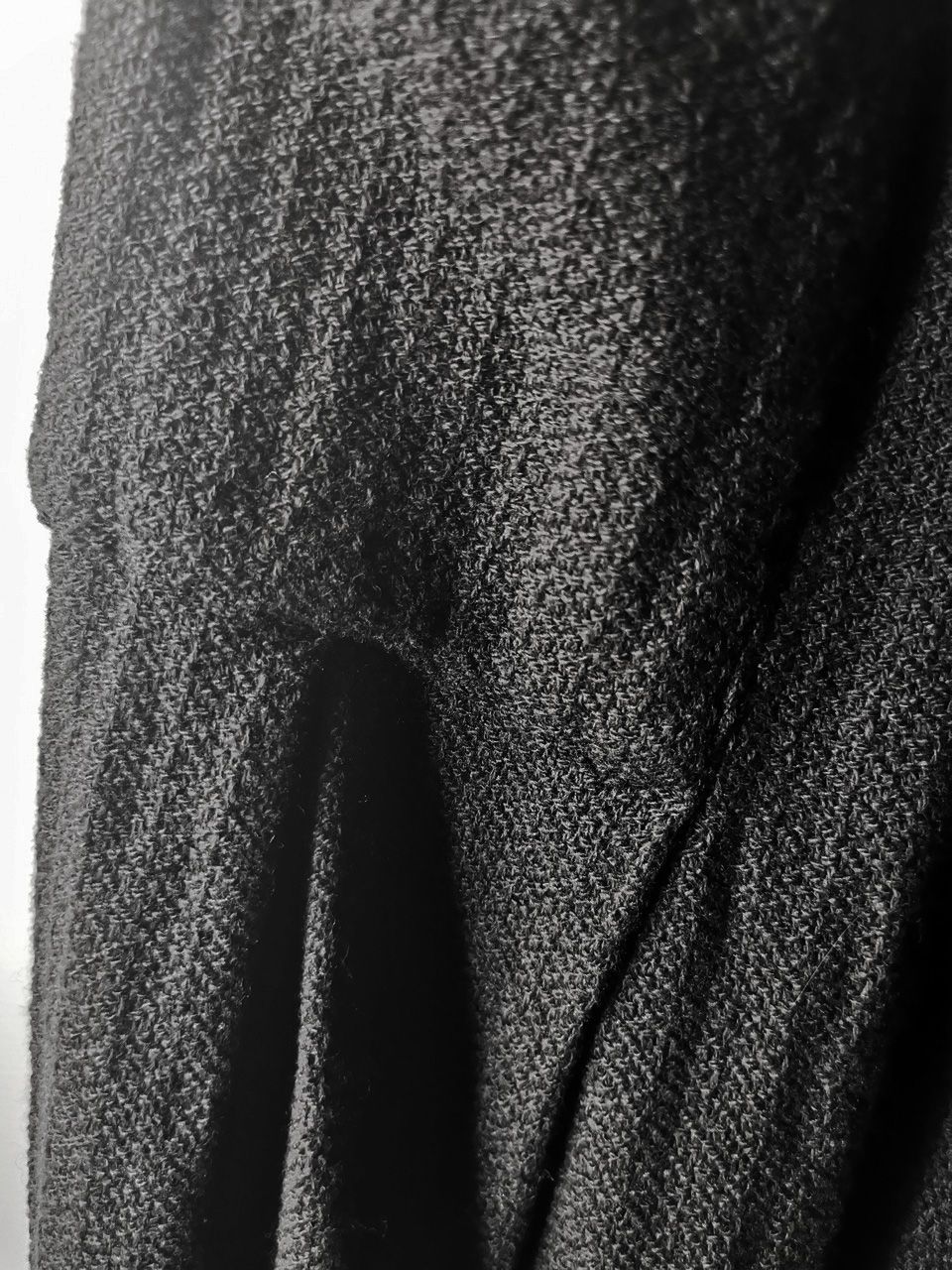 THIS super limited edition GBS Evolution X EV10WP13 handmade trouser design is one of only 4 pieces of its kind currently being made by hand for the entire world, each exclusively from an advanced all-new front and back double-pleated exaggerated volume elastic waist drawstring trouser pattern from our extensive tailoring research, and cut in a new all handwoven "Tosco Lana" pure wool fabric created exclusively for us by the master weaver Carlo Colombo on the 18th century wooden hand looms of Tessitura La Colombina in Badoere di Morgano, Italy---then specially dyed by hand in our our world-famous GBS Superworkrooms at Cavarzere Venezia using a special process which required over 8 hours of painstaking expert work to achieve its special colors, patina effects, shaping, fluid drape and softness. The design features architectural pleating specially placed at 12 different points in tandem with 2 squared-form front patch pockets to achieve a totally innovative new shape and silhouette with extraordinary comfort and ease of wear, expert single-needle stitched tailoring throughout, beautifully finished interior taped seam finishing, drawstrings with handcut vintage Italian leather detail tabs, special pure linen herringbone weave taped hemlines, generous 2,5 centimeter seam allowances on major fitting seams that allow the trouser to be altered and let out, and our world leading pure silk hand dyed label created exclusively for us by Mion SpA in Torreglia which is the first label in the luxury industry to completely eliminate plastic polyester yarns in it–-beautifully attached entirely by hand using pure silk threads.