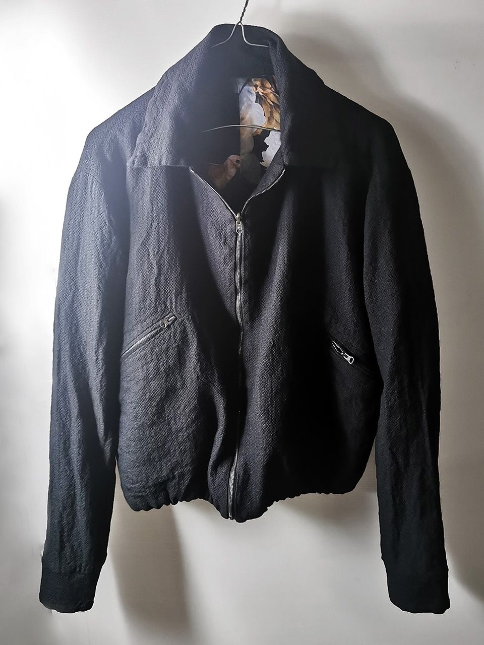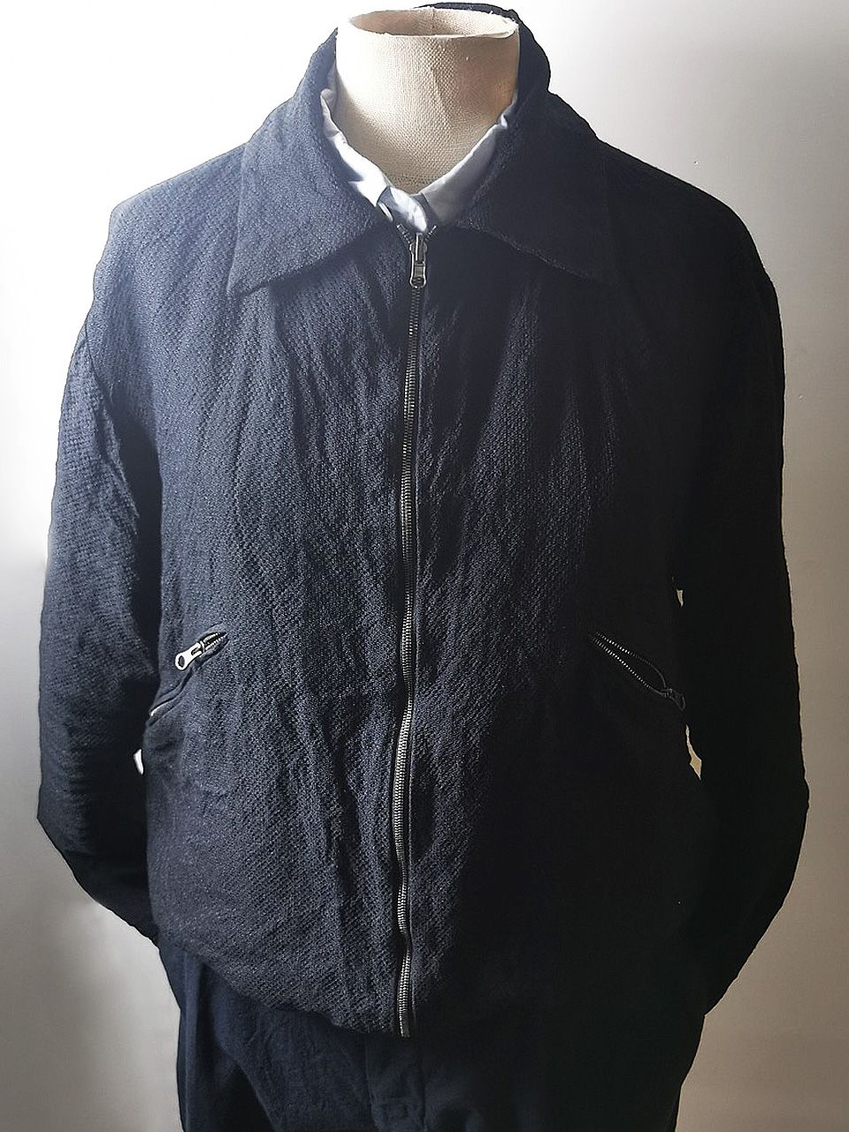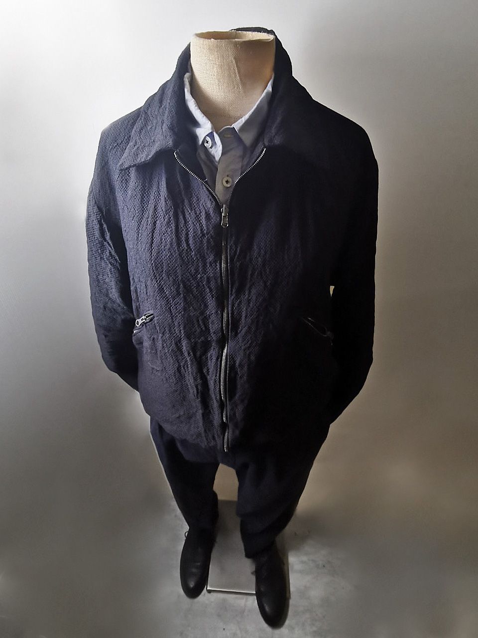 THIS special version of the super limited edition GBS Evolution XI EV11J08 jacket design is one of only 2 pieces of its kind made by hand in the entire world, each exclusively from our original reversible 2-in-1 secret directional styling 1930's bikers blouson jacket reproduction from our extensive tailoring research, and cut using a special textured weave 42% linen, 45% wool, 8% cotton trans-seasonal weight diagonal twill luxury suiting cloth made only for us by the world's leading research fabric maker--Luigi Parisotto in Sarcedo, Vicenza Italy—combined with an exquisite lining story of GBS hand dyed luxurious pure silk 16-momme raso satin exclusive “Uccelli” bird floral print design made for us by the legendary Brenna family in Como, Italy--the world’s leading center for fine silk fabric creation--then individually washed, shaped and treated by hand in our world-famous GBS Superworkrooms at Cavarzere Venezia for extra aging, shaping, and softness. The design features a clean minimalist blouson styling with no waistband and a true 2-in-1 reversible convertible design, hand-cut besom welt pockets fully self-lined in the original precious fabrics for maximum comfort and durability, impeccable top-of-the-line quality Excella dark grey metal reversible front and welt pocket zippers that were specially made to order for us in Japan at YKK’s top-world factory, beautiful clean-finished fully-lined interior construction, generous 2.5 centimeter seam allowances on major fitting seams which allow the jacket to be easily altered for long term wear and service, extraordinary double real horn buttons made only for us by the world's greatest living buttonmakers--Claudio and Cinzia Fontana in Parma, Italy--and our signature real hand-stitched buttonholes (each one required 10-14 minutes to cut and sew) in pure silk Bozzolo Reale Milano Seta threads. The piece is hand-signed and numbered by the designer and also features our world leading pure silk hand-dyed label created exclusively for us by Mion SpA in Torreglia--the first label in the luxury industry to completely eliminate plastic polyester yarns it--beautifully attached inside the pocket entirely by hand using pure silk threads.