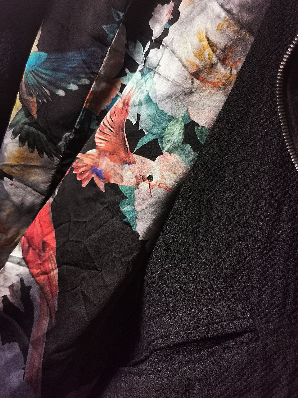 HAND WASHED LUIGI PARISOTTO LINEN, WOOL & COTTON TRANS-SEASONAL TEXTURAL WEAVE LUXURY CLOTH WITH HAND-DYED PURE COMO SILK EXCLUSIVE "UCCELLI" BIRD PRINT FULLY-LINED INTERIOR, DELUXE EXCELLA ZIPPERS, SILK HAND-STITCHED BUTTONHOLES & FONTANA REAL HORN BUTTON DESIGNS