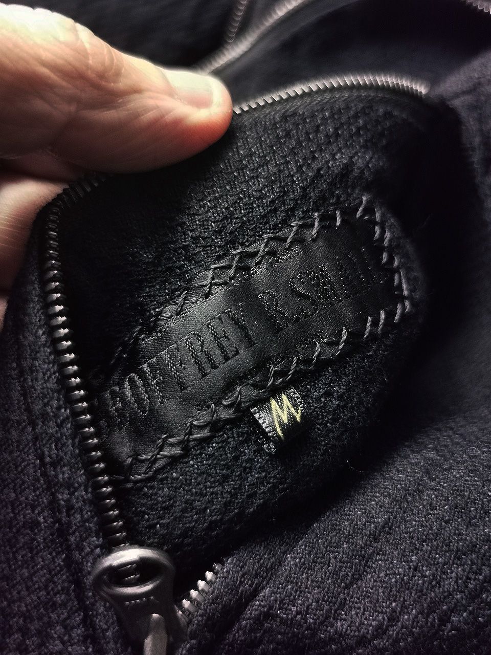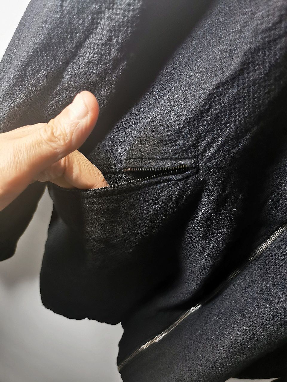 exterior handcut besom pockets with Excella zippers