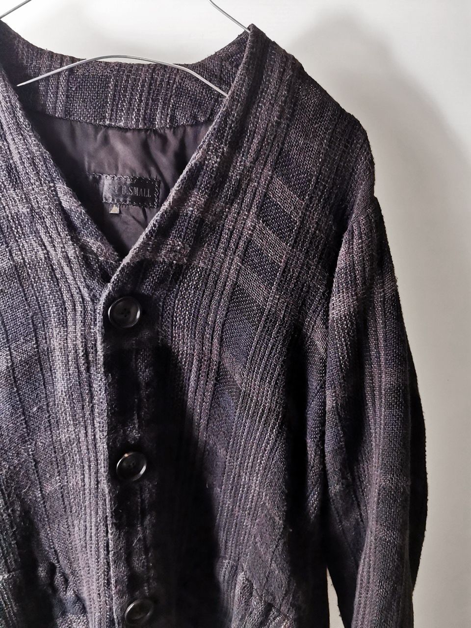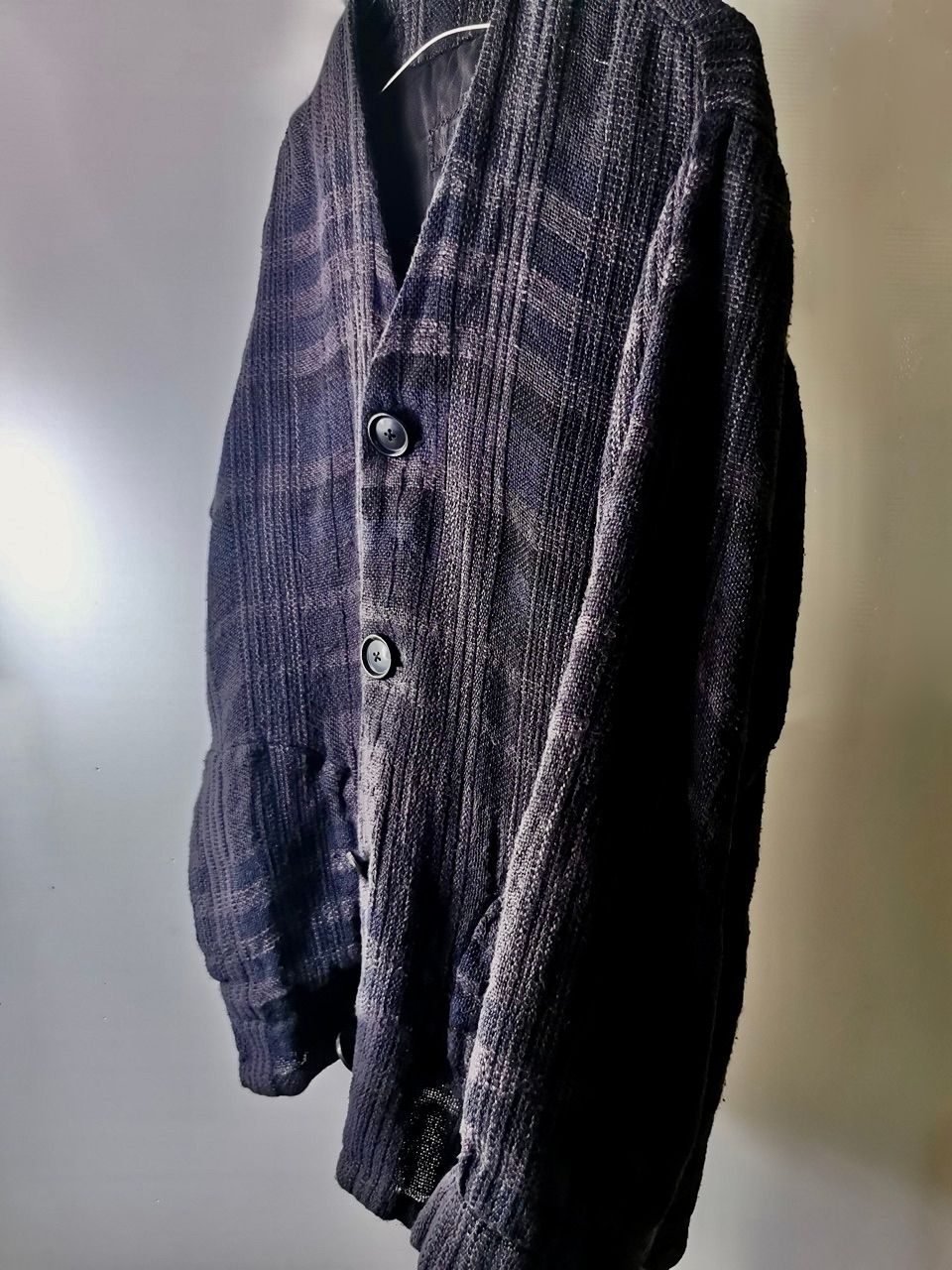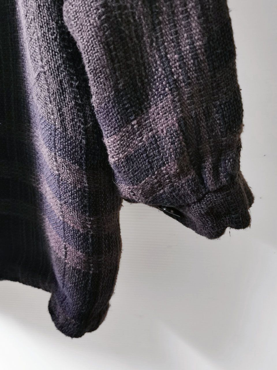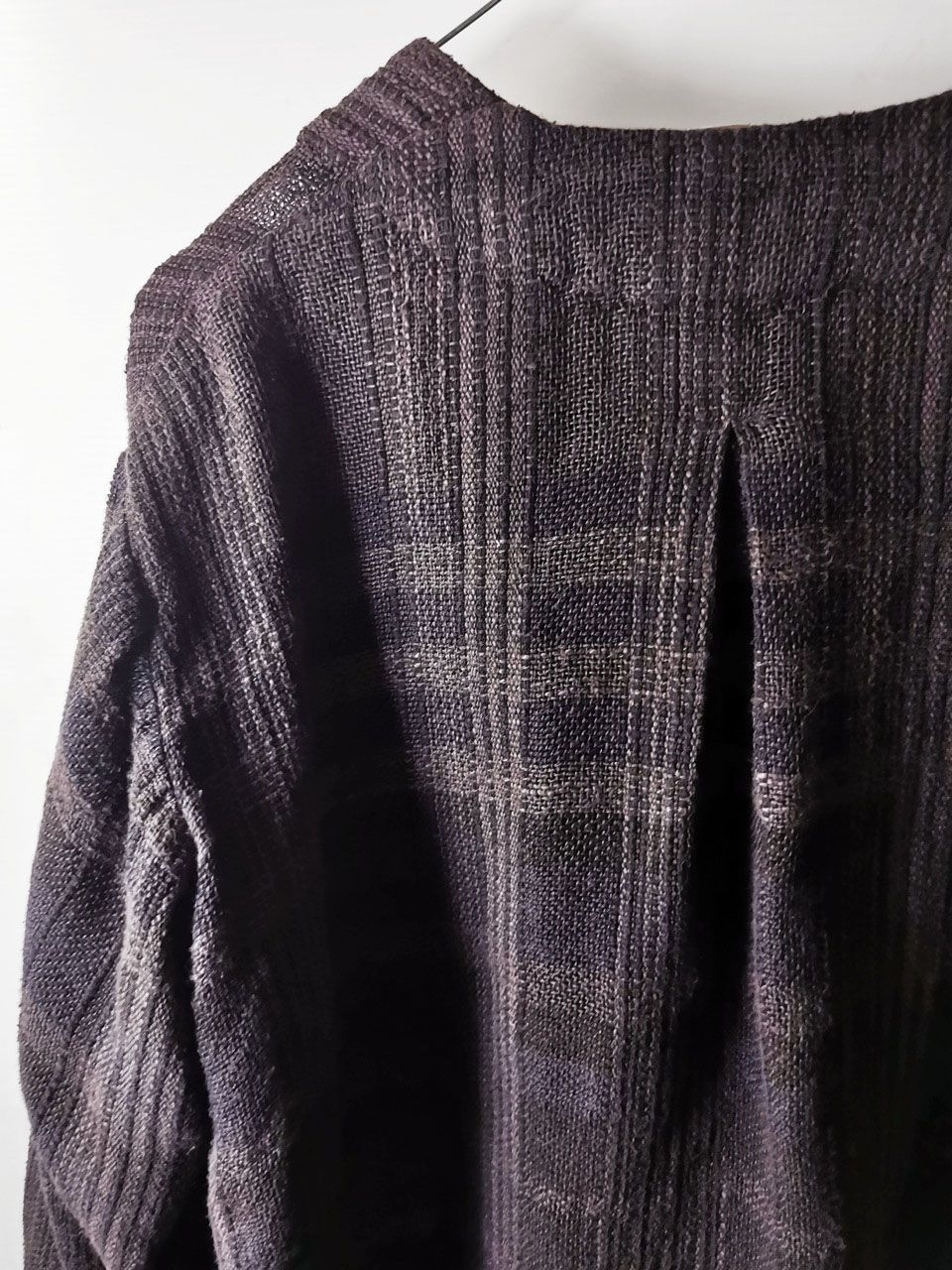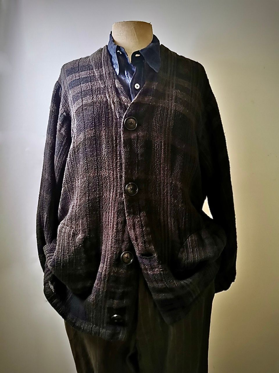 THIS special version of the super limited edition GBS Evolution IX EV9J14 extreme hand-made cardigan design is one of only 3 pieces of its kind made by hand in the entire world each created exclusively from our original 4-button semi-blouson style cardigan based upon a modified early 1900's American baseball shirt pattern. It was cut using a spectacular completely hand-woven Italian silk, linen and cotton yarn textured weave complex plaid check fabric first created exclusively for us by the late master weaver Giuseppe "Pino" Colombo on the 18th century wooden hand looms of Tessitura La Colombina in Badoere di Morgano, Italy requiring almost 2 full days to create just enough cloth to make the single jacket--combined with beautiful half linings in pure silk 16 momme raso satin exclusive paisley print fabric made for us by the legendary Brenna family in Como, Italy--the world's leading center for fine silk fabric creation--along with pure cupro Bemberg-type sleeve linings made for us by Tessitura Mauri also in Como, then specially hand-dyed in our world famous GBS Superworkrooms at Cavarzere Venezia using a process that required over 10 hours of expert work to achieve its unique dark melanzana aubergine eggplant colors, patina effects, shaping and softness. The design features an old world elegant shape with early 20th century baseball accents and an array of immaculate extreme handwork technology detailing and finishing including entirely handstitched pockets with pure silk linings, all hand-sewn collar and front facings, all hand-sewn hems, beautifully clean finished interior with elegantly scalloped silk shoulder linings impeccably finished with Italian cotton taped seams, all hand-stitched luxurious "lucido" gloss finished real horn large form button designs made only for us by the world's greatest living buttonmakers--Claudio and Cinzia Fontana in Collechio di Parma, Italy; and no less than 6 of our signature real hand-stitched buttonholes which required at least 12-18 minutes to create each one, (over 2 hours of painstaking expert work just to make the buttonholes and buttons alone for the single piece) all with pure silk Bozzolo Reale Seta Milan threads which cost over 1.40 euros per meter of thread at current wholesale market valuation. The piece also features our world leading pure silk hand dyed label created exclusively for us by Mion SpA in Torreglia which is the first label in the luxury industry to completely eliminate plastic polyester yarns in it--beautifully attached entirely by hand using pure silk threads. Variations in color and color density are not imperfections or irregularities, but specific characteristics of the special fabric, hand dyeing and hand making techniques.