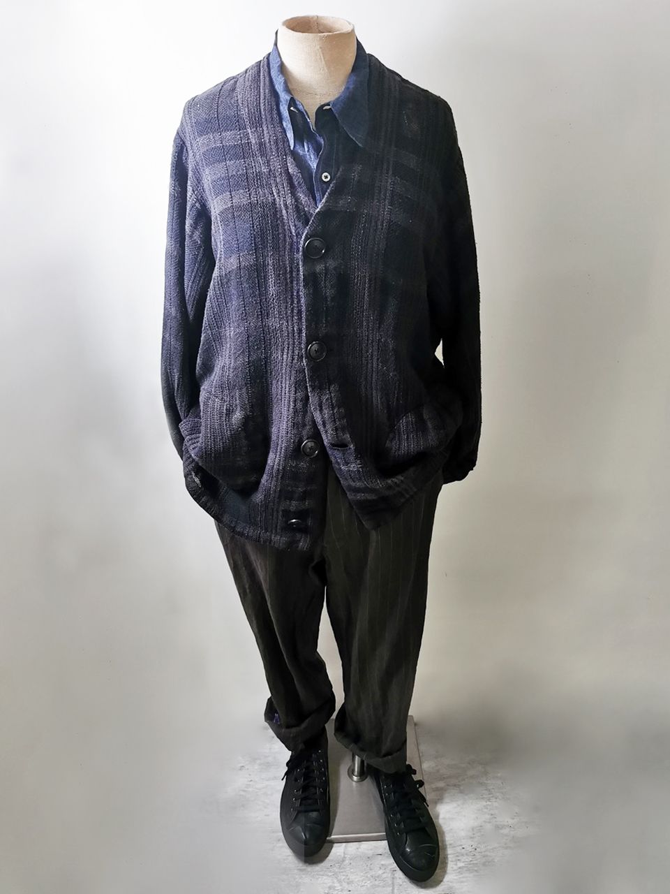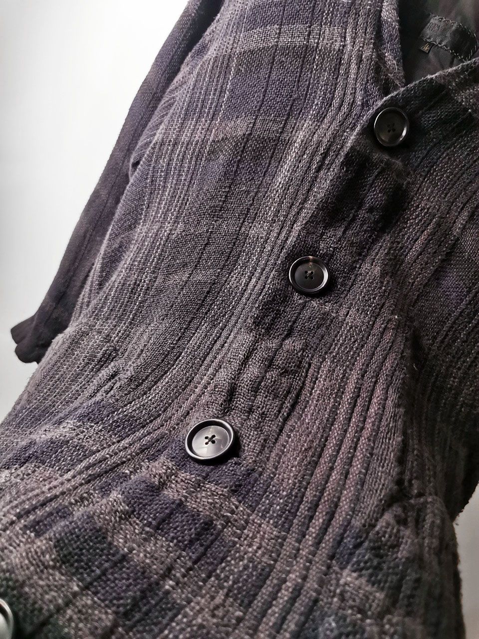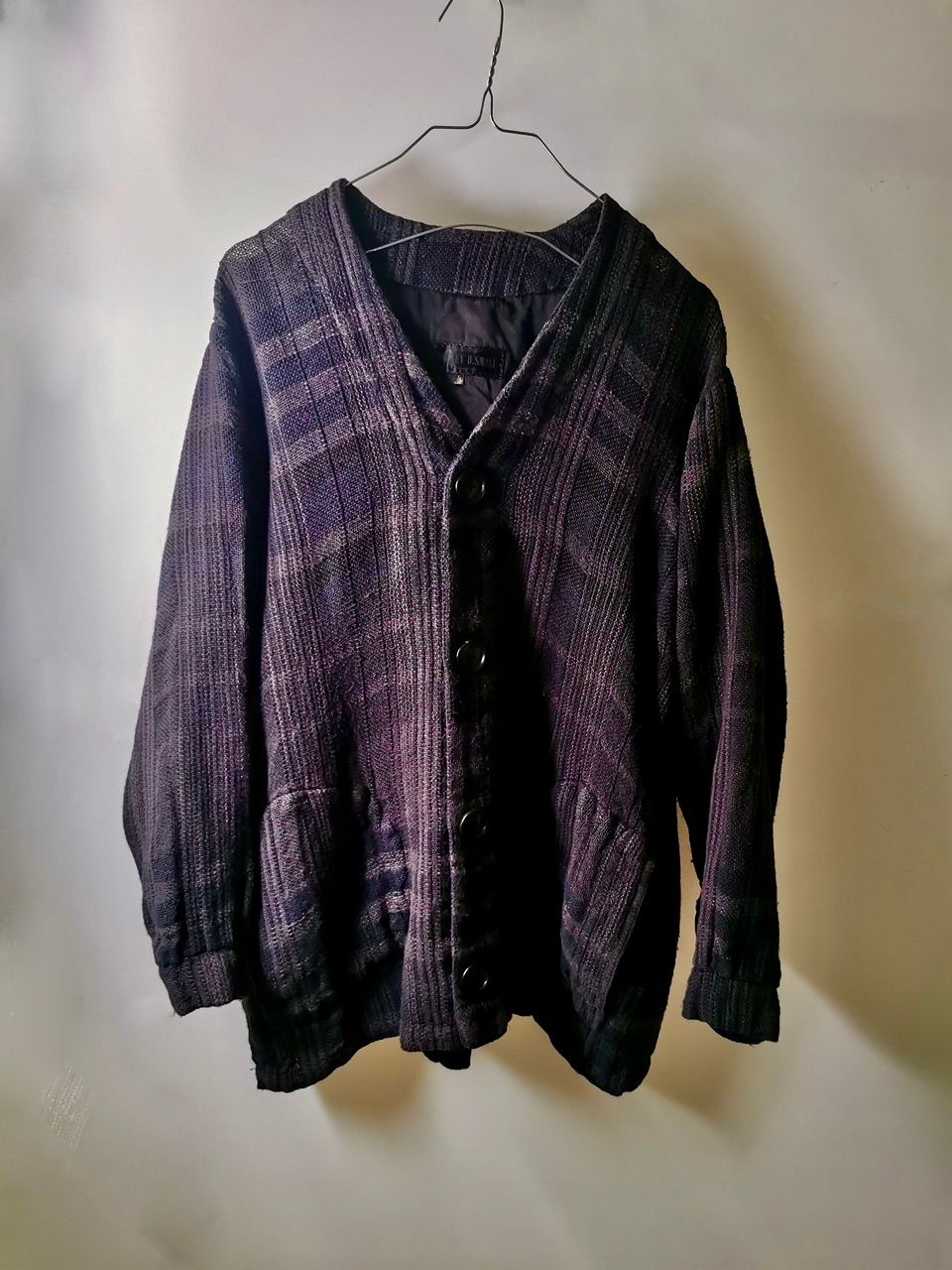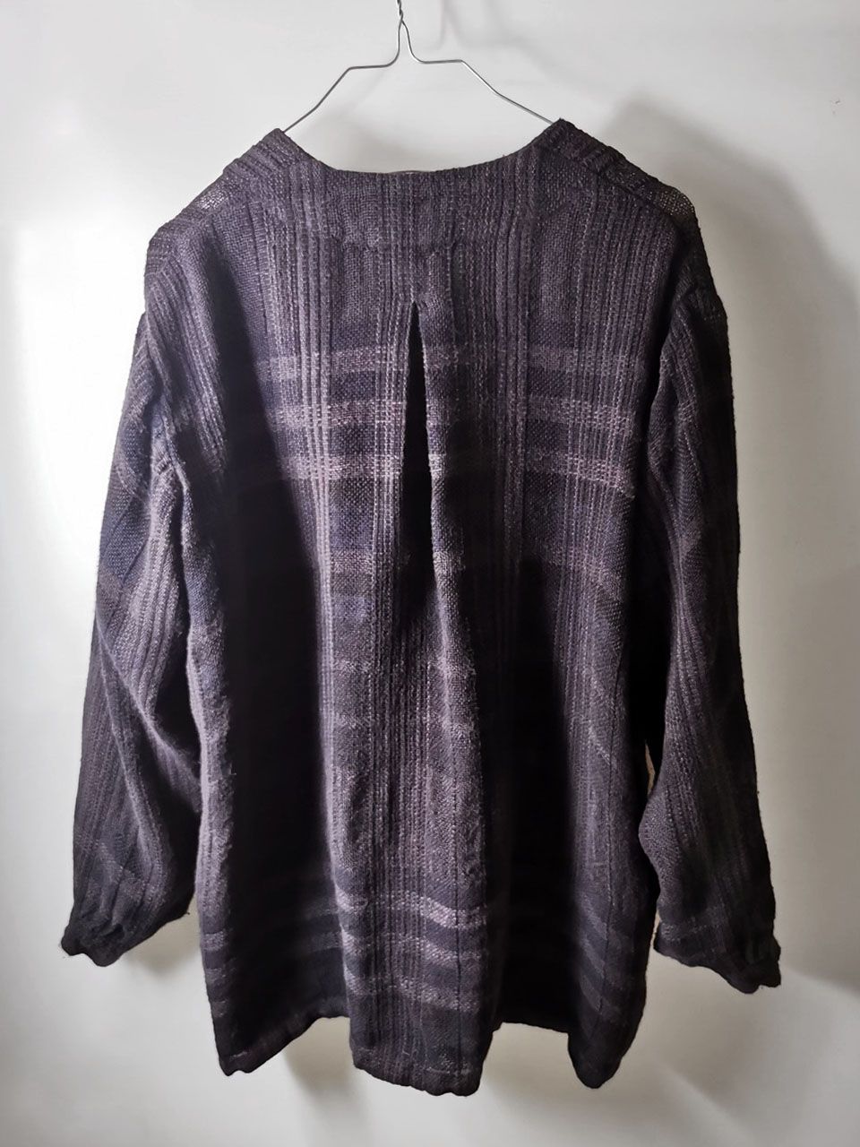 THIS special version of the super limited edition GBS Evolution IX EV9J14 extreme hand-made cardigan design is one of only 3 pieces of its kind made by hand in the entire world each created exclusively from our original 4-button semi-blouson style cardigan based upon a modified early 1900's American baseball shirt pattern. It was cut using a spectacular completely hand-woven Italian silk, linen and cotton yarn textured weave complex plaid check fabric first created exclusively for us by the late master weaver Giuseppe "Pino" Colombo on the 18th century wooden hand looms of Tessitura La Colombina in Badoere di Morgano, Italy requiring almost 2 full days to create just enough cloth to make the single jacket--combined with beautiful half linings in pure silk 16 momme raso satin exclusive paisley print fabric made for us by the legendary Brenna family in Como, Italy--the world's leading center for fine silk fabric creation--along with pure cupro Bemberg-type sleeve linings made for us by Tessitura Mauri also in Como, then specially hand-dyed in our world famous GBS Superworkrooms at Cavarzere Venezia using a process that required over 10 hours of expert work to achieve its unique dark melanzana aubergine eggplant colors, patina effects, shaping and softness. The design features an old world elegant shape with early 20th century baseball accents and an array of immaculate extreme handwork technology detailing and finishing including entirely handstitched pockets with pure silk linings, all hand-sewn collar and front facings, all hand-sewn hems, beautifully clean finished interior with elegantly scalloped silk shoulder linings impeccably finished with Italian cotton taped seams, all hand-stitched luxurious "lucido" gloss finished real horn large form button designs made only for us by the world's greatest living buttonmakers--Claudio and Cinzia Fontana in Collechio di Parma, Italy; and no less than 6 of our signature real hand-stitched buttonholes which required at least 12-18 minutes to create each one, (over 2 hours of painstaking expert work just to make the buttonholes and buttons alone for the single piece) all with pure silk Bozzolo Reale Seta Milan threads which cost over 1.40 euros per meter of thread at current wholesale market valuation. The piece also features our world leading pure silk hand dyed label created exclusively for us by Mion SpA in Torreglia which is the first label in the luxury industry to completely eliminate plastic polyester yarns in it--beautifully attached entirely by hand using pure silk threads. Variations in color and color density are not imperfections or irregularities, but specific characteristics of the special fabric, hand dyeing and hand making techniques.