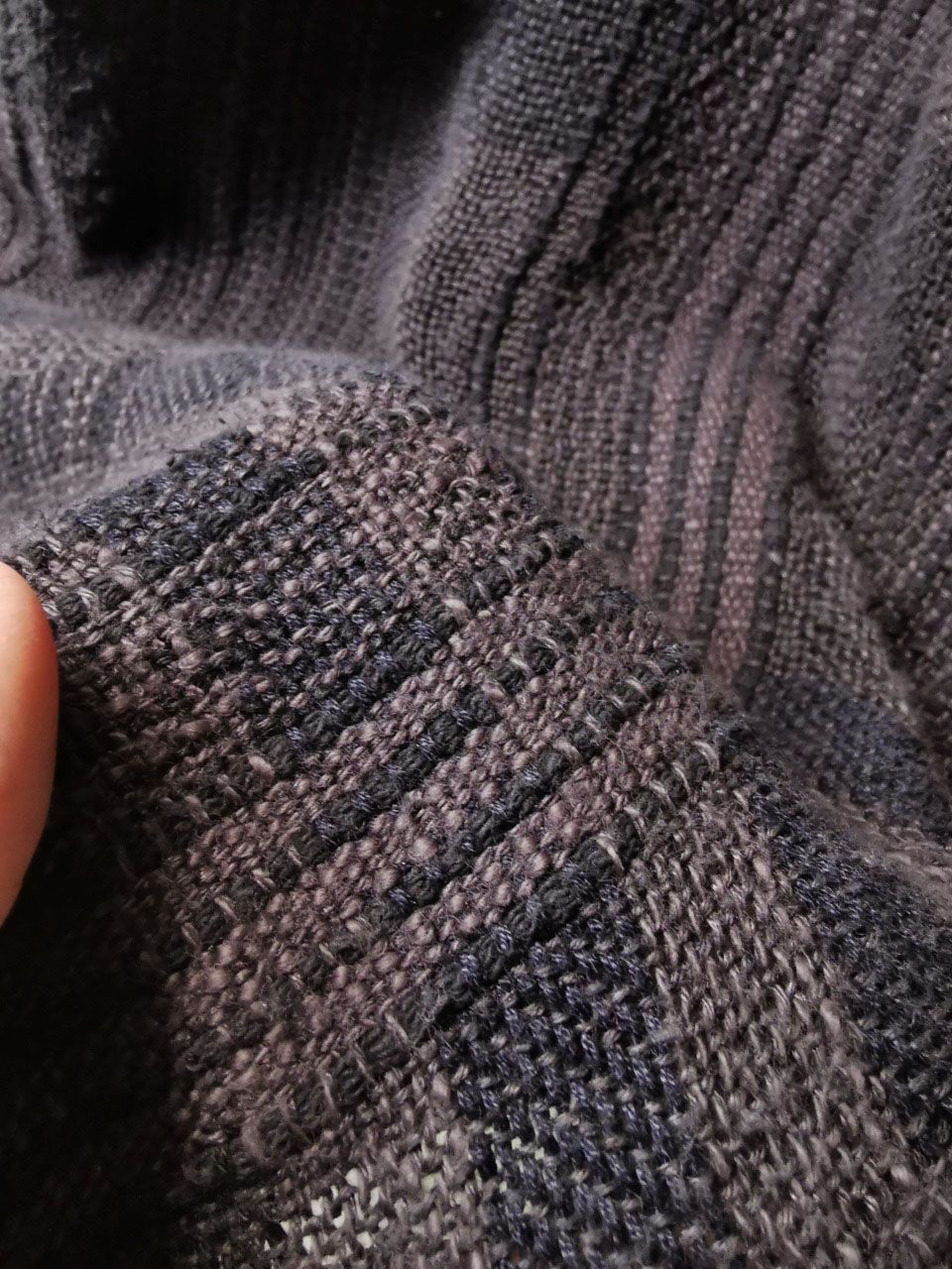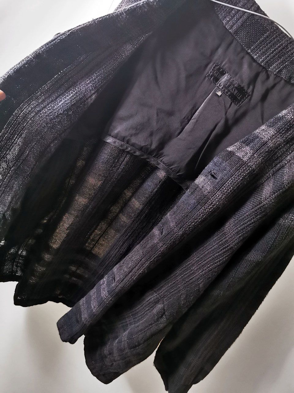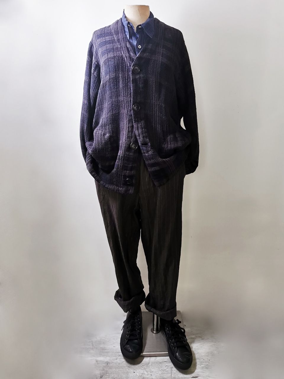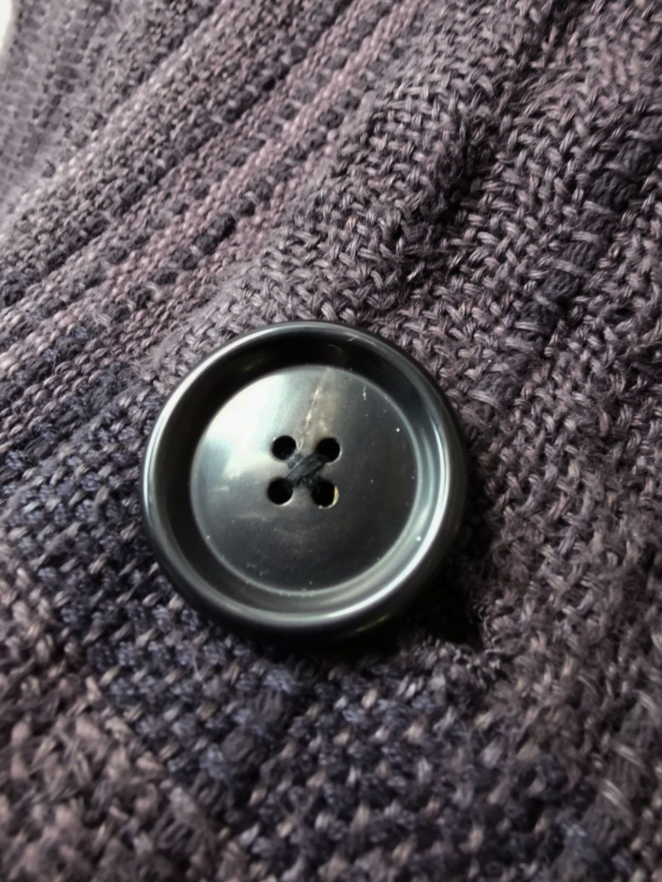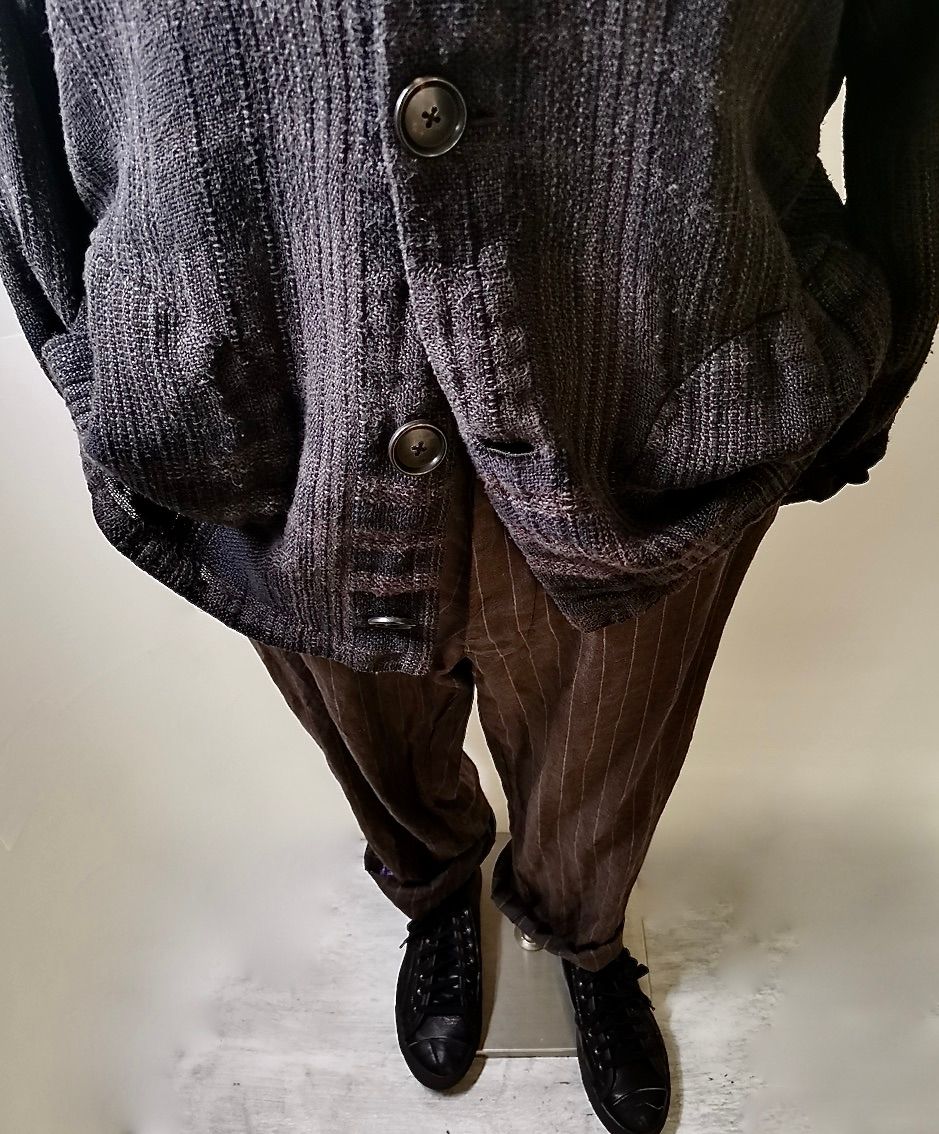 THIS special version of the super limited edition GBS Evolution IX EV9J14 extreme hand-made cardigan design is one of only 3 pieces of its kind made by hand in the entire world each created exclusively from our original 4-button semi-blouson style cardigan based upon a modified early 1900's American baseball shirt pattern. It was cut using a spectacular completely hand-woven Italian silk, linen and cotton yarn textured weave complex plaid check fabric first created exclusively for us by the late master weaver Giuseppe "Pino" Colombo on the 18th century wooden hand looms of Tessitura La Colombina in Badoere di Morgano, Italy requiring almost 2 full days to create just enough cloth to make the single jacket--combined with beautiful half linings in pure silk 16 momme raso satin exclusive paisley print fabric made for us by the legendary Brenna family in Como, Italy--the world's leading center for fine silk fabric creation--along with pure cupro Bemberg-type sleeve linings made for us by Tessitura Mauri also in Como, then specially hand-dyed in our world famous GBS Superworkrooms at Cavarzere Venezia using a process that required over 10 hours of expert work to achieve its unique dark melanzana aubergine eggplant colors, patina effects, shaping and softness. The design features an old world elegant shape with early 20th century baseball accents and an array of immaculate extreme handwork technology detailing and finishing including entirely handstitched pockets with pure silk linings, all hand-sewn collar and front facings, all hand-sewn hems, beautifully clean finished interior with elegantly scalloped silk shoulder linings impeccably finished with Italian cotton taped seams, all hand-stitched luxurious "lucido" gloss finished real horn large form button designs made only for us by the world's greatest living buttonmakers--Claudio and Cinzia Fontana in Collechio di Parma, Italy; and no less than 6 of our signature real hand-stitched buttonholes which required at least 12-18 minutes to create each one, (over 2 hours of painstaking expert work just to make the buttonholes and buttons alone for the single piece) all with pure silk Bozzolo Reale Seta Milan threads which cost over 1.40 euros per meter of thread at current wholesale market valuation. The piece also features our world leading pure silk hand dyed label created exclusively for us by Mion SpA in Torreglia which is the first label in the luxury industry to completely eliminate plastic polyester yarns in it--beautifully attached entirely by hand using pure silk threads. Variations in color and color density are not imperfections or irregularities, but specific characteristics of the special fabric, hand dyeing and hand making techniques.