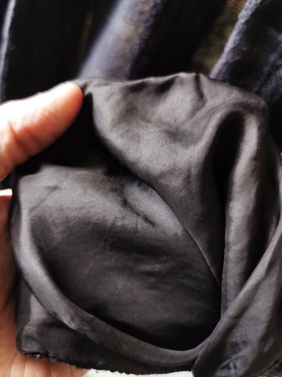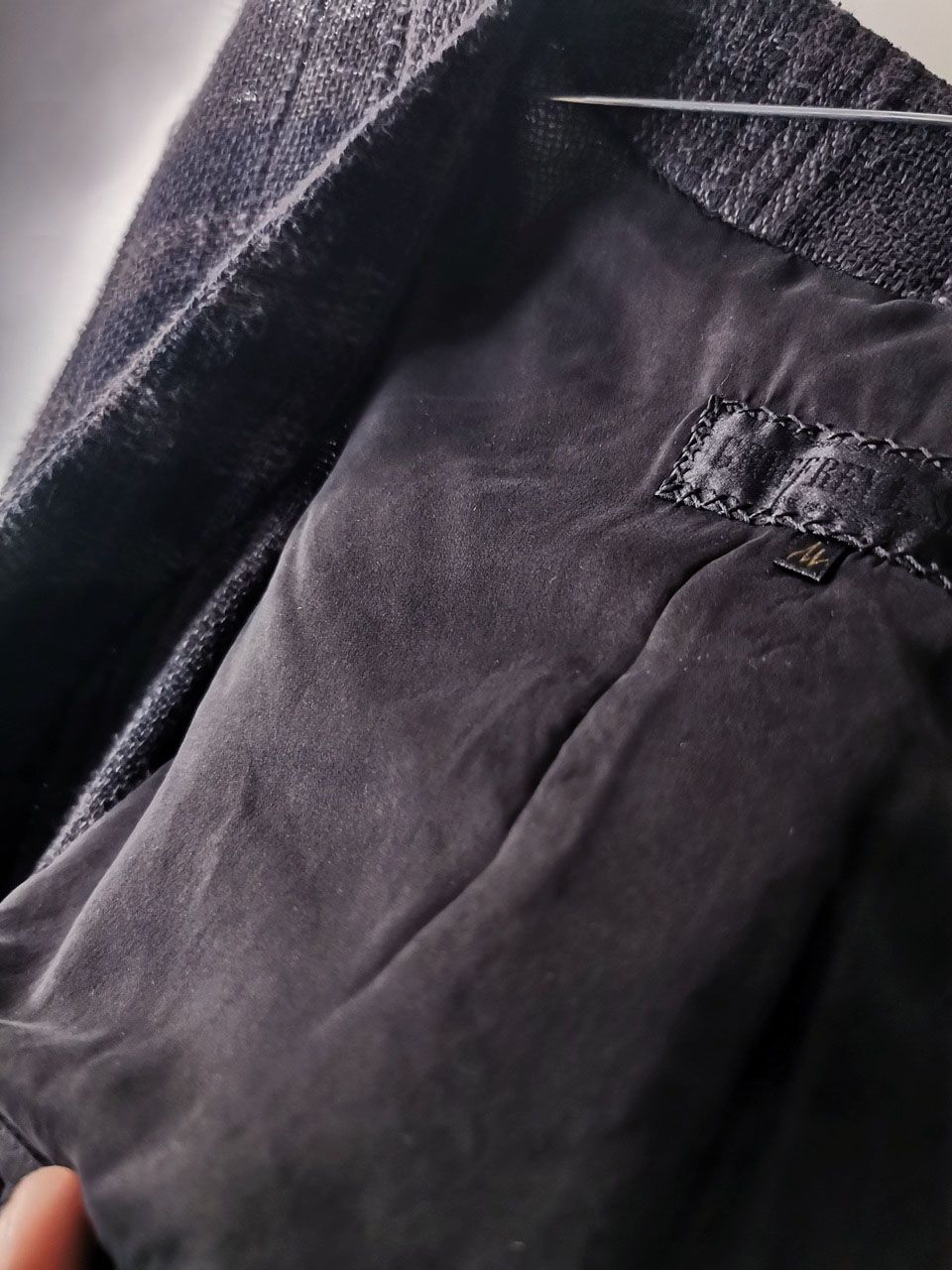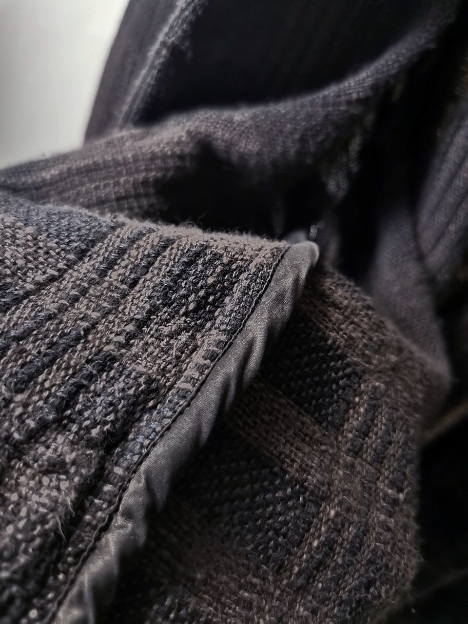 ...combined with beautiful half linings in pure silk 16 momme raso satin exclusive fabric made for us by the legendary Brenna family in Como, Italy--the world's leading center for fine silk fabric creation--and pure cupro Bemberg-type sleeve linings made for us by Tessitura Mauri also in Como…