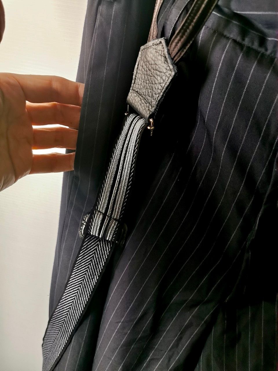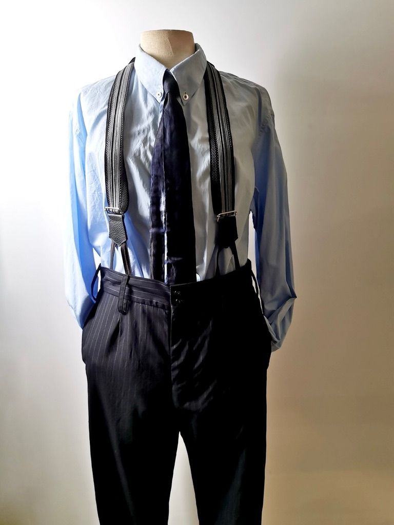 The special handmade trousers also feature a classic darted front design with impeccable handbuilt hidden-button fly front construction, handcut rear besom flap pockets, beautifully clean-finished fully-lined interior with Italian satin taped seam construction, real hand cut vintage recycle garment leather suspenders using special silk, cotton and wool trim tapes woven specially for us by the reknowned Nastrificio Victor mills in Piove di Sacco Padova...