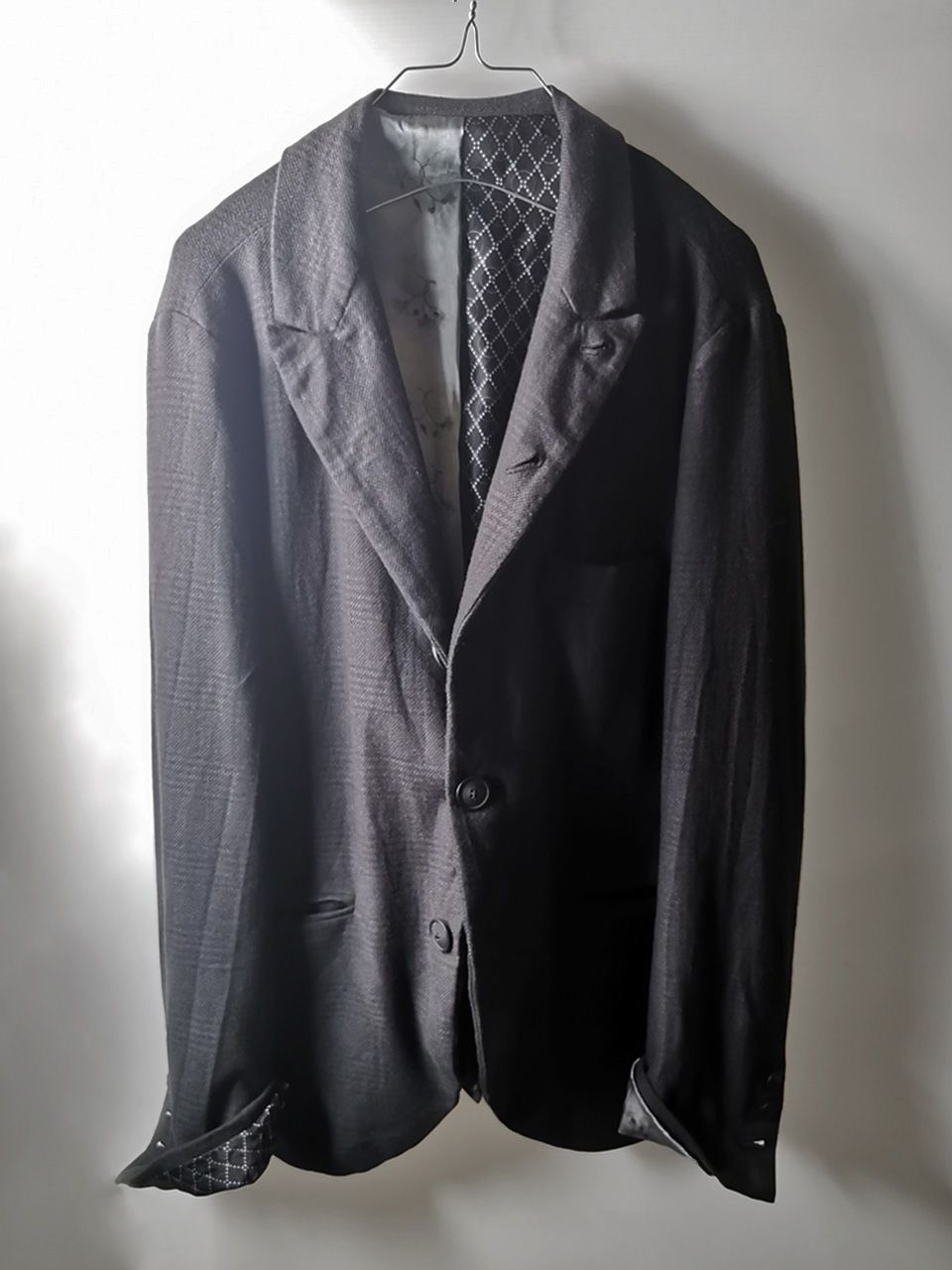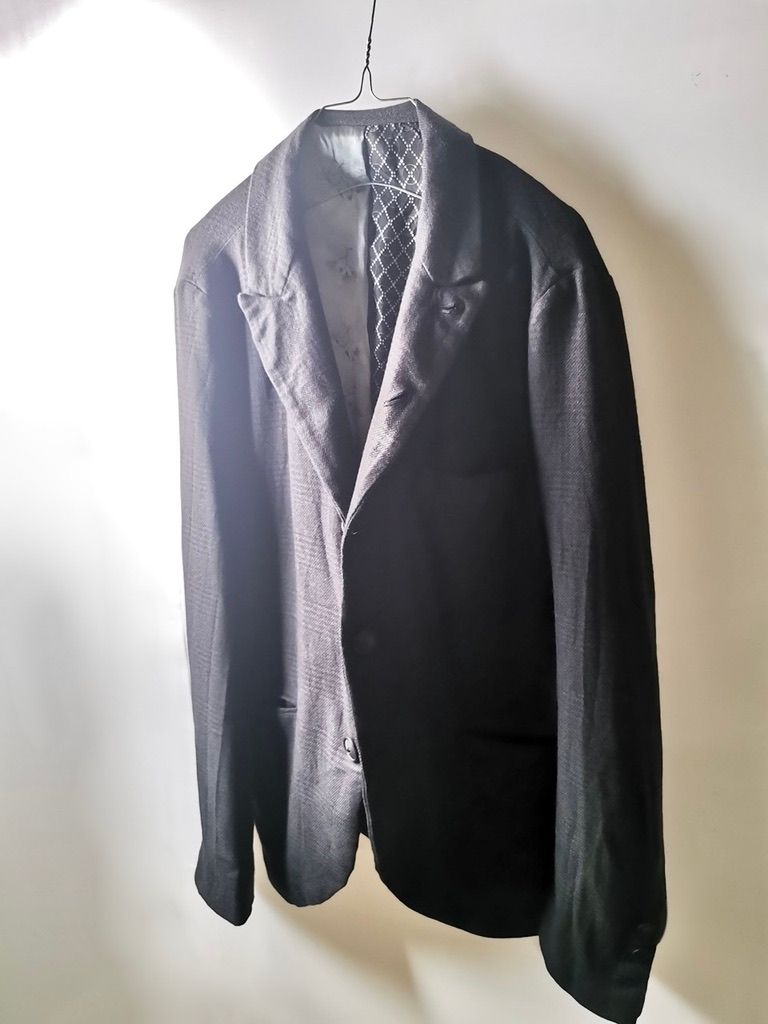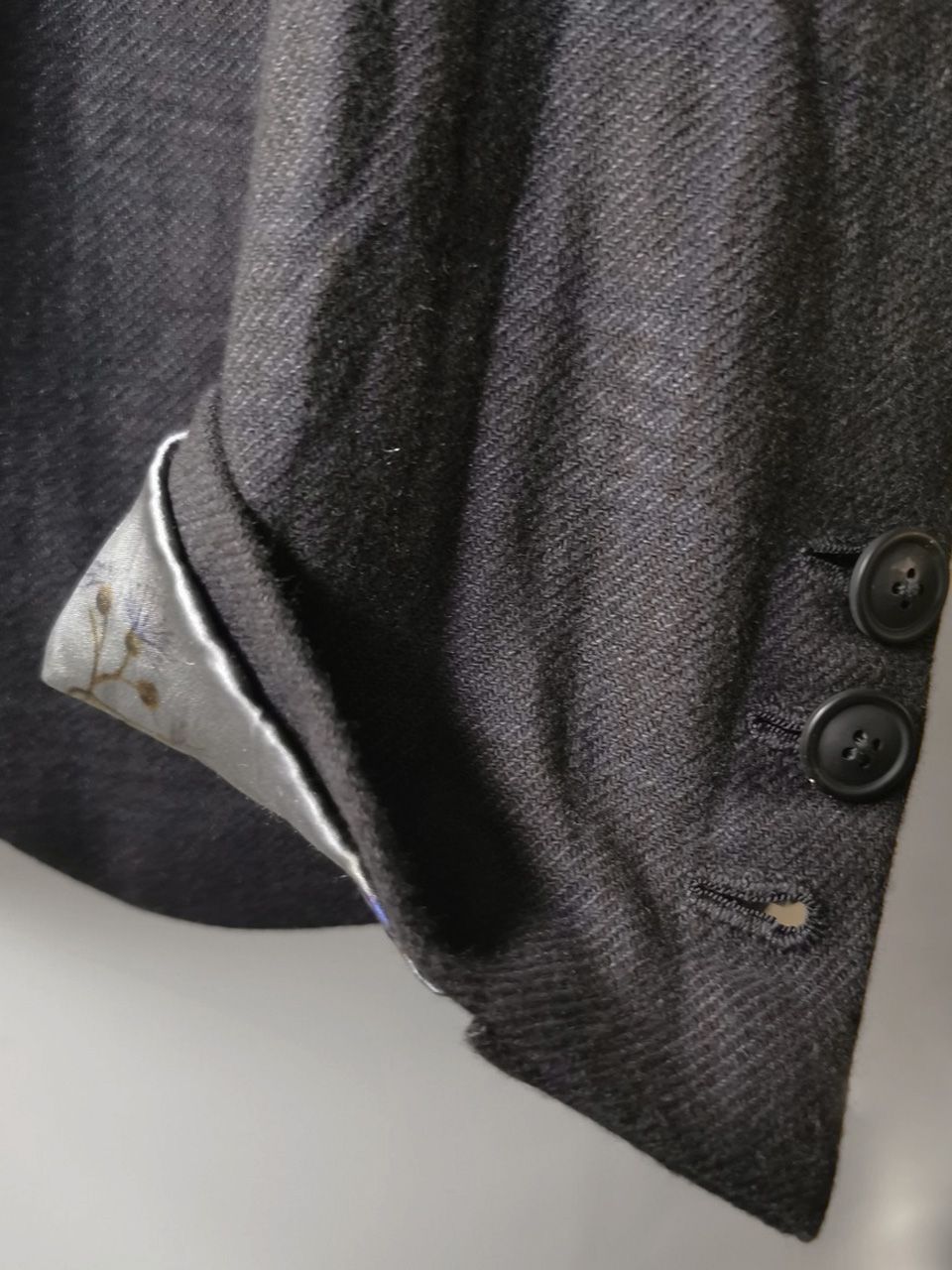THIS special version of the super limited edition NNJ05 5-button handmade archive 2010 jacket is one of only 6 pieces of its kind made by hand in the entire world, each created exclusively for Eth0s in Shanghai from our 1910’s 5-button peak lapel original jacket pattern, and cut in a superlux pure Alashan wollenspun cashmere suiting cloth woven only for us by the oldest still operating woolen mill in the world and the world’s most respected cashmere fabric makers--Fratelli Piacenza 1733 in Pollone, Biella, Italy--combined with an exquisite pure silk 16 momme raso satin exclusive geometric and Botticelli floral print composition lining story made only for us by the legendary Brenna family in Como, Italy--the world's leading center for fine silk fabric creation--then specially multiple hand-dyed, washed and treated in our world-famous GBS Superworkrooms at Cavarzere Venezia using a series of processes that required over 27 hours of master work to achieve its special uneven colors, patina effects, shaping, and incredible softness and drape. The design features real handmade working buttonhole surgeon’s sleeve cuffs, impeccable handcut and constructed besom and welt pockets throughout--each fully self-lined in the precious Alashan wollenspun cashmere fabric for maximum hand comfort and durability, carefully cut and sewn expert matching plaid tailoring work, beautifully finished fully-lined interior construction with hand cut center back vent, generous 2,5 centimeter seam allowances on major fitting seams that allow the piece to be altered and let out for long term wear and service, all handsewn hemwork inside, an elegant button story of exceptional real horn button designs created only for us by the world’s greatest living buttonmakers--Claudio and Cinzia Fontana in Parma, Italy--and no less than 11 of our signature real hand stitched buttonholes (each one required 10-14 minutes to cut and sew) in luxurious pure silk Bozzolo Reale Milano Seta thread…and is handsigned and numbered by the designer. The piece also features our world leading pure silk label created exclusively for us by Mion SpA in Torreglia which is the first label in the luxury industry to completely eliminate plastic polyester yarns in it-- beautifully attached entirely by hand with pure silk threads.Variations in color and color density are not imperfections or irregularities, but specific characteristics of the special hand dyeing and hand making technique. Please treat buttons and buttonholes with extreme care.
