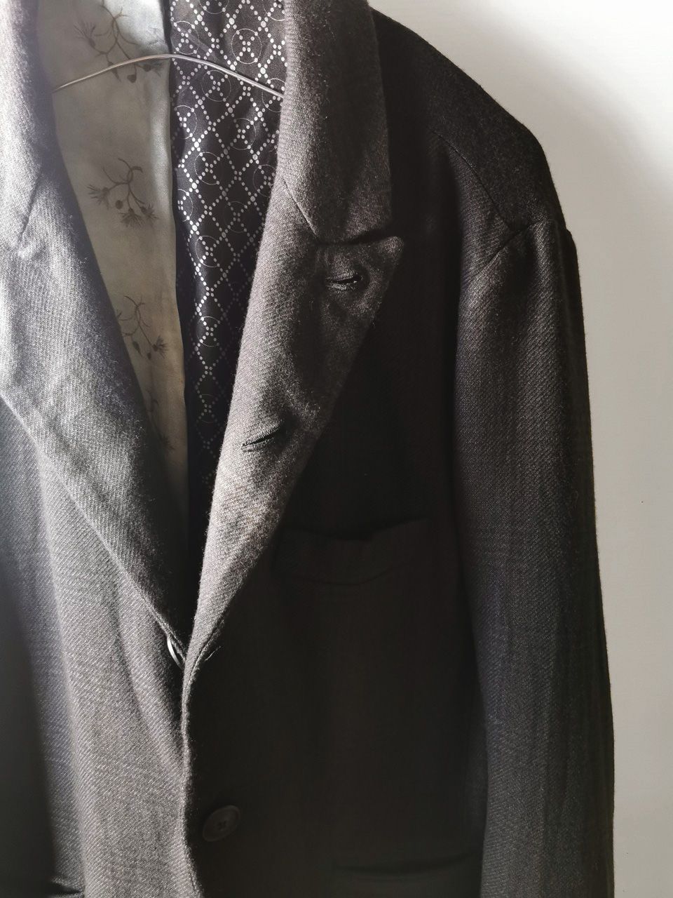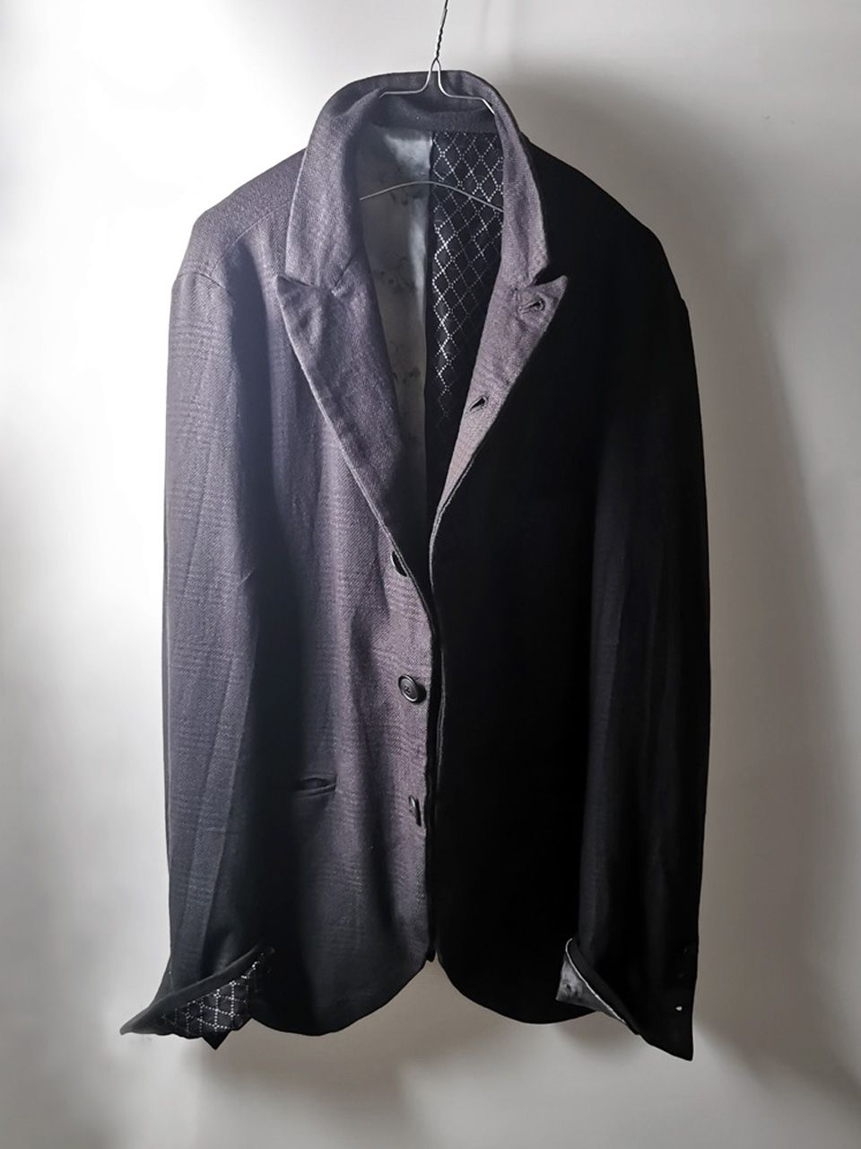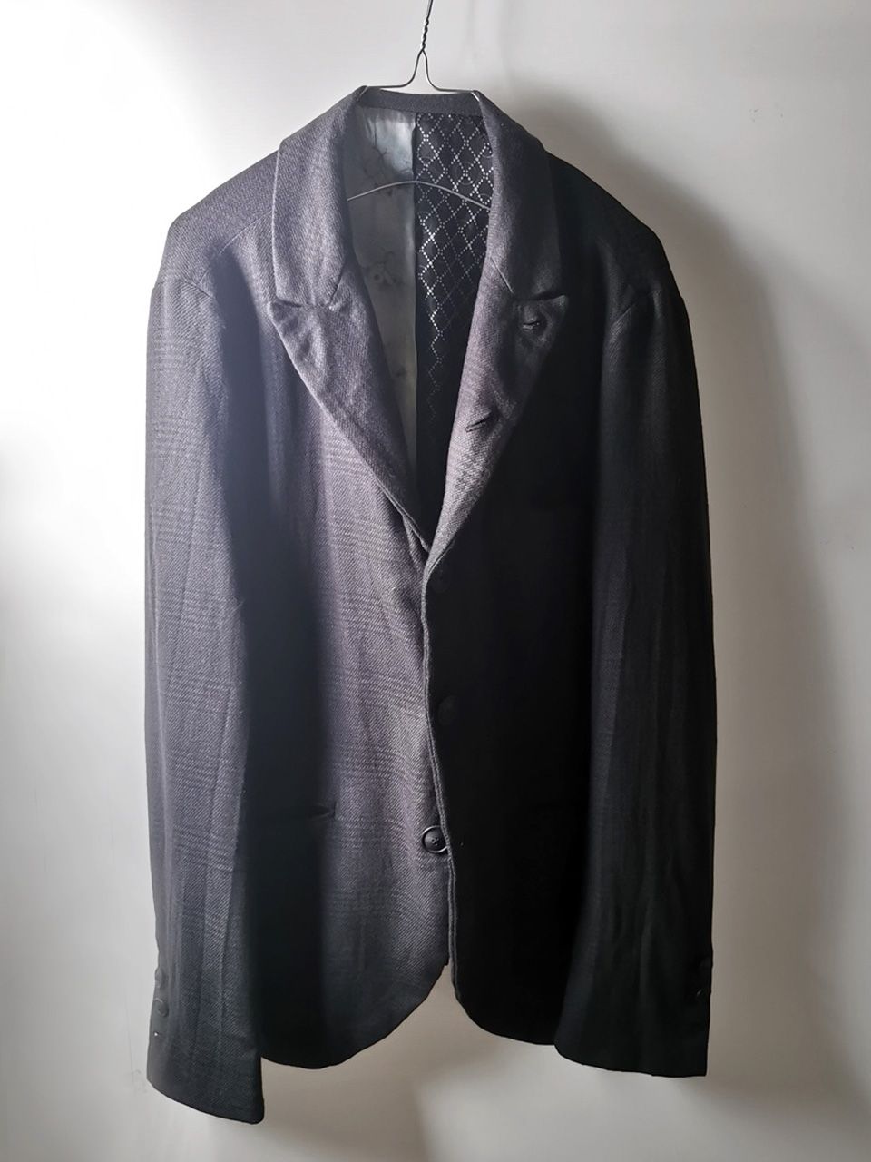 THIS special version of the super limited edition NNJ05 5-button handmade archive 2010 jacket is one of only 6 pieces of its kind made by hand in the entire world, each created exclusively for Eth0s in Shanghai from our 1910’s 5-button peak lapel original jacket pattern, and cut in a superlux pure Alashan wollenspun cashmere suiting cloth woven only for us by the oldest still operating woolen mill in the world and the world’s most respected cashmere fabric makers--Fratelli Piacenza 1733 in Pollone, Biella, Italy--combined with an exquisite pure silk 16 momme raso satin exclusive geometric and Botticelli floral print composition lining story made only for us by the legendary Brenna family in Como, Italy--the world's leading center for fine silk fabric creation--then specially multiple hand-dyed, washed and treated in our world-famous GBS Superworkrooms at Cavarzere Venezia using a series of processes that required over 27 hours of master work to achieve its special uneven colors, patina effects, shaping, and incredible softness and drape. The design features real handmade working buttonhole surgeon’s sleeve cuffs, impeccable handcut and constructed besom and welt pockets throughout--each fully self-lined in the precious Alashan wollenspun cashmere fabric for maximum hand comfort and durability, carefully cut and sewn expert matching plaid tailoring work, beautifully finished fully-lined interior construction with hand cut center back vent, generous 2,5 centimeter seam allowances on major fitting seams that allow the piece to be altered and let out for long term wear and service, all handsewn hemwork inside, an elegant button story of exceptional real horn button designs created only for us by the world’s greatest living buttonmakers--Claudio and Cinzia Fontana in Parma, Italy--and no less than 11 of our signature real hand stitched buttonholes (each one required 10-14 minutes to cut and sew) in luxurious pure silk Bozzolo Reale Milano Seta thread…and is handsigned and numbered by the designer. The piece also features our world leading pure silk label created exclusively for us by Mion SpA in Torreglia which is the first label in the luxury industry to completely eliminate plastic polyester yarns in it-- beautifully attached entirely by hand with pure silk threads.Variations in color and color density are not imperfections or irregularities, but specific characteristics of the special hand dyeing and hand making technique. Please treat buttons and buttonholes with extreme care.