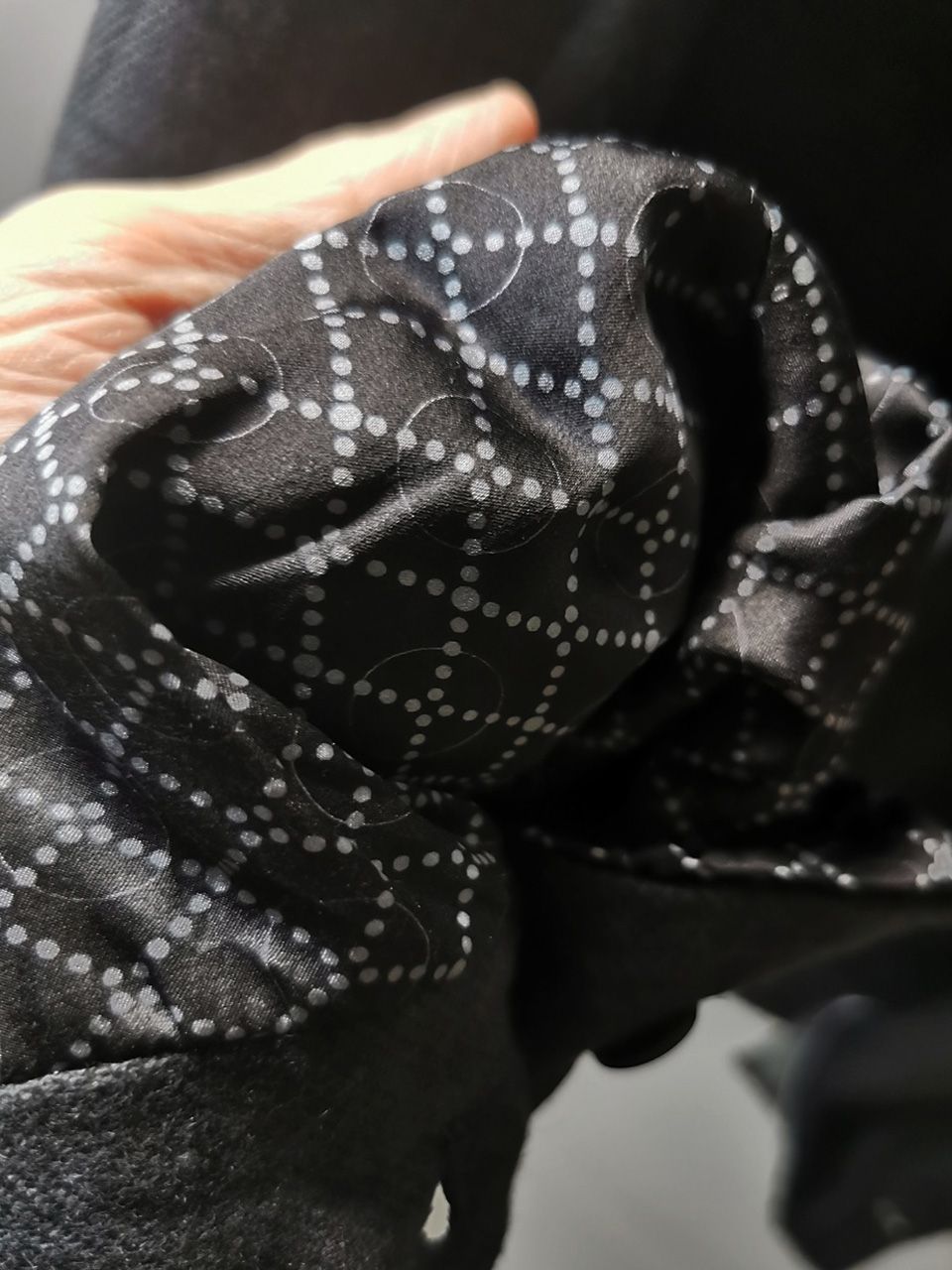 …The piece also features our world leading pure silk label created exclusively for us by Mion SpA in Torreglia which is the first label in the luxury industry to completely eliminate plastic polyester yarns in it--beautifully attached entirely by hand with pure silk threads.