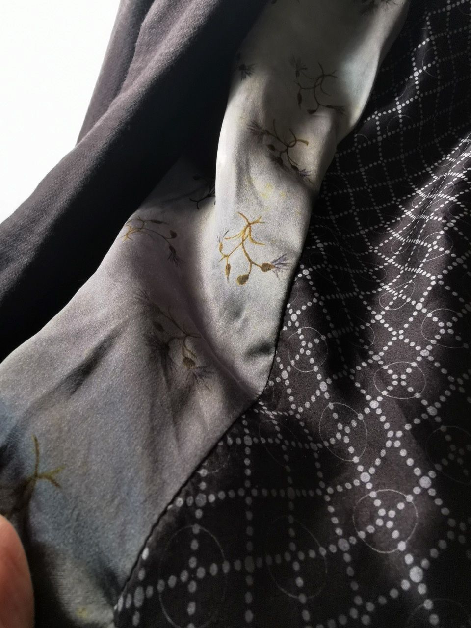 …combined with an exquisite pure silk 16 momme raso satin exclusive geometric and Botticelli floral print composition lining story made only for us by the legendary Brenna family in Como, Italy--the world's leading center for fine silk fabric creation…