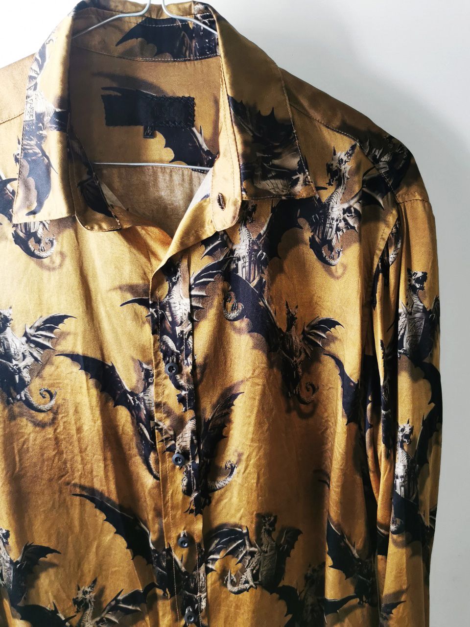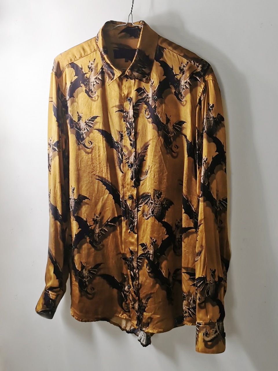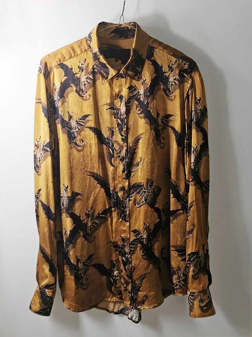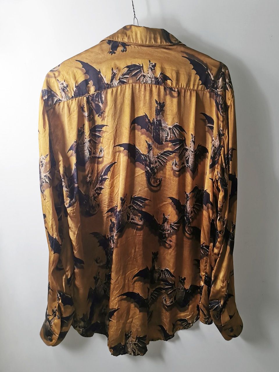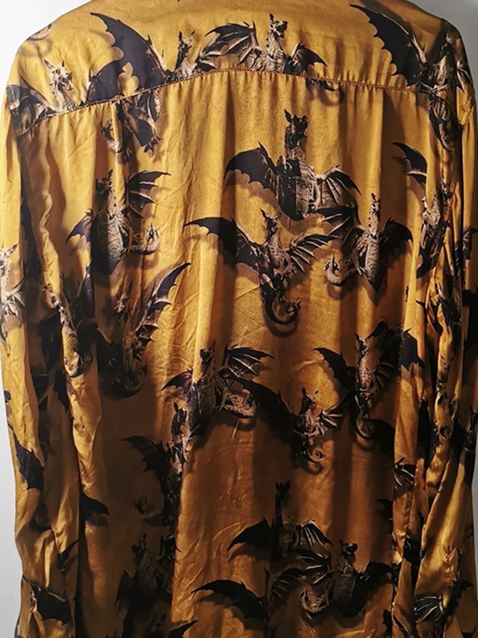 THIS special version of the super limited edition RNS12 shirt design is one of only 9 pieces of its kind made by hand in the entire world from a classic European cut tailored shirt pattern from our extensive tailoring research and cut using a luxurious pure silk 16-momme raso satin exclusive Darklands Berlin “Gryphons” print design developed by Estefania Campillo, and made only for us by the legendary Brenna family in Como, Italy--the world’s leading center for fine silk fabric creation--then specially washed and treated by hand in our world-famous GBS Superworkrooms at Cavarzere Venezia for extra aging, shaping, drape and softness. The design features an impeccable classic European tailored men’s shirt cut and design, expert single-needle stitching throughout, beautifully clean-finished all French-seamed interior construction, uniquely balanced cut, fit and design, extraordinary real horn shirt shirt button designs made for us by the world's greatest living buttonmakers--Claudio and Cinzia Fontana in Parma, Italy; and no less than 12 of our signature real hand sewn buttonholes in pure silk Bozzolo Milano Seta Reale threads, each one required 10-12 minutes to cut and sew (over 2 hours of painstaking expert work just to make the buttonholes alone for a single shirt). The piece also features our world leading hand dyed pure silk label created exclusively for us by Mion SpA in Torreglia which is the first label in the luxury industry to completely eliminate plastic polyester yarns in it--beautifully attached entirely by hand with pure silk threads.