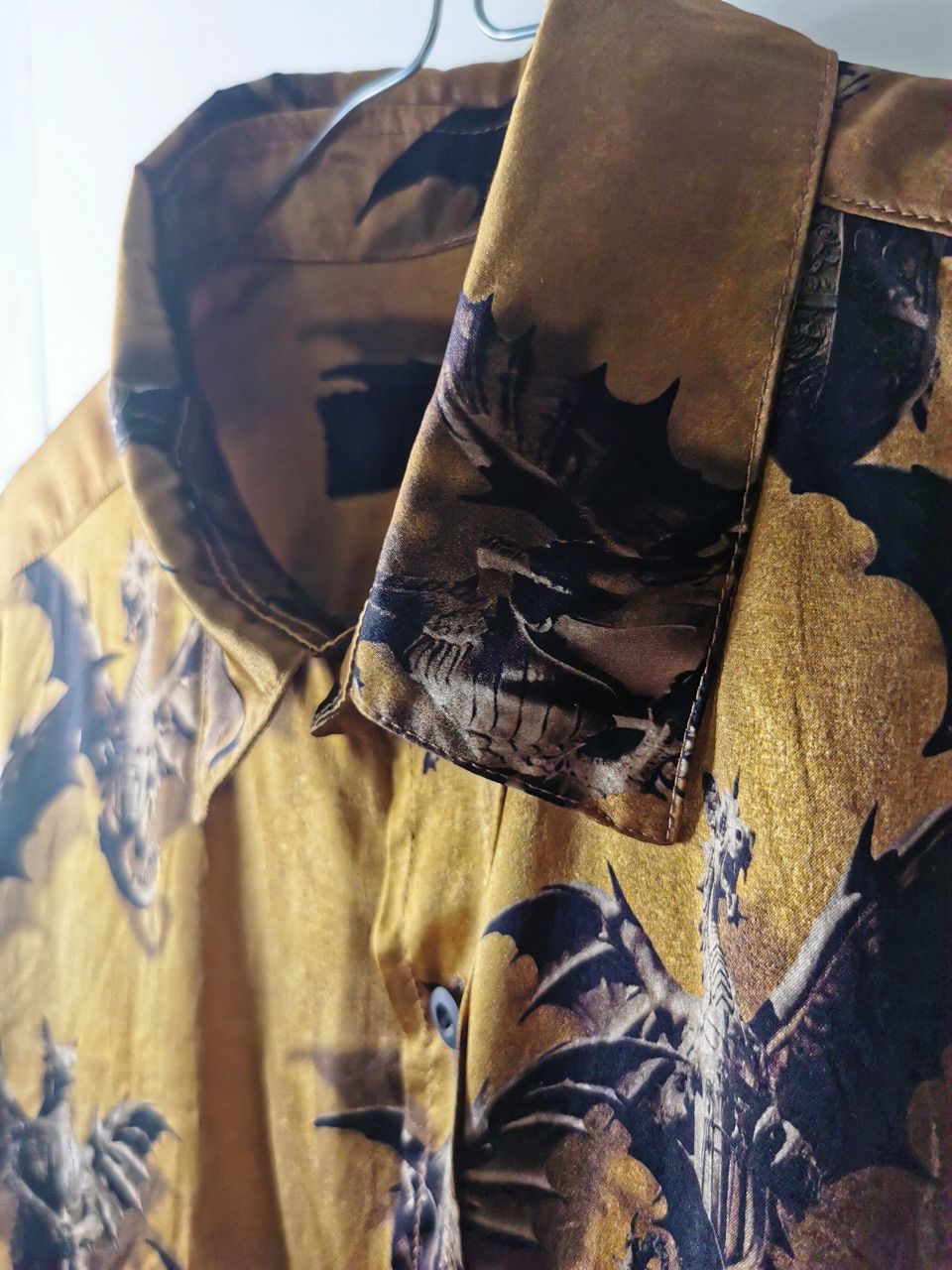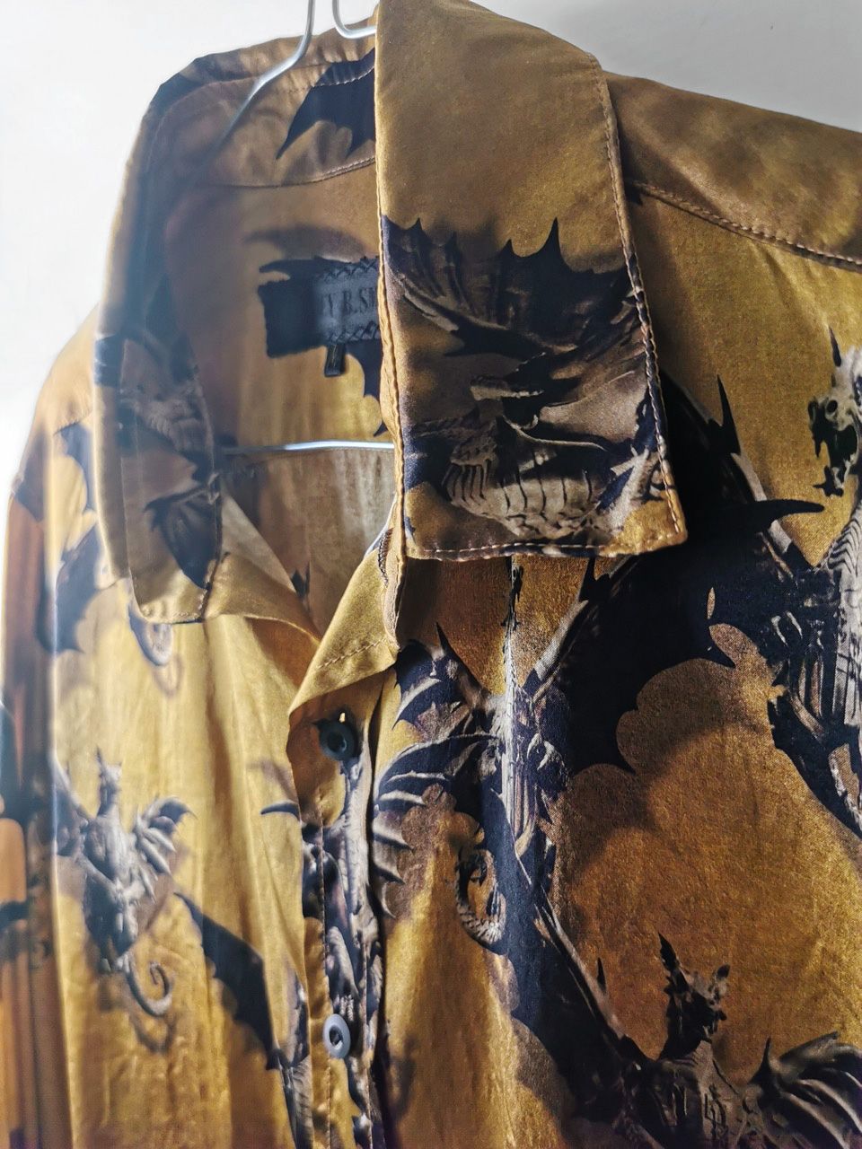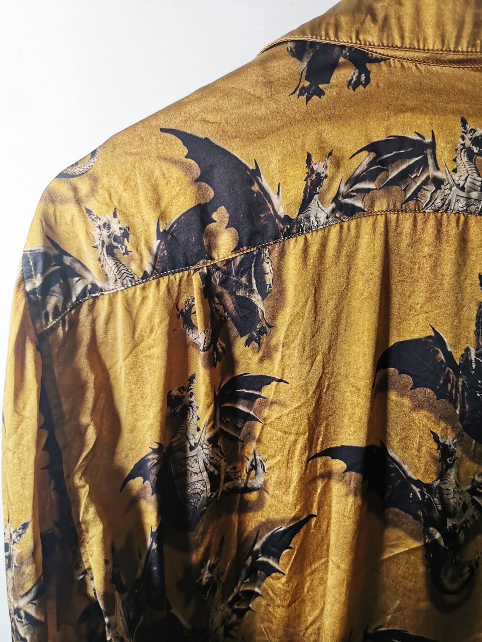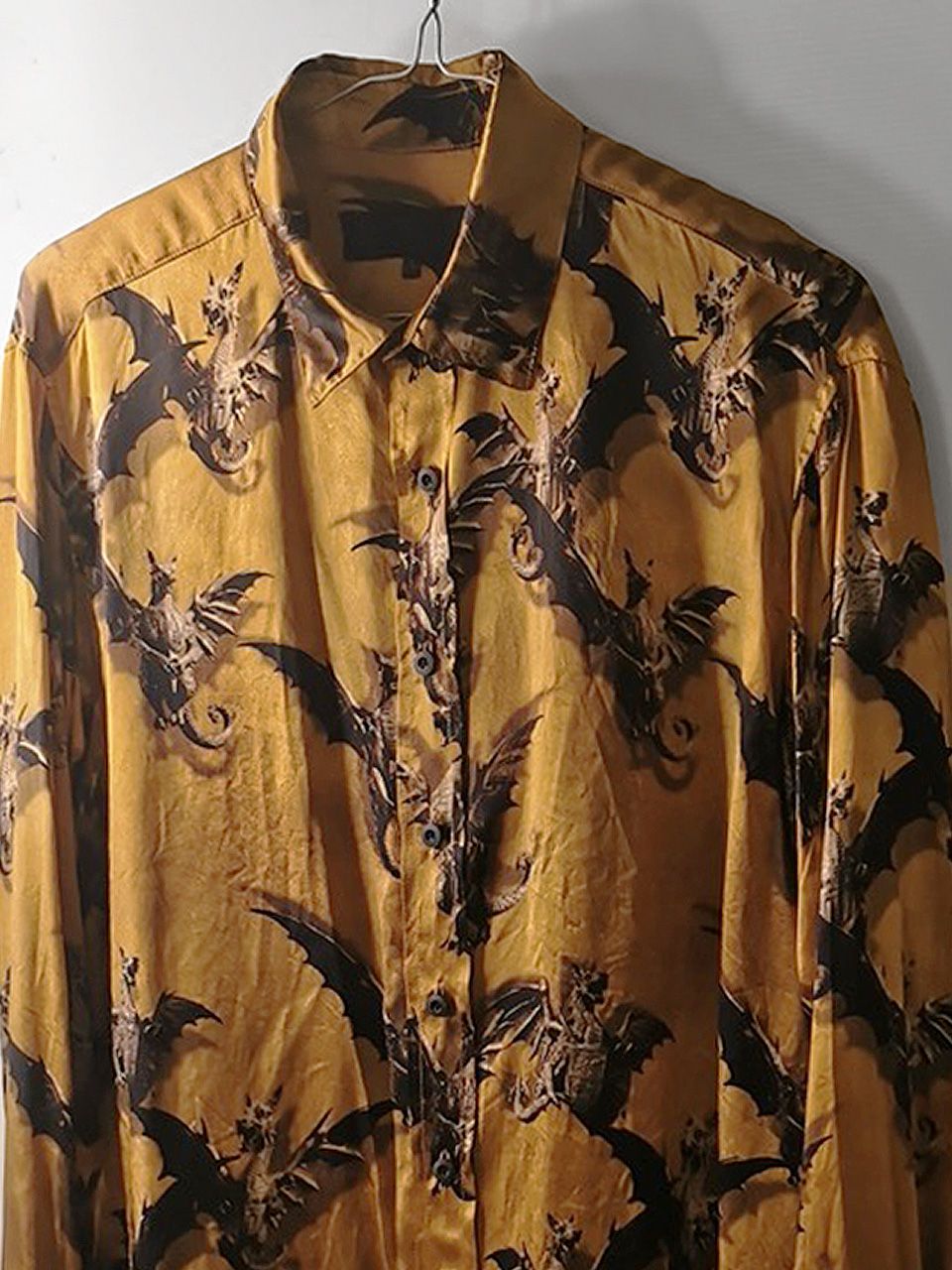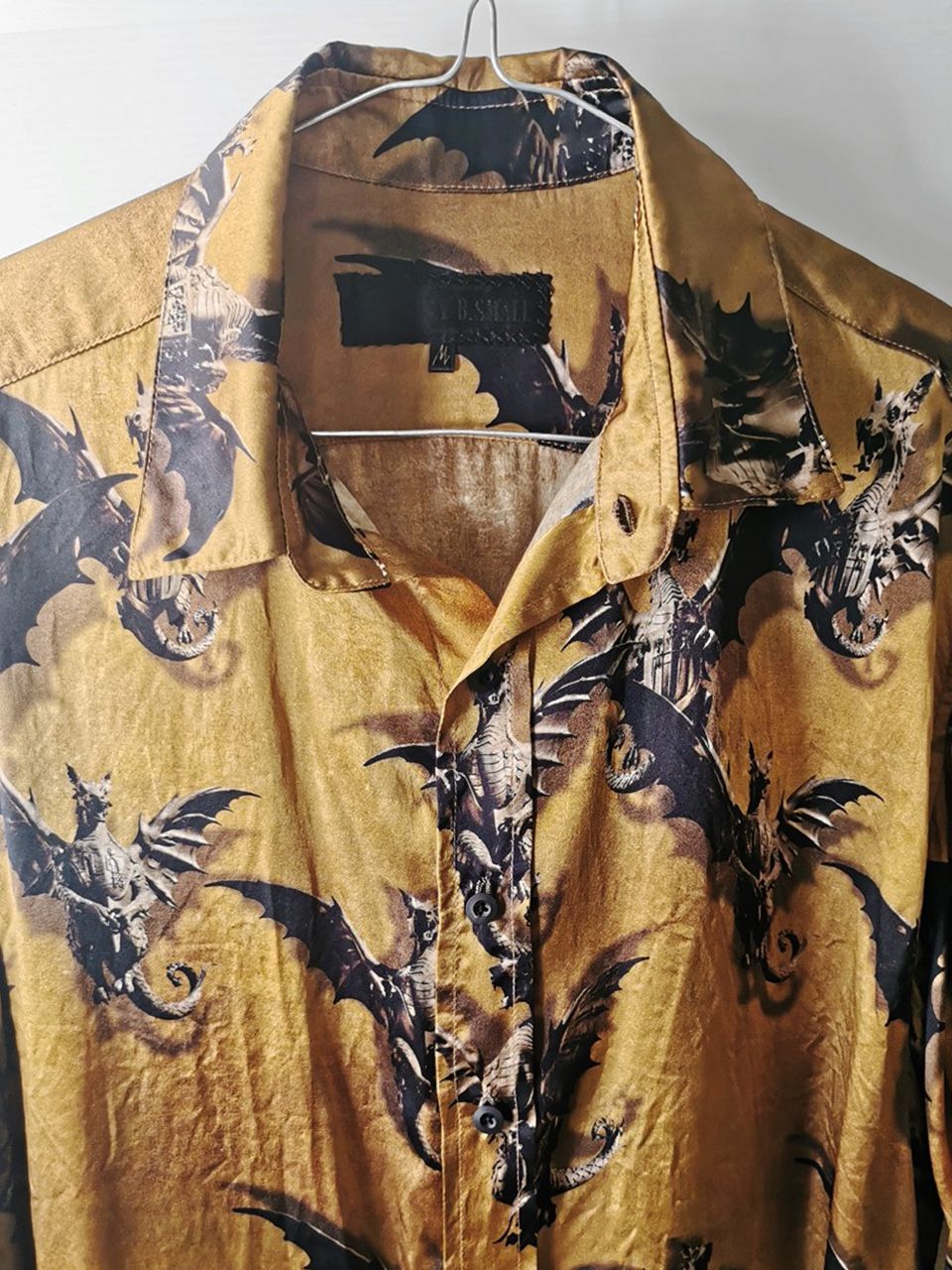 THIS special version of the super limited edition RNS12 shirt design is one of only 9 pieces of its kind made by hand in the entire world from a classic European cut tailored shirt pattern from our extensive tailoring research and cut using a luxurious pure silk 16-momme raso satin exclusive Darklands Berlin “Gryphons” print design developed by Estefania Campillo, and made only for us by the legendary Brenna family in Como, Italy--the world’s leading center for fine silk fabric creation--then specially washed and treated by hand in our world-famous GBS Superworkrooms at Cavarzere Venezia for extra aging, shaping, drape and softness. The design features an impeccable classic European tailored men’s shirt cut and design, expert single-needle stitching throughout, beautifully clean-finished all French-seamed interior construction, uniquely balanced cut, fit and design, extraordinary real horn shirt shirt button designs made for us by the world's greatest living buttonmakers--Claudio and Cinzia Fontana in Parma, Italy; and no less than 12 of our signature real hand sewn buttonholes in pure silk Bozzolo Milano Seta Reale threads, each one required 10-12 minutes to cut and sew (over 2 hours of painstaking expert work just to make the buttonholes alone for a single shirt). The piece also features our world leading hand dyed pure silk label created exclusively for us by Mion SpA in Torreglia which is the first label in the luxury industry to completely eliminate plastic polyester yarns in it--beautifully attached entirely by hand with pure silk threads.