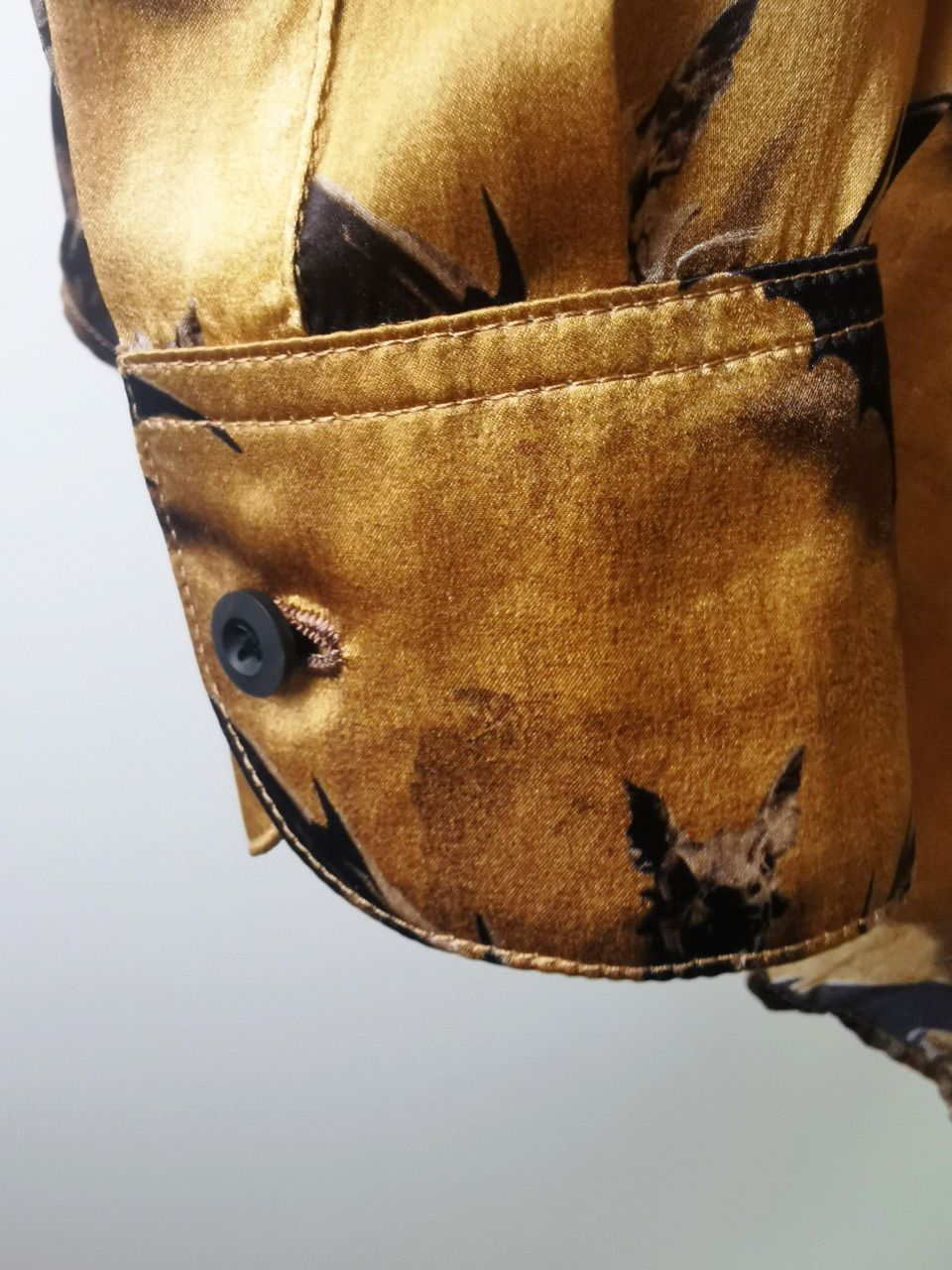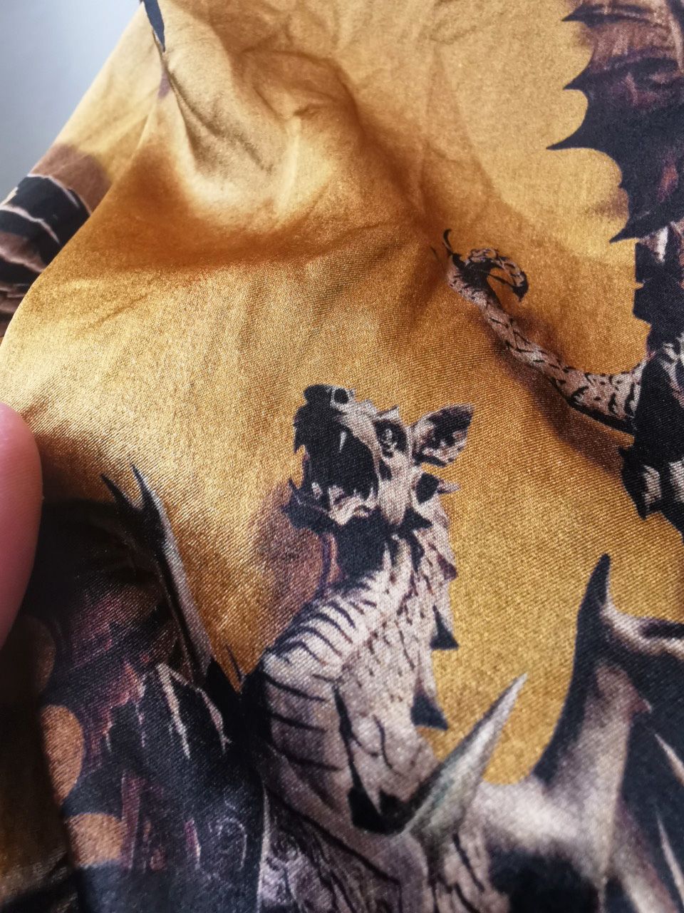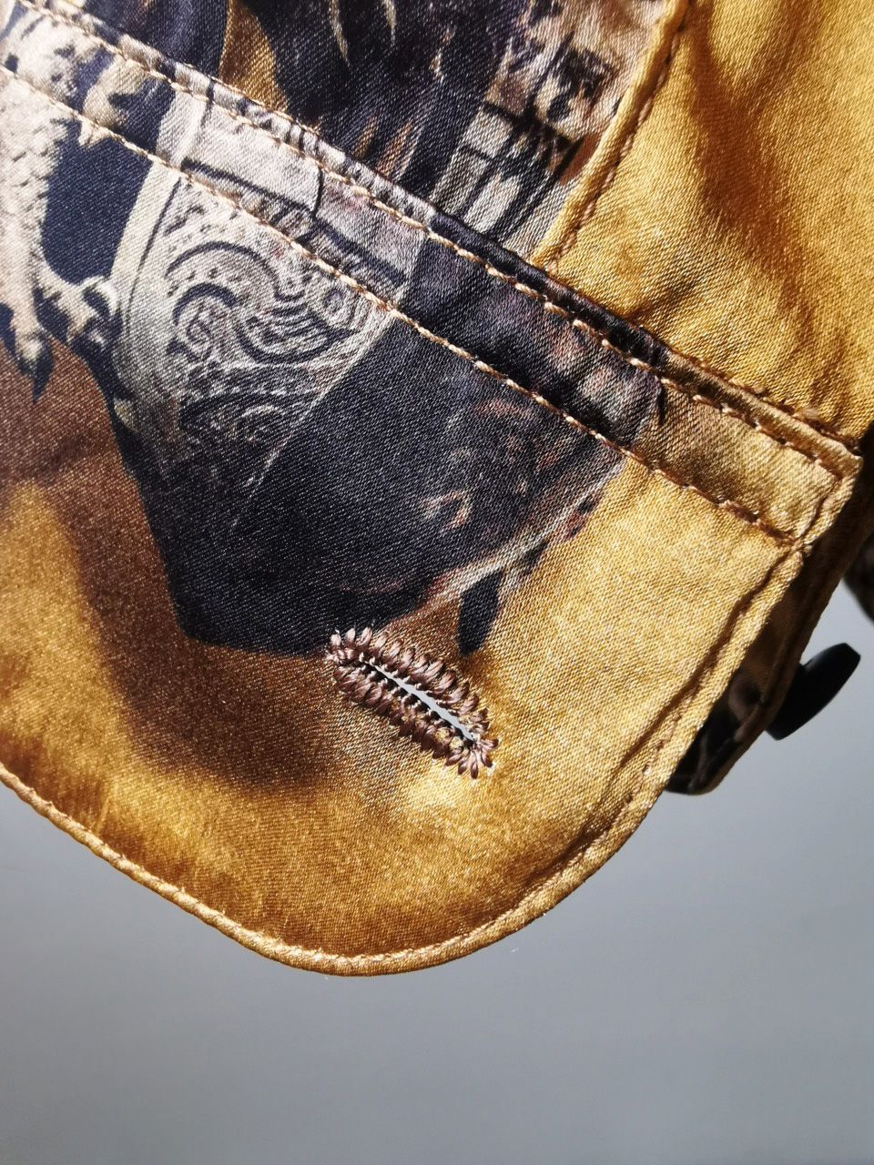 ...and cut using a luxurious pure silk 16-momme raso satin exclusive Darklands Berlin “Gryphons” print design developed by Estefania Campillo, and made only for us by the legendary Brenna family in Como, Italy--the world’s leading center for fine silk fabric creation--then specially washed and treated by hand in our world-famous GBS Superworkrooms at Cavarzere Venezia for extra aging, shaping, drape and softness...