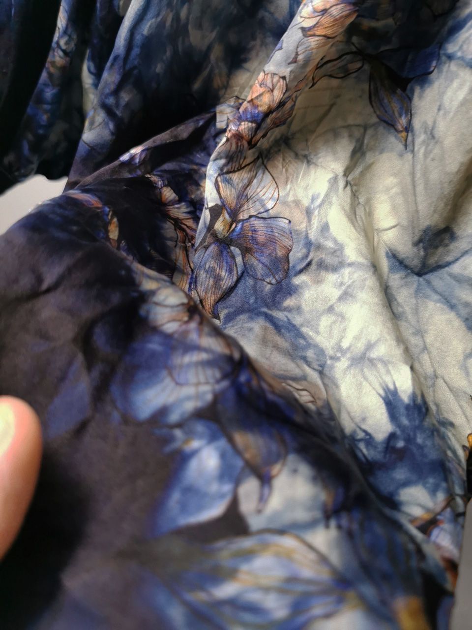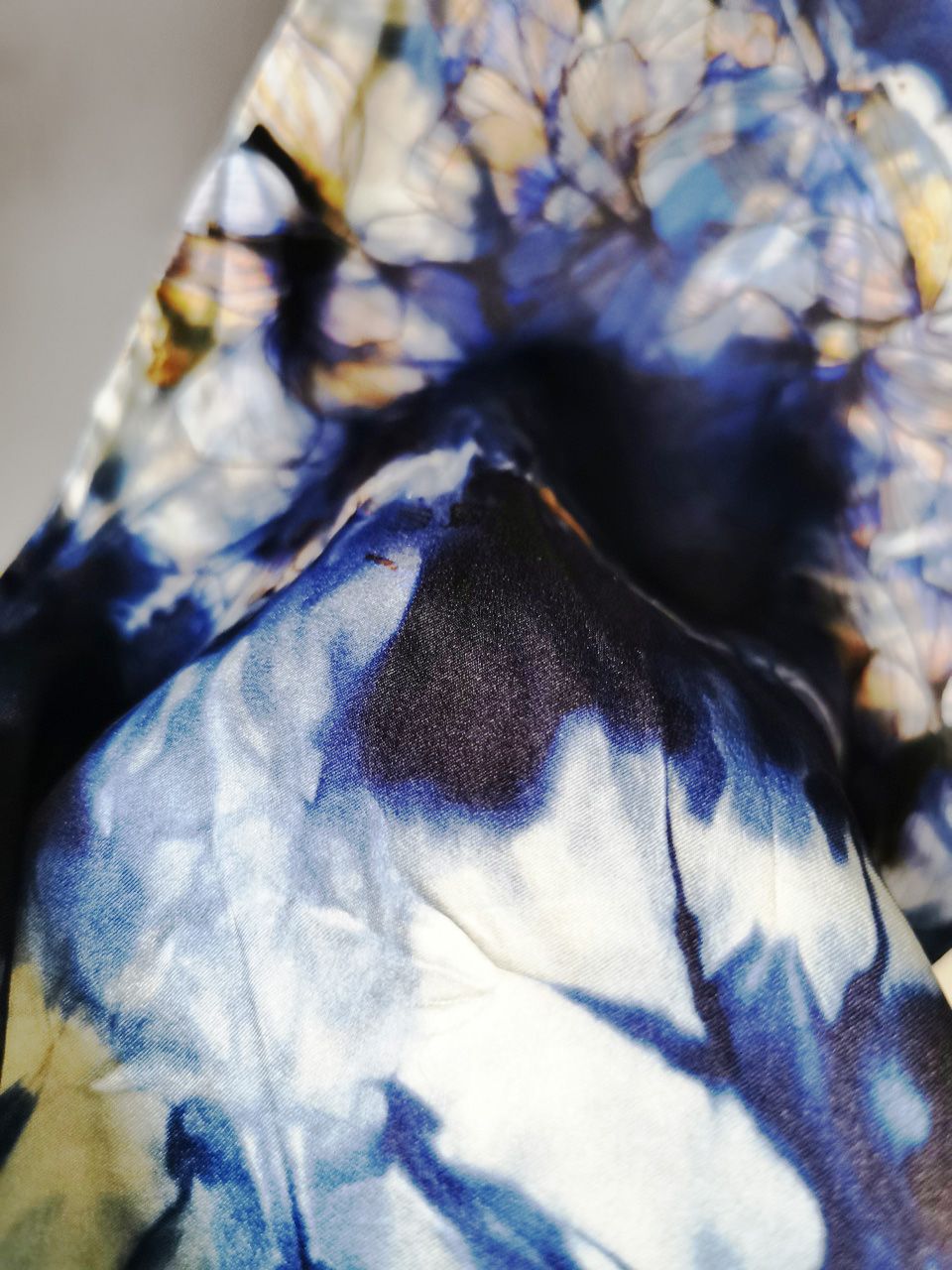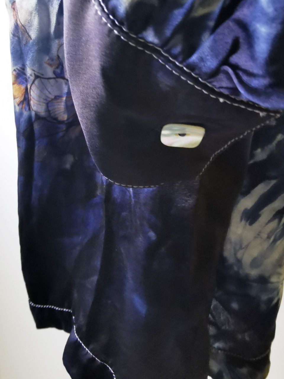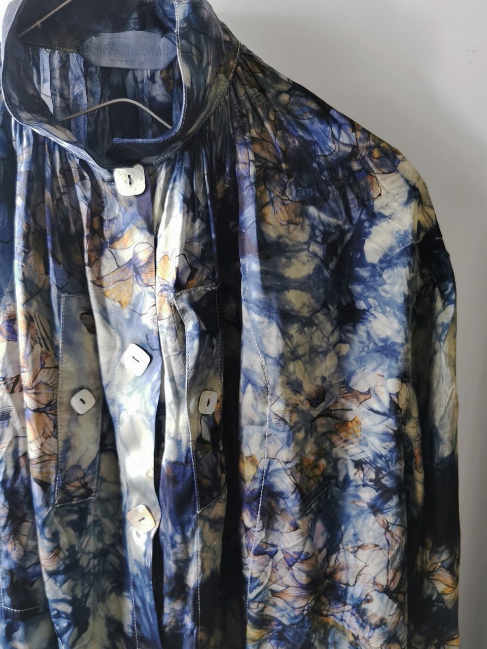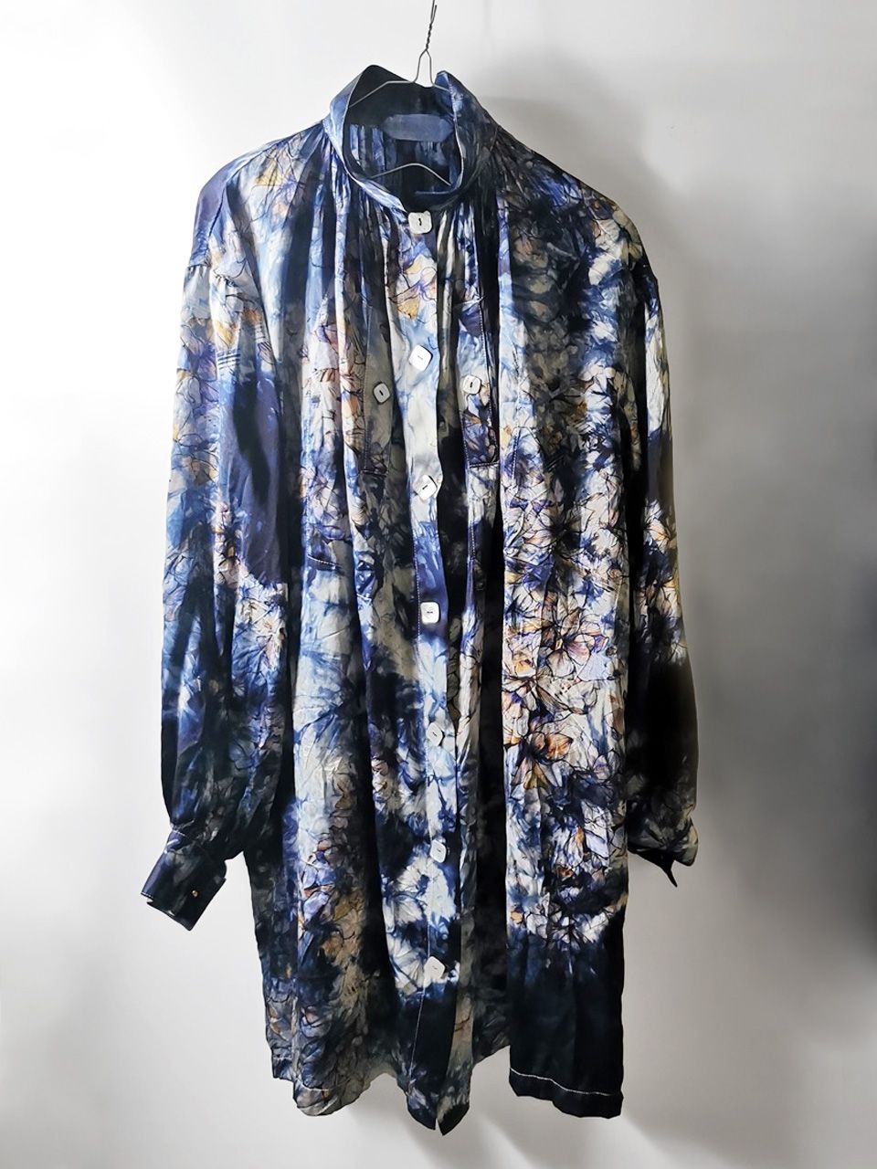 This special version of the super limited edition SEWD01 dress design is one of only 2 pieces of its kind made by hand in the entire world, each exclusively for T.O in Kochi, Japan from our antique 19th century tailored French prairie dress pattern, from our extensive tailoring research and cut using a pure silk 16 momme raso satin exclusive floral print design made for us by the Giordano family in Como Italy, the world's leading region for fine silk fabric creation, then individually hand dyed in our world famous GBS Superworkrooms at Cavarzere Venezia with our advanced extreme artisanal “accident dye” technique that uniquely renders its exceptional uneven colors, mottled patina effects and incredible softness. The design also features button-down welt pockets at the chest, amazing large rectangular shaped real mother-of-pearl button designs created exclusively for us by the world’s greatest living buttonmakers—Claudio and Cinzia Fontana in Parma, and no less than 11 of our signature real hand stitched buttonholes (that required 10-12 minutes to cut and sew each one, over 2 hours of expert and painstaking work on buttonholes and buttons for the single dress) in pure silk Bozzolo Reale Seta Milan threads. The piece also features our world leading pure silk hand dyed label created exclusively for us by Mion SpA in Torreglia which is the first label in the luxury industry to completely eliminate plastic polyester yarns in it– beautifully attached all by hand using pure silk threads. Variations in color and color density are not imperfections or irregularities, but specific characteristics of the special hand washing technique.
