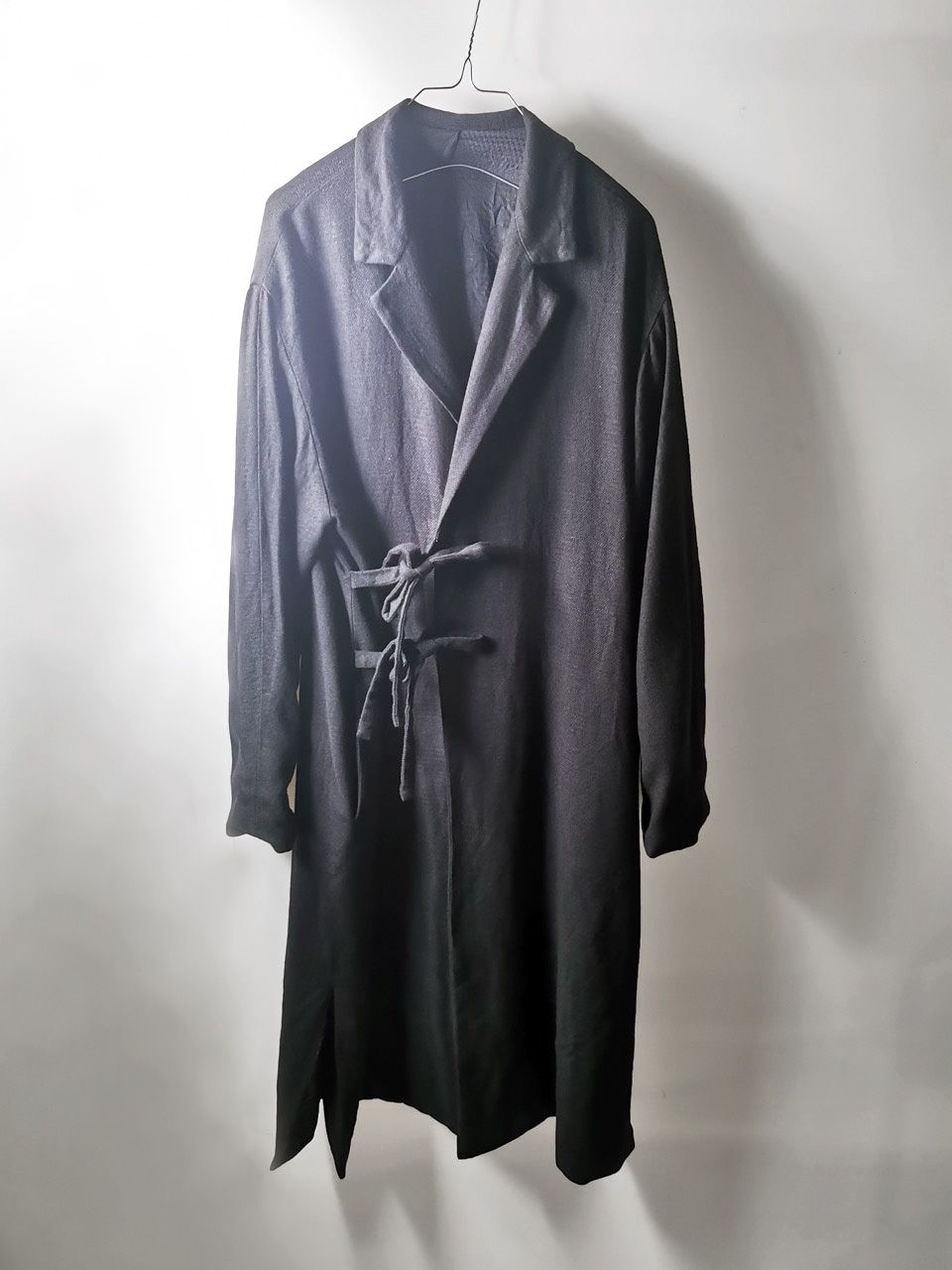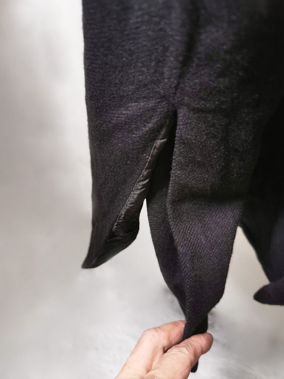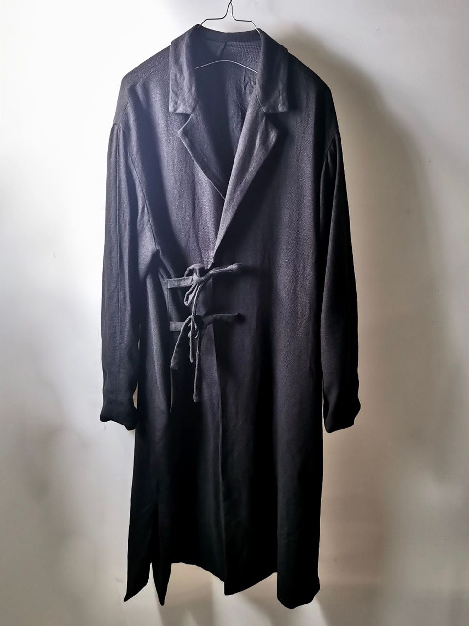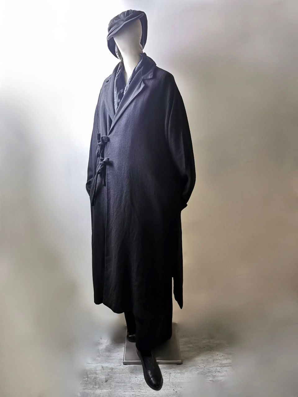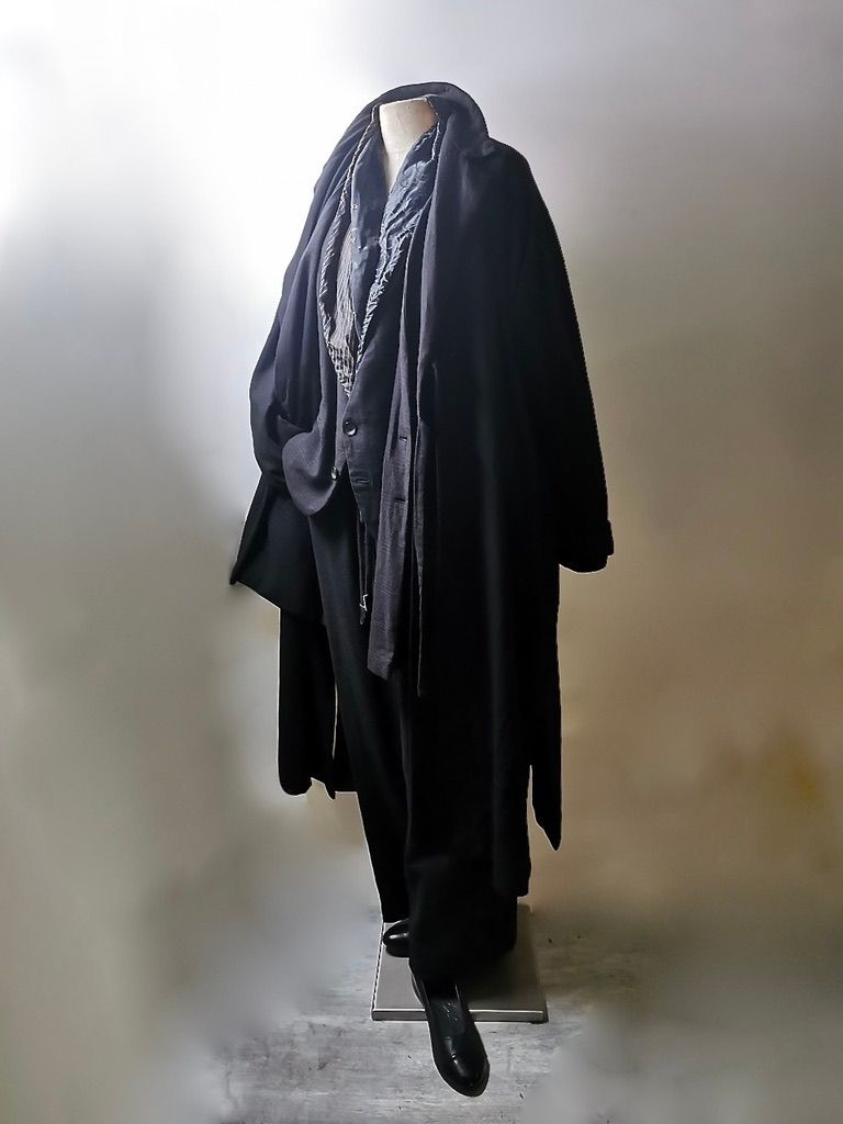 THIS special version of the reversible “2-in-1” super limited edition TNJ08 special hand-made long relaxed-living jacket design is one of only 3 pieces created in the entire world, each exclusively for Eth0s in Shanghai from our original modified kimono pattern from our “That’s Not the Way I Remember It” 2014 Paris Collection’s extensive tailoring research, and cut using a superlux pure Alashan wollenspun cashmere suiting cloth woven only for us by the oldest still operating woolen mill in the world and the world’s most respected cashmere fabric makers--Fratelli Piacenza 1733 in Pollone, Biella, Italy-- combined with a special lining patchwork composition story of luxury viscosa jacquard houndstooth woven by Ezio Ghiringhelli in Varese and yarn dyed stripe weave and pure cupro Bemberg-type sleeve lining fabrics woven by Tessitura Mauri in Como—then specially multiple hand-dyed, washed and treated in our world-famous GBS Superworkrooms at Cavarzere Venezia using a series of processes that required over 16 hours of master work to achieve its special uneven colors, patina effects, shaping, and incredible softness and drape. The design features a reversible 2-in-1 design concept use for extra investment value, double in the seam tailored pockets on both inside and outside, special double ties that can be tied and worn in a variety of different ways, and is handsigned and numbered by the designer. The piece also features our world leading pure silk hand dyed label created exclusively for us by Mion SpA in Torreglia which is the first label in the luxury industry to completely eliminate plastic polyester yarns in it--beautifully attached entirely by hand using pure silk threads. Variations in color and color density are not imperfections or irregularities, but specific characteristics of the special fabric, hand dyeing processes, and hand making technique.