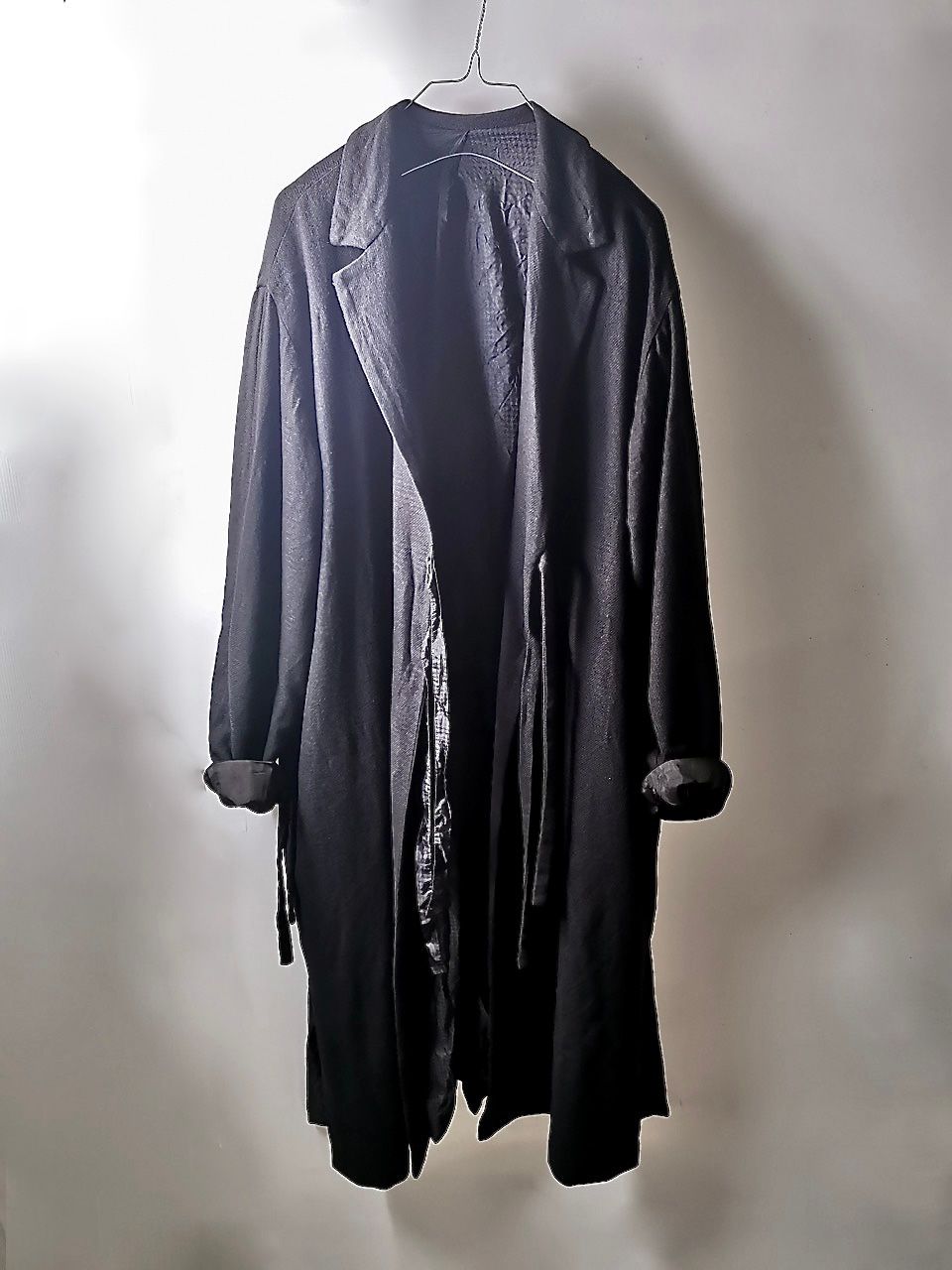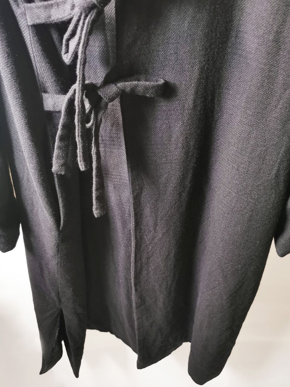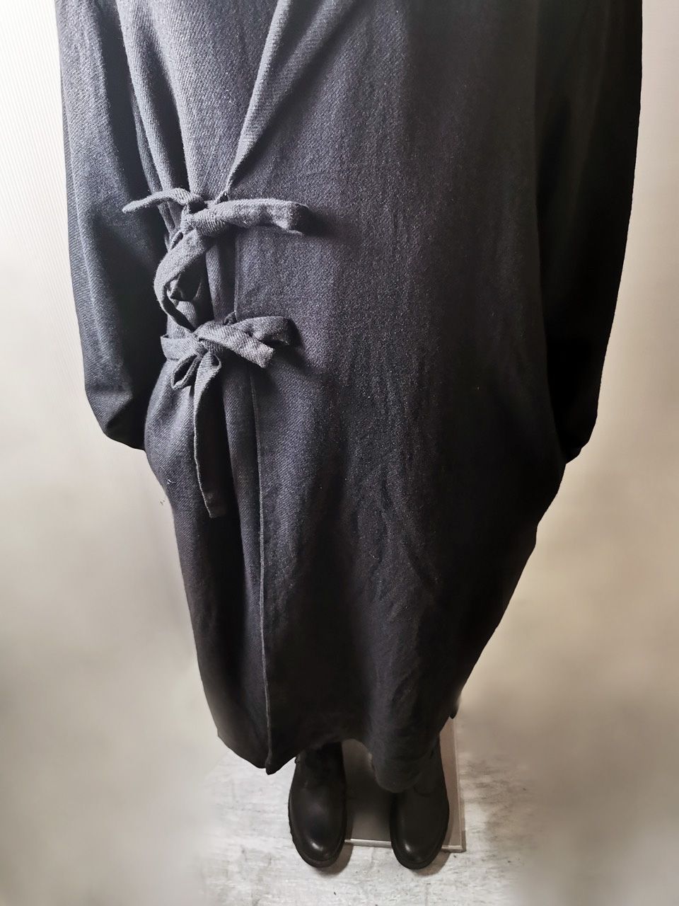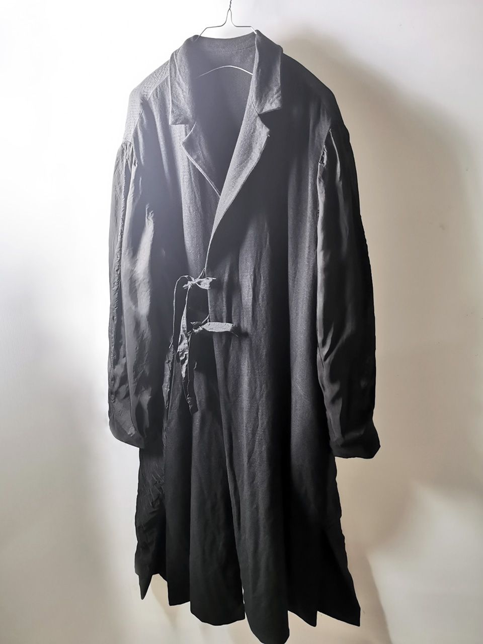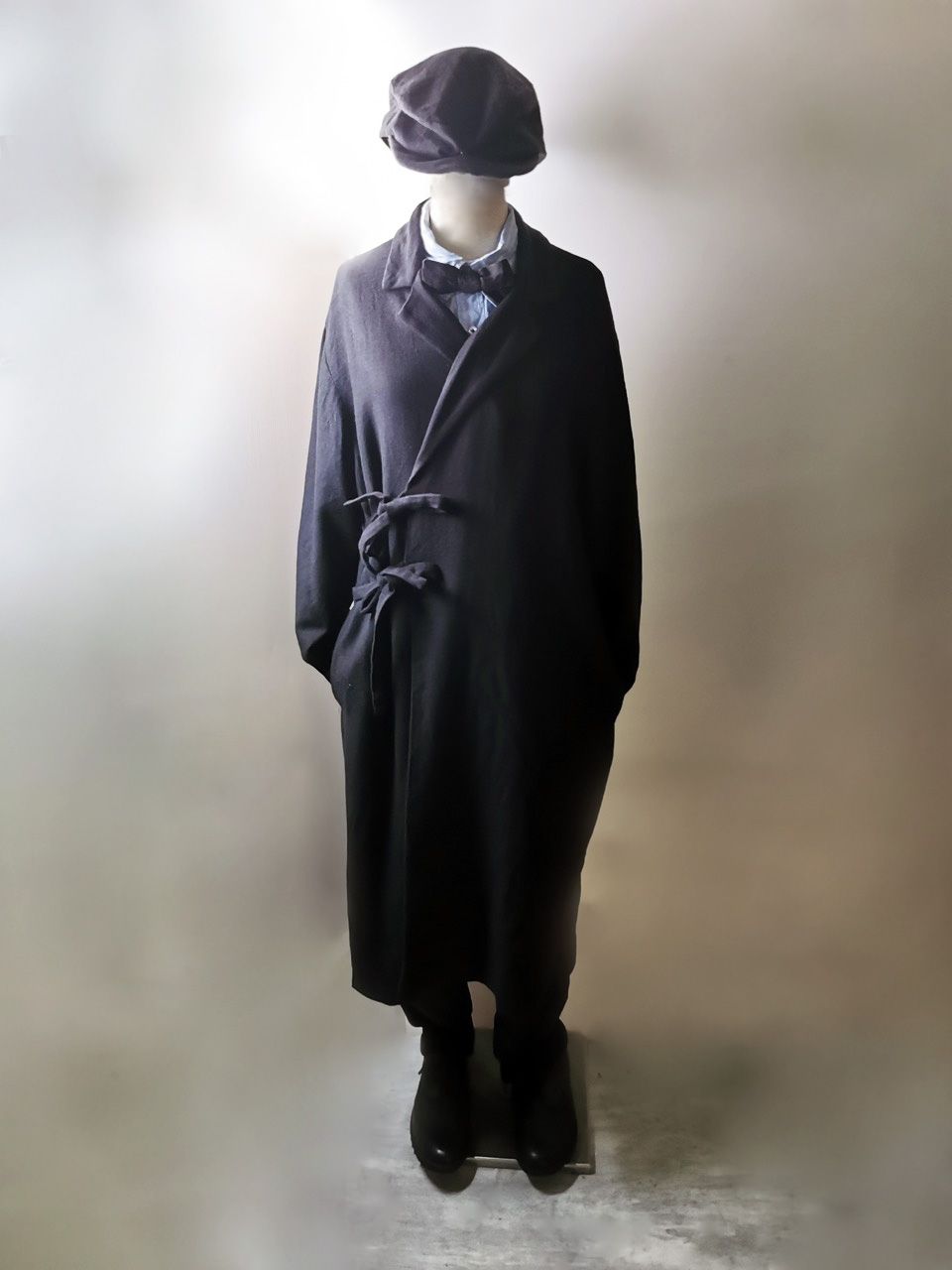 THIS special version of the reversible “2-in-1” super limited edition TNJ08 special hand-made long relaxed-living jacket design is one of only 3 pieces created in the entire world, each exclusively for Eth0s in Shanghai from our original modified kimono pattern from our “That’s Not the Way I Remember It” 2014 Paris Collection’s extensive tailoring research, and cut using a superlux pure Alashan wollenspun cashmere suiting cloth woven only for us by the oldest still operating woolen mill in the world and the world’s most respected cashmere fabric makers--Fratelli Piacenza 1733 in Pollone, Biella, Italy-- combined with a special lining patchwork composition story of luxury viscosa jacquard houndstooth woven by Ezio Ghiringhelli in Varese and yarn dyed stripe weave and pure cupro Bemberg-type sleeve lining fabrics woven by Tessitura Mauri in Como—then specially multiple hand-dyed, washed and treated in our world-famous GBS Superworkrooms at Cavarzere Venezia using a series of processes that required over 16 hours of master work to achieve its special uneven colors, patina effects, shaping, and incredible softness and drape. The design features a reversible 2-in-1 design concept use for extra investment value, double in the seam tailored pockets on both inside and outside, special double ties that can be tied and worn in a variety of different ways, and is handsigned and numbered by the designer. The piece also features our world leading pure silk hand dyed label created exclusively for us by Mion SpA in Torreglia which is the first label in the luxury industry to completely eliminate plastic polyester yarns in it--beautifully attached entirely by hand using pure silk threads. Variations in color and color density are not imperfections or irregularities, but specific characteristics of the special fabric, hand dyeing processes, and hand making technique.