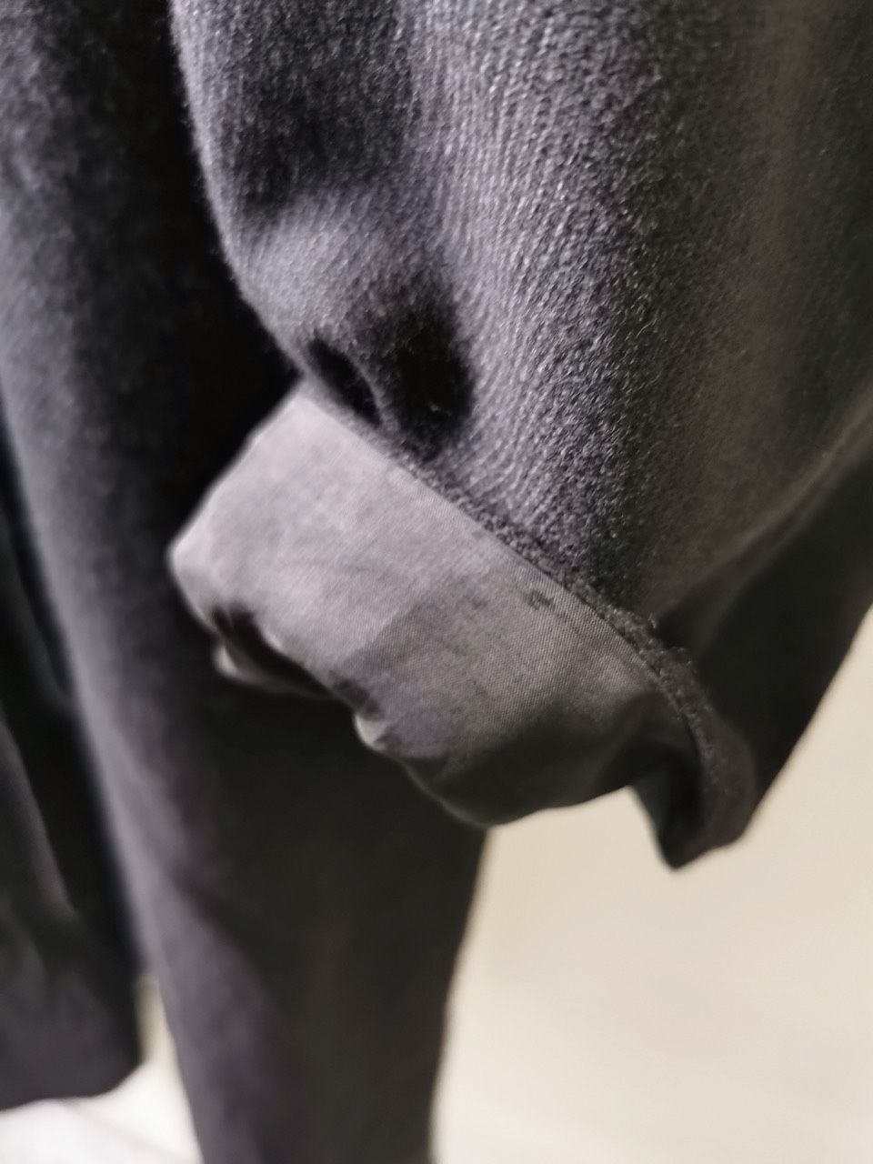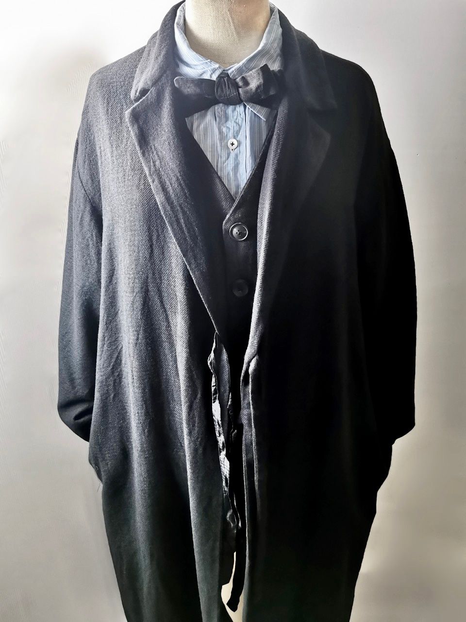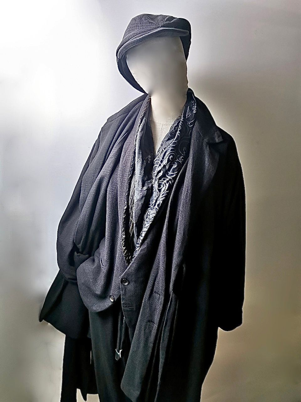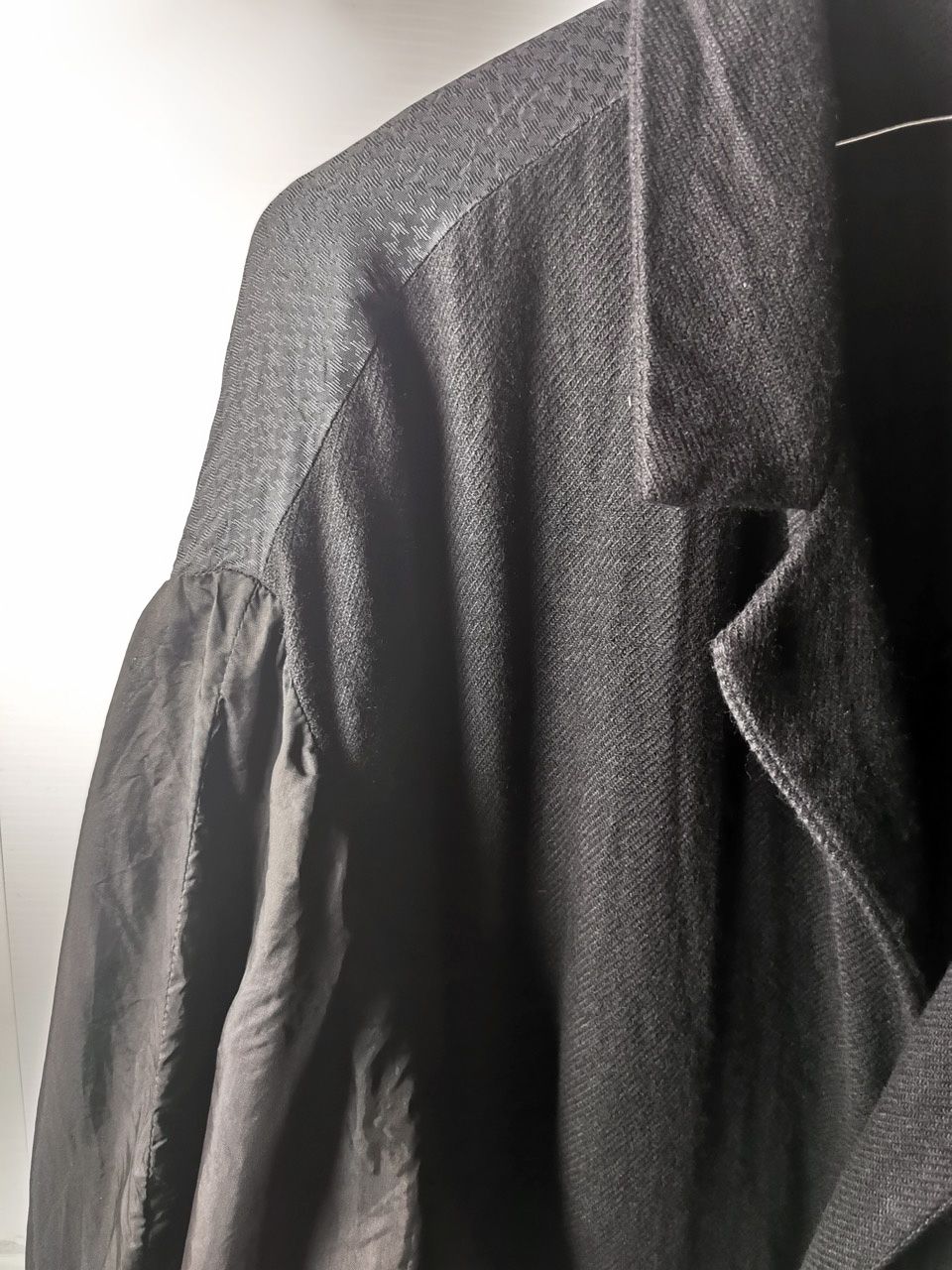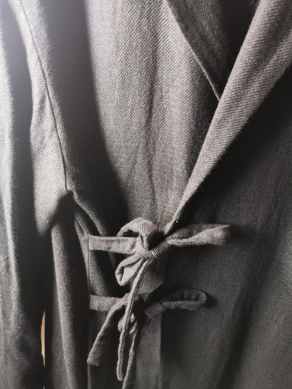 THIS special version of the reversible “2-in-1” super limited edition TNJ08 special hand-made long relaxed-living jacket design is one of only 3 pieces created in the entire world, each exclusively for Eth0s in Shanghai from our original modified kimono pattern from our “That’s Not the Way I Remember It” 2014 Paris Collection’s extensive tailoring research, and cut using a superlux pure Alashan wollenspun cashmere suiting cloth woven only for us by the oldest still operating woolen mill in the world and the world’s most respected cashmere fabric makers--Fratelli Piacenza 1733 in Pollone, Biella, Italy-- combined with a special lining patchwork composition story of luxury viscosa jacquard houndstooth woven by Ezio Ghiringhelli in Varese and yarn dyed stripe weave and pure cupro Bemberg-type sleeve lining fabrics woven by Tessitura Mauri in Como—then specially multiple hand-dyed, washed and treated in our world-famous GBS Superworkrooms at Cavarzere Venezia using a series of processes that required over 16 hours of master work to achieve its special uneven colors, patina effects, shaping, and incredible softness and drape. The design features a reversible 2-in-1 design concept use for extra investment value, double in the seam tailored pockets on both inside and outside, special double ties that can be tied and worn in a variety of different ways, and is handsigned and numbered by the designer. The piece also features our world leading pure silk hand dyed label created exclusively for us by Mion SpA in Torreglia which is the first label in the luxury industry to completely eliminate plastic polyester yarns in it--beautifully attached entirely by hand using pure silk threads. Variations in color and color density are not imperfections or irregularities, but specific characteristics of the special fabric, hand dyeing processes, and hand making technique.
