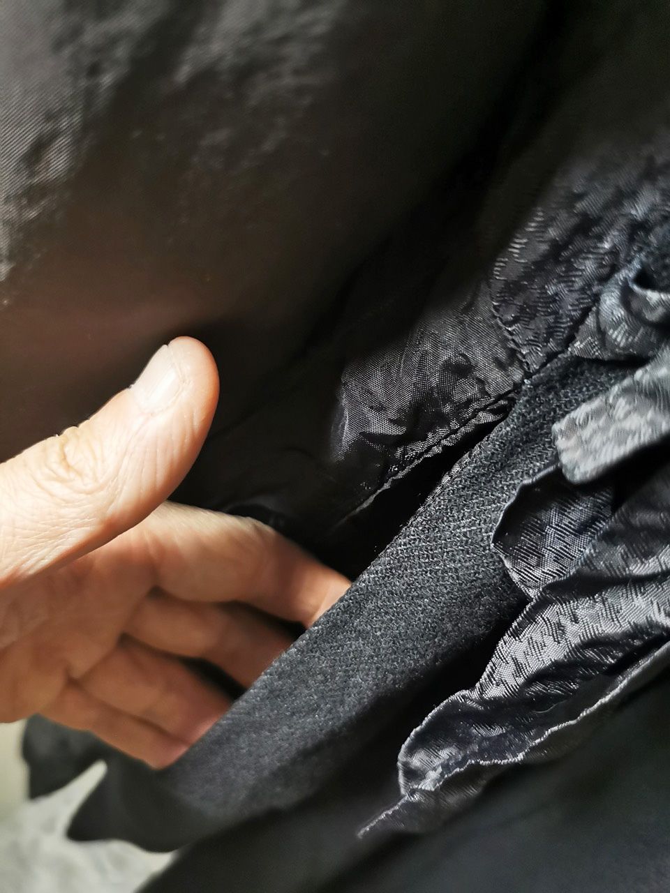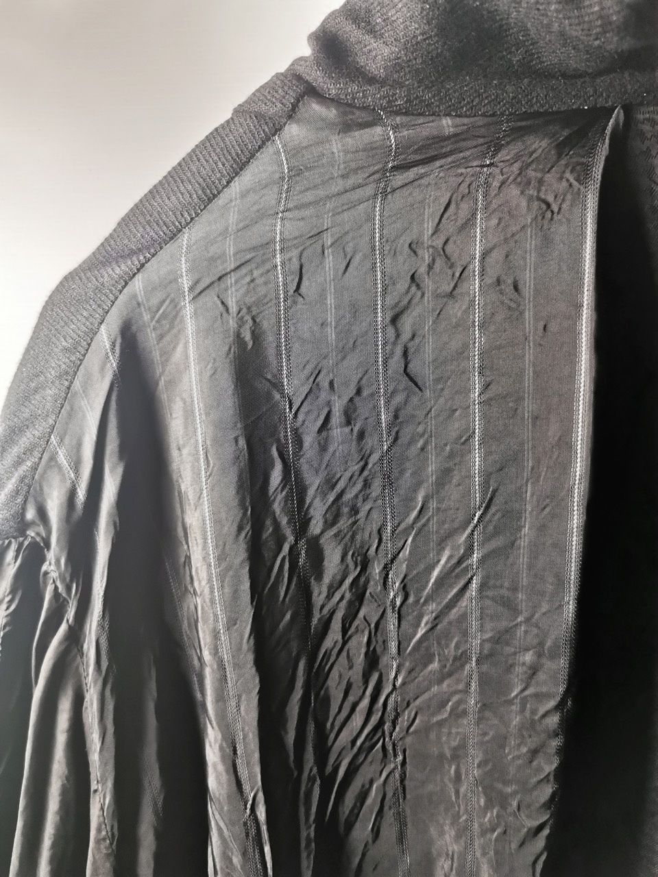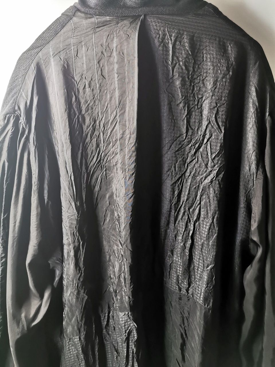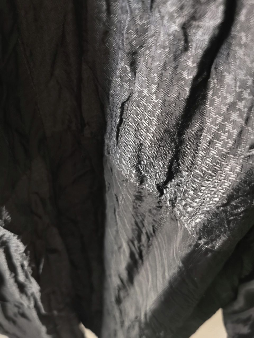 ...combined with a special lining patchwork composition story of luxury viscosa jacquard houndstooth woven by Ezio Ghiringhelli in Varese and yarn dyed stripe weave and pure cupro Bemberg-type sleeve lining fabrics woven by Tessitura Mauri in Como, then specially multiple hand-dyed, washed and treated in our world-famous GBS Superworkrooms at Cavarzere Venezia using a series of processes that required over 16 hours of master work to achieve its special uneven colors, patina effects, shaping, and incredible softness and drape.
