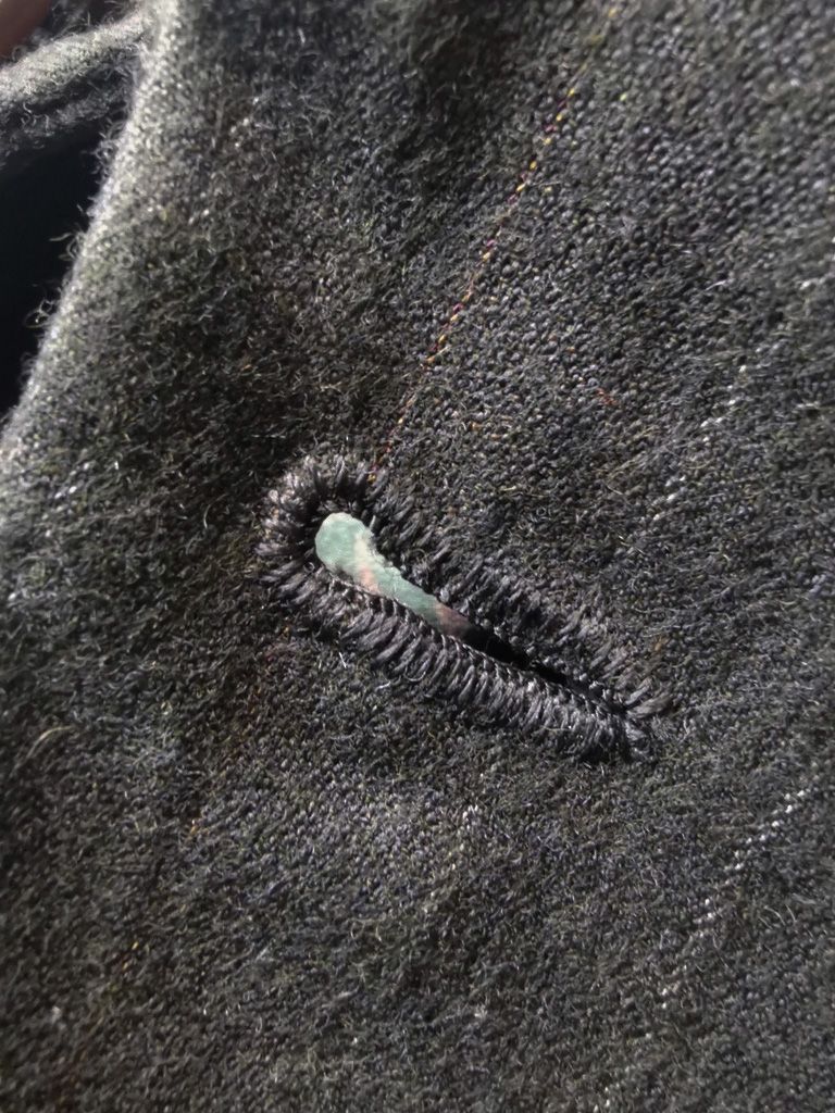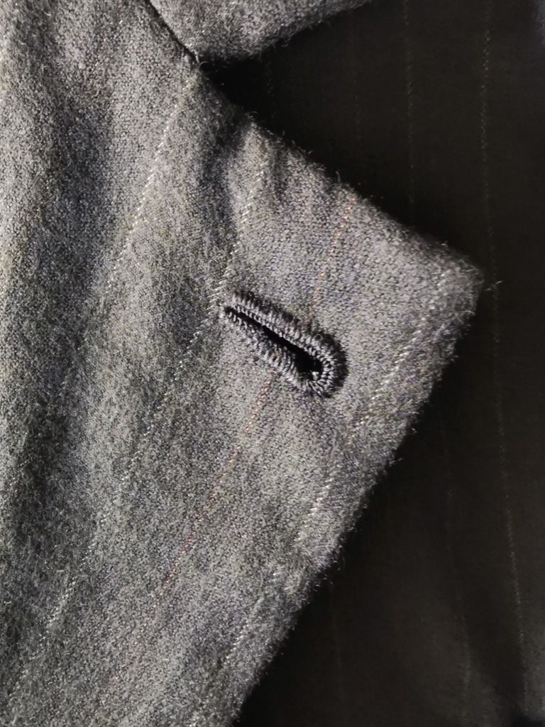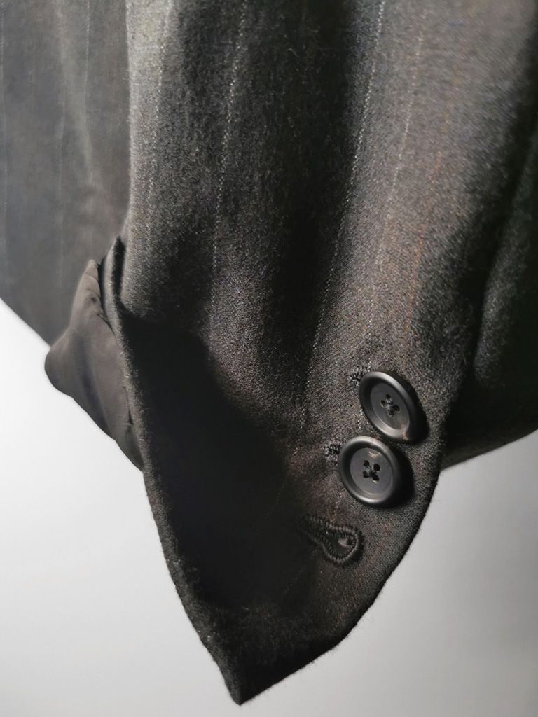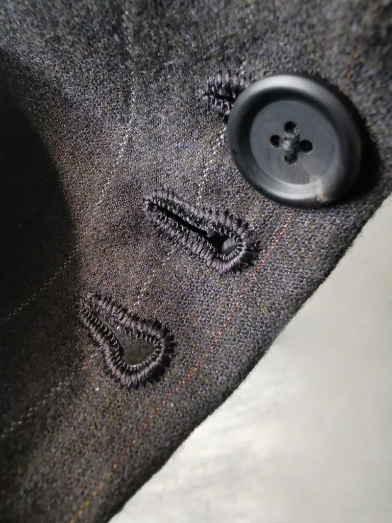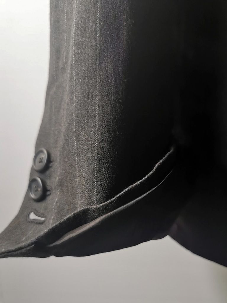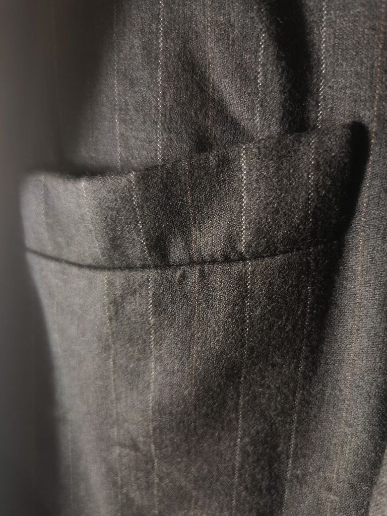 ...real working handmade surgeon's cuffs, hand-cut besom welt pockets (including a special exterior coin pocket) and tailored side vents, generous 2,5 centimeter seam allowances on major fitting seams that allow the jacket to be altered for long term wear and value, impeccably finished fully-lined interior...
