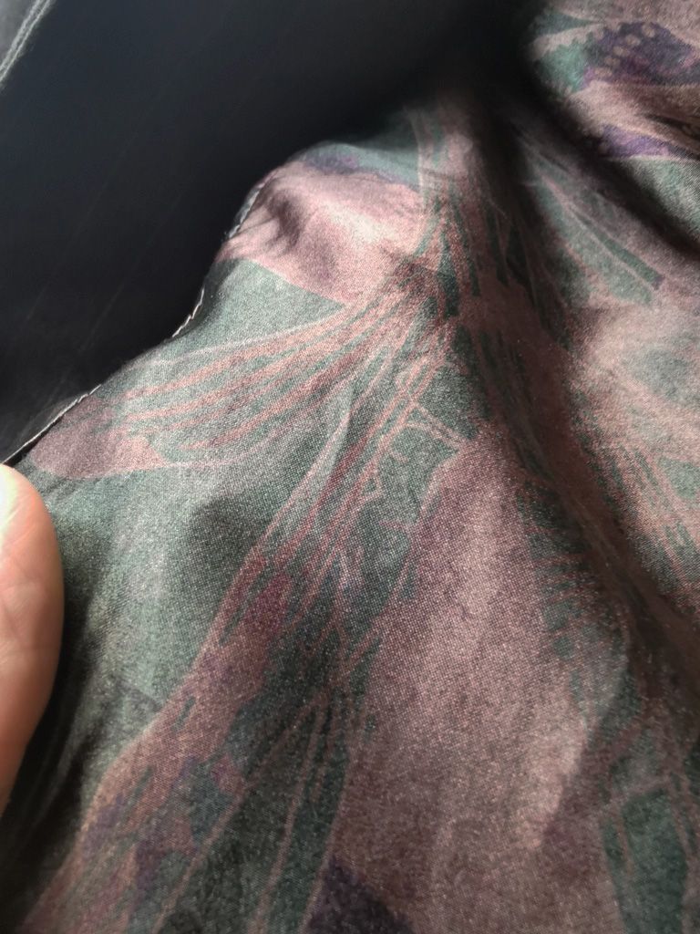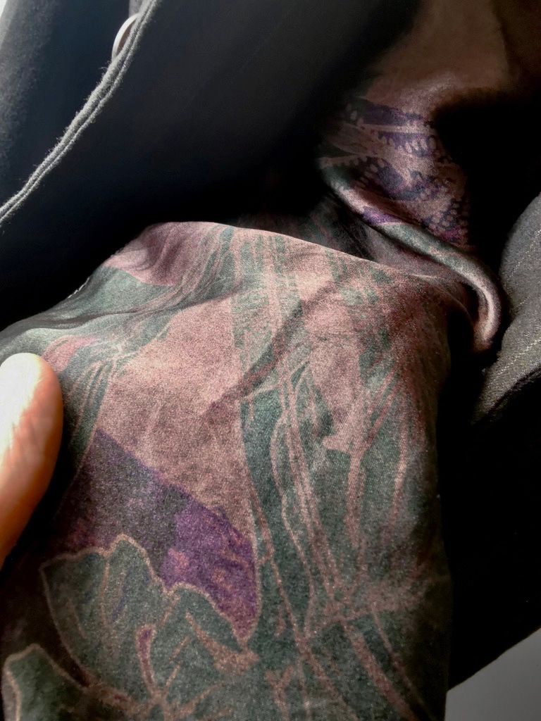 ...luxurious pure silk 16-momme raso satin exclusive floral print design created for us by the legendary Brenna family in Como, Italy--the world’s leading center for fine silk fabric creation--with luxury pure cupro Bemberg-type sleeve linings woven by Tessitura Mauri also in Como, then specially multiple hand dyed in our world-famous GBS Superworkrooms at Cavarzere Venezia using a series of processes that required over 17 hours of expert work to achieve its unique colors, patina effects, shaping and softness...
