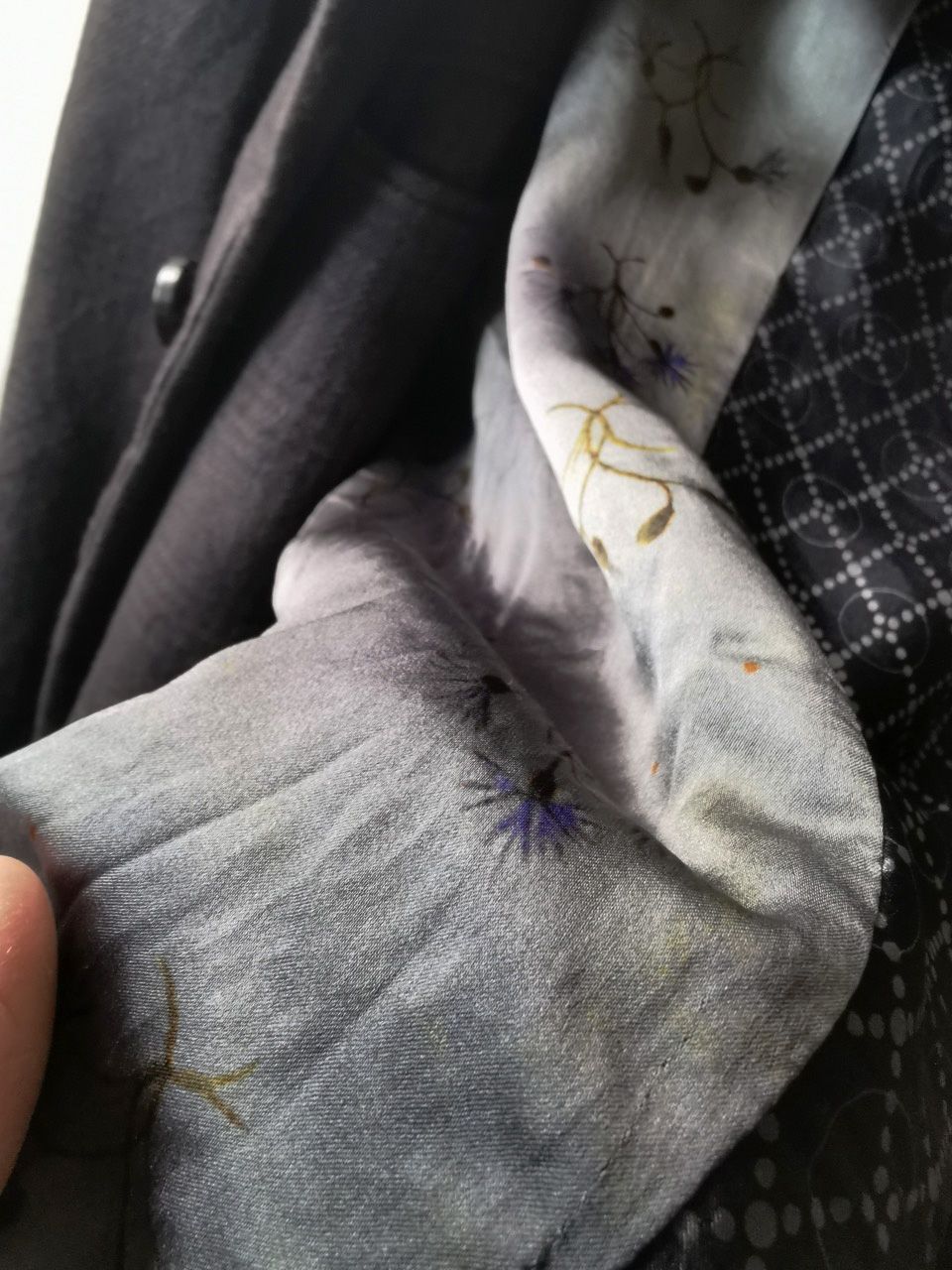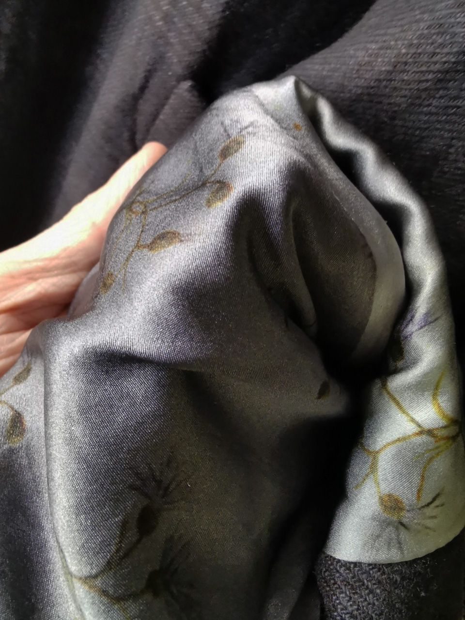 …combined with an exquisite pure silk 16 momme raso satin exclusive geometric and Botticelli floral print composition lining story made only for us by the legendary Brenna family in Como, Italy--the world's leading center for fine silk fabric creation...--then specially multiple hand-dyed, washed and treated in our world-famous GBS Superworkrooms at Cavarzere Venezia using a series of processes that required over 26 hours of master work to achieve its special uneven colors, patina effects, shaping, and incredible softness and drape.
