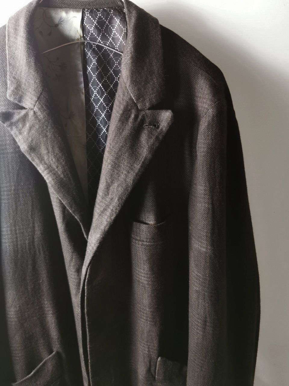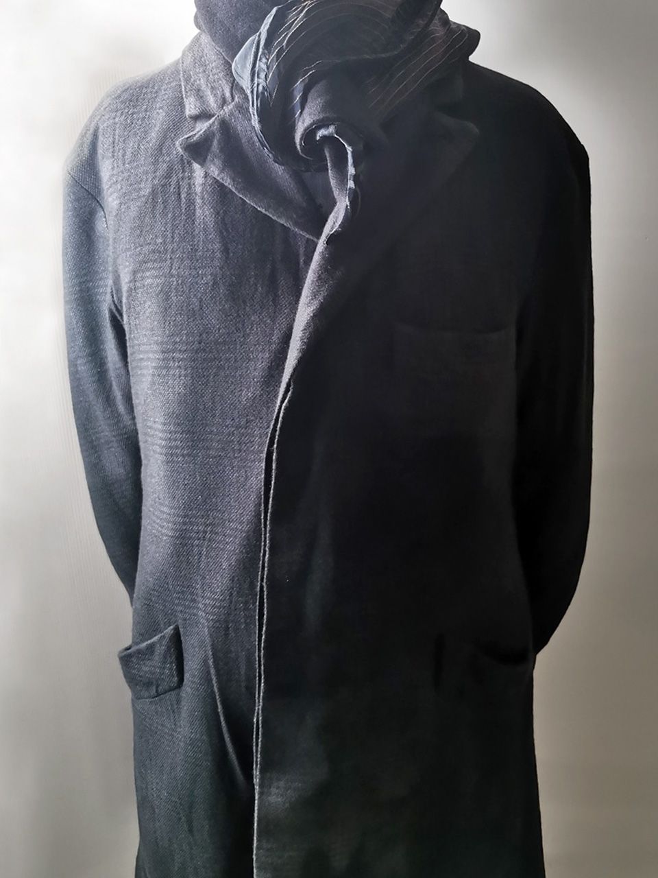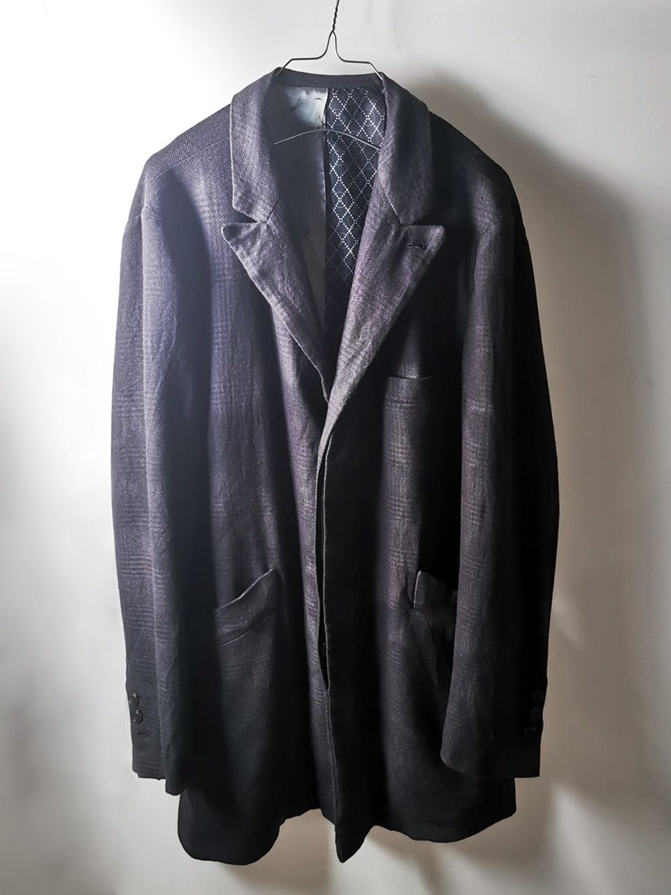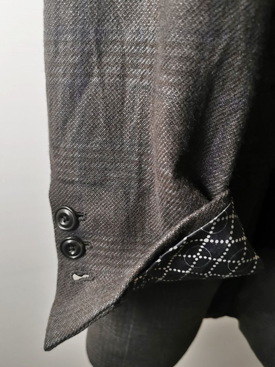 THIS special version of the super limited edition WSC02 hand made archive coat design jacket is one of only 3 pieces of its kind made by hand in the entire world, each created exclusively for Eth0s in Shanghai from our single-breasted peak-lapel fly-front 3-button coat pattern from our “Witness” 2015 Paris Collection’s extensive tailoring research, and cut using a superlux pure Alashan wollenspun cashmere suiting cloth woven only for us by the oldest still operating woolen mill in the world and the world’s most respected cashmere fabric makers--Fratelli Piacenza 1733 in Pollone, Biella, Italy--combined with an exquisite pure silk 16 momme raso satin exclusive geometric and Botticelli floral print composition lining story made only for us by the legendary Brenna family in Como, Italy--the world's leading center for fine silk fabric creation--then specially multiple hand-dyed, washed and treated in our world-famous GBS Superworkrooms at Cavarzere Venezia using a series of processes that required over 26 hours of master work to achieve its special uneven colors, patina effects, shaping, and incredible softness and drape. The design features impeccable invisible hand tailored fly-front silk-lined placket construction front, real handmade working buttonhole surgeon’s sleeve cuffs, impeccable handcut and constructed besom and welt pockets throughout--each fully self-lined in the precious Alashan wollenspun cashmere fabric for maximum hand comfort and durability, carefully cut and sewn expert matching plaid tailoring work, beautifully finished fully-lined interior construction with hand cut center back vent, generous 2,5 centimeter seam allowances on major fitting seams that allow the piece to be altered and let out for long term wear and service, all handsewn hemwork inside, an elegant button story with amazing deep-dished cross bottom button designs in real horn created only for us by the world’s greatest living buttonmakers--Claudio and Cinzia Fontana in Parma, Italy--and no less than 11 of our signature real hand stitched buttonholes (each one required 10-14 minutes to cut and sew) in luxurious pure silk Bozzolo Reale Milano Seta thread…and is handsigned and numbered by the designer. The piece also features our world leading pure silk label created exclusively for us by Mion SpA in Torreglia which is the first label in the luxury industry to completely eliminate plastic polyester yarns in it-- beautifully attached entirely by hand with pure silk threads. Variations in color and color density are not imperfections or irregularities, but specific characteristics of the special hand dyeing and hand making techniquePlease treat buttons and button-holes with care.
